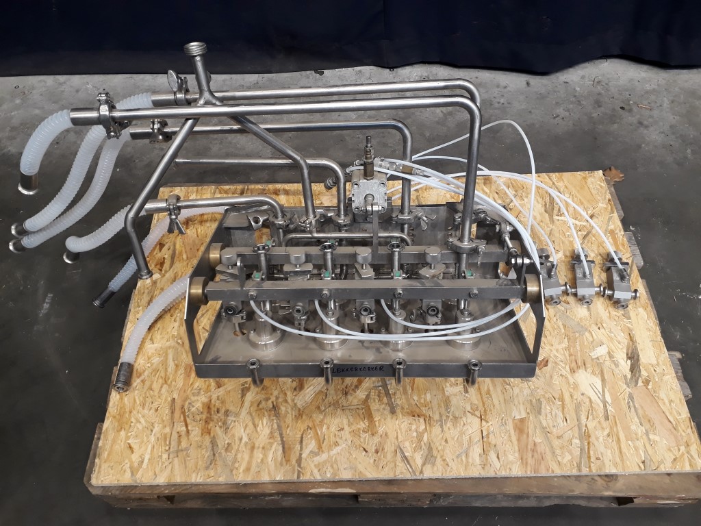 8x head filling nozzles (2x4) for tuft dosage with pneumatic valves, was mounted on a 4 line filler. (ampack) as predoser.