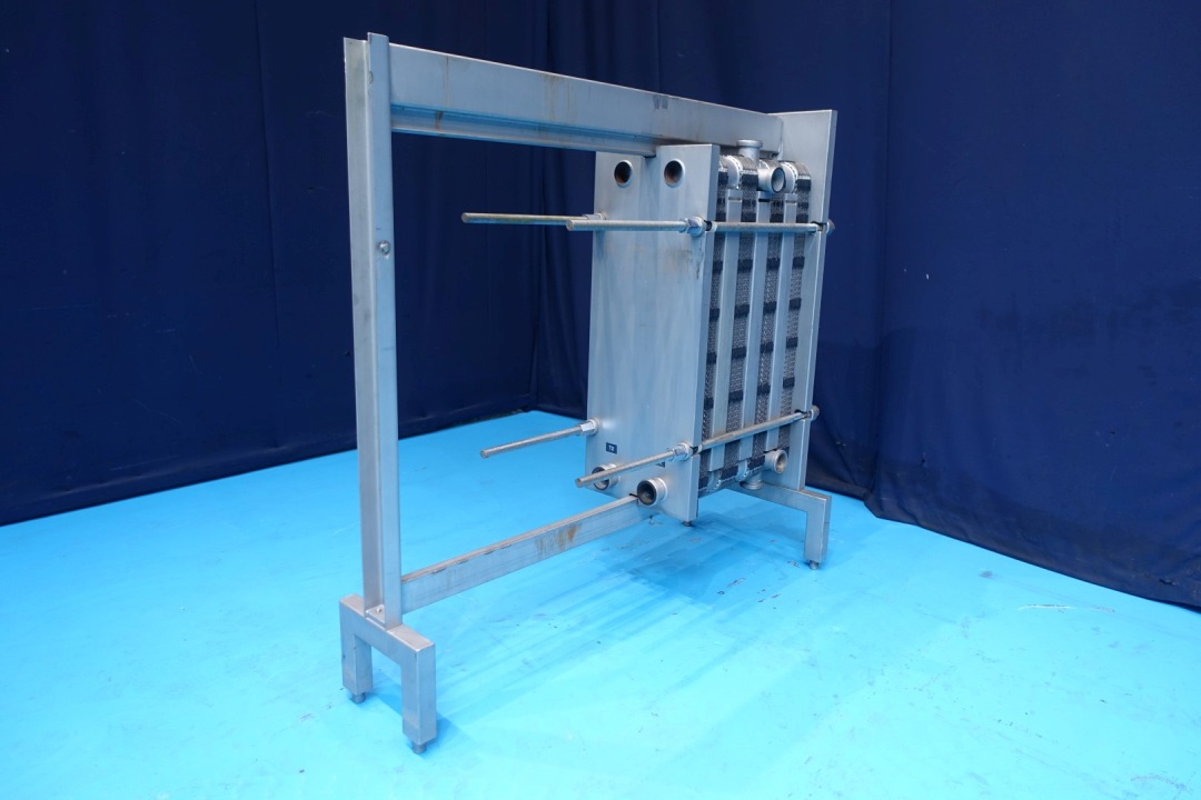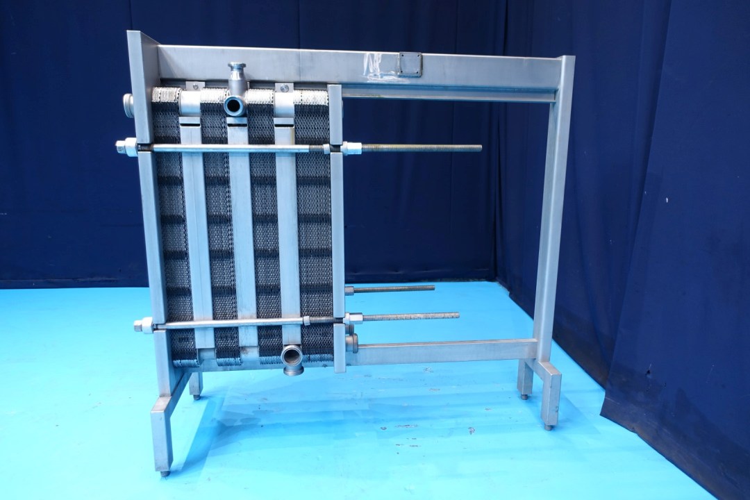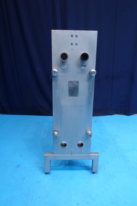 Plate heat exchanger, sanitary (PHE). Pressure: 10,0 bar. Beam length: 180 cm. Connections: 2x 2" Din and 10x 3" SMS. Current configuration: 4 Sections: 17-18-18-24 plates, in total 77 plates. Connections head: 2 up, follower 2 down. Total dimensions: 196x75x185 (lxwxh) cm - weight: 1.098 kg.