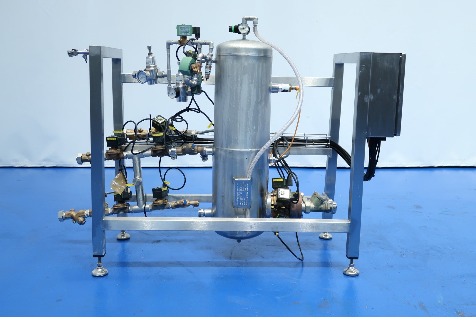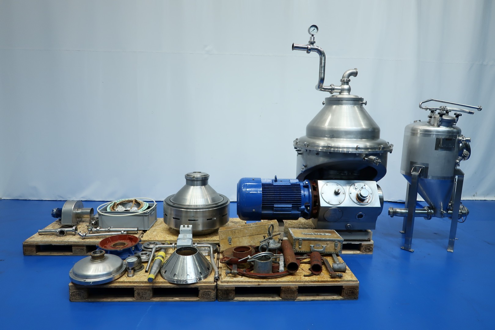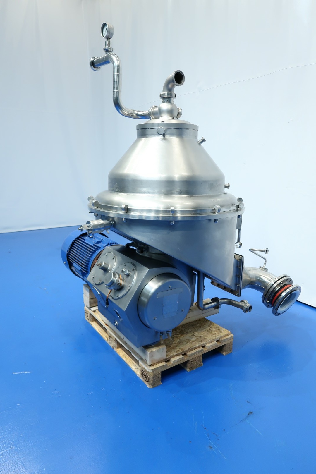 Fresh cheese - Quark - Greek Yoghurt -Skirr -Labaneh separator, Self cleaning nozzle separator with 12 nozzles. Capacity on input 5,000 up to 9,000ltr/h, Capacity depending on Protein content on inlet and desired total solids on outlet up to 3,000kg product out (max 20% ts). The separator concentrates fermented skimmilk in a ratio of approx 2,2/3ltr input to 1ltr concentrate on output. Bowl speed 4,160rpm, sludge space: 25ltr in bowl. Including quark collecting tank, a Funnel volume: 195 ltr, with 2 x level sensor and 1 x temperature sensor. Skid with watermodules (OWM). Motor 37,0 kW. Set of tools (list available) with ring key and pressing tool. With big set of spare parts, including 1 x extra impellor Pump and 1 x main spindle. Documentaion: Instruction book and parts list available (in English and German). Excluding: Baseframe, double filter and controls. Dimensions separator: 200x175x205 (lxwxh) cm - weight: 1.459 kg. Total weight all parts: 2.705 kg.