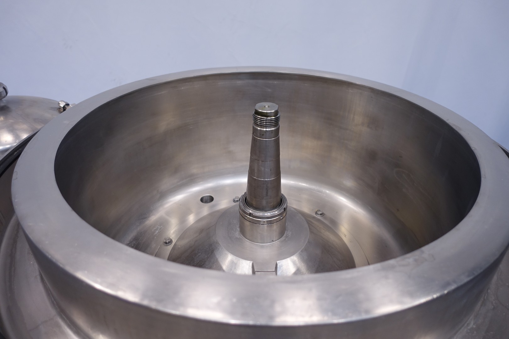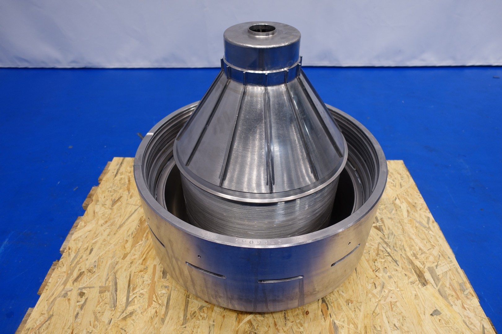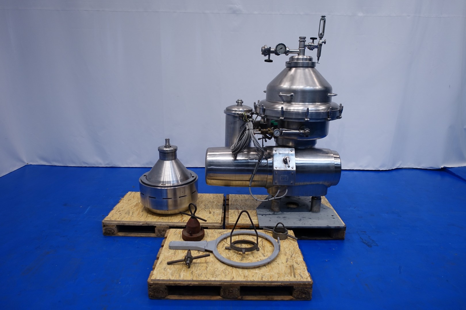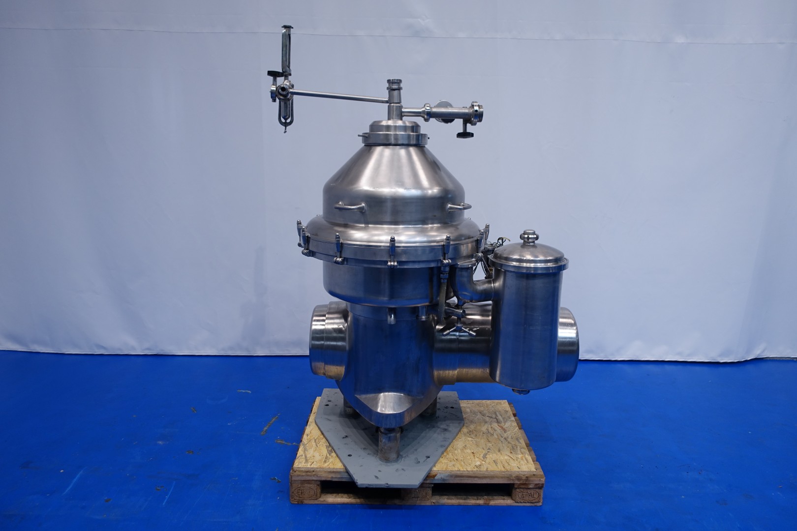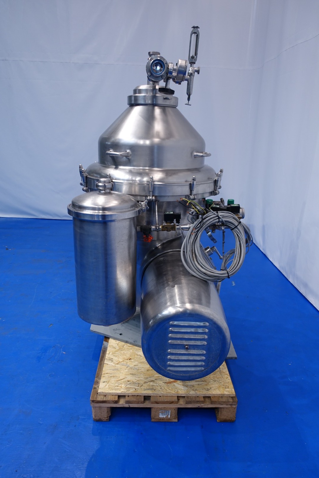 Whey skimmer clarifier, self cleaning. Including bowl, motor cover, base frame, cyclone, manual counter pressure valve milk , flowindicator and manual flow regulation valve for whey cream, wanouvering water valves. Motor 15 kW - 30 A - 1.450 rpm. Part of tools with ring key. No controls. Connections: 2x 2" Din - 2x 2,5" Din - 1x 1" SMS - 1x DN40 SMS. Total dimensions: 155x100x215 (lxwxh) cm - weight: 1.569 kg.