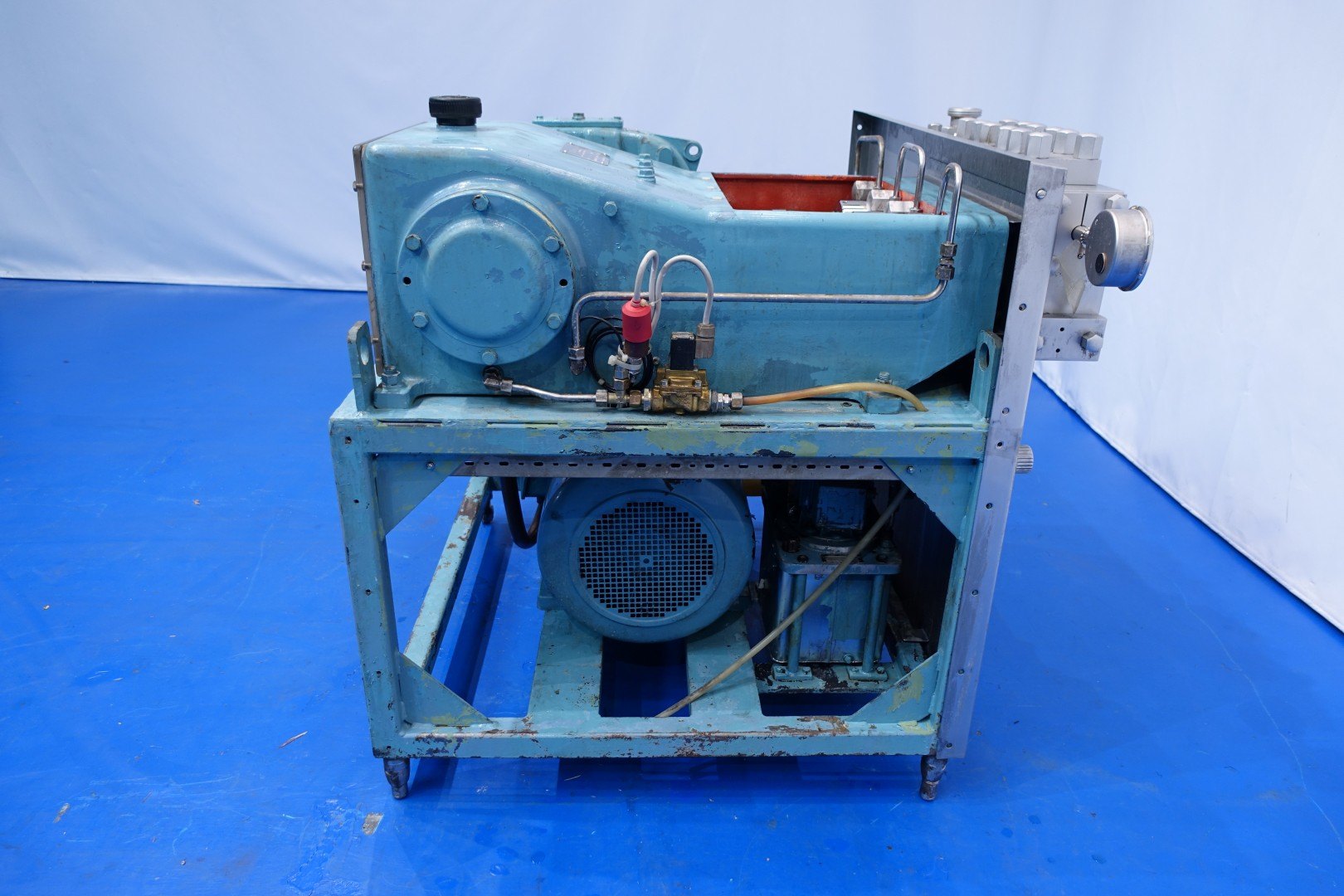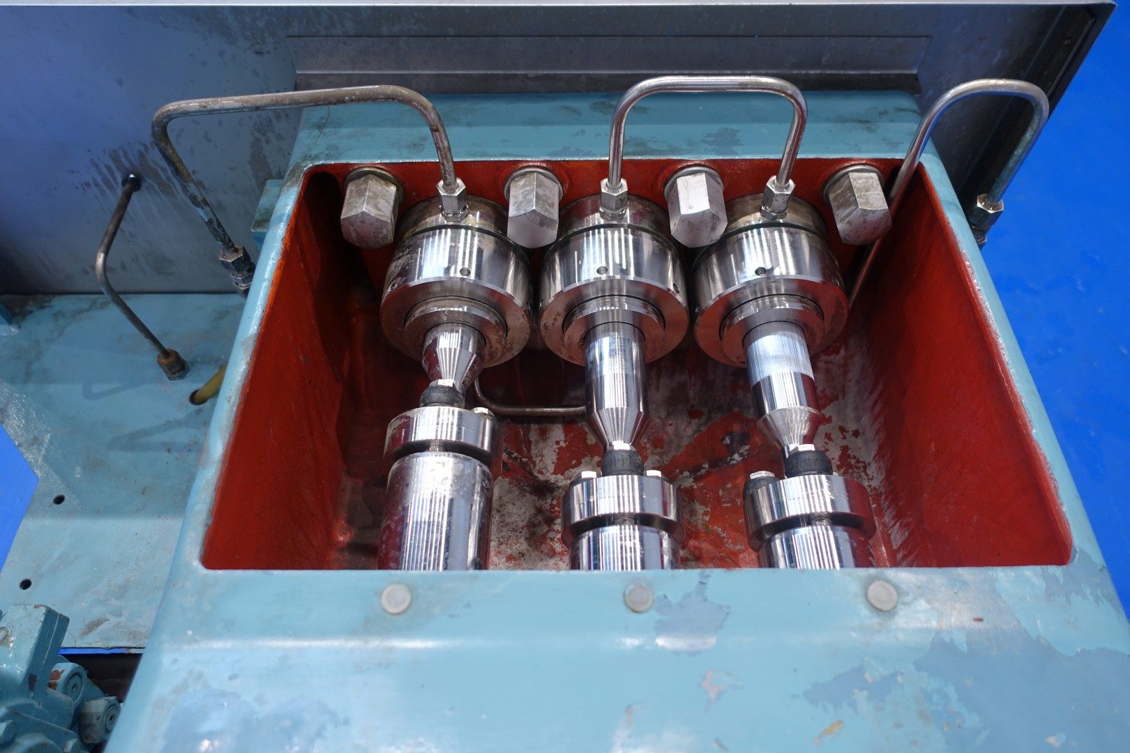 High pressure homogeniser. 1 stage with hydraulic pressure control. 3 Pistons, piston diameter: 70 mm and stroke: ca. 65 mm. Stainless steel cladded. Connections: 2x 2" Din. Current motor power: 45 kW and maximum pressure in current confirguration with this motor 250bar. No control panel. Pressure Manometer on outlet. Electronic pressure transmitter. Flowswitch on cooling water. Total dimensions: 114x114x128 (lxwxh) cm - weight: 1.158 kg.