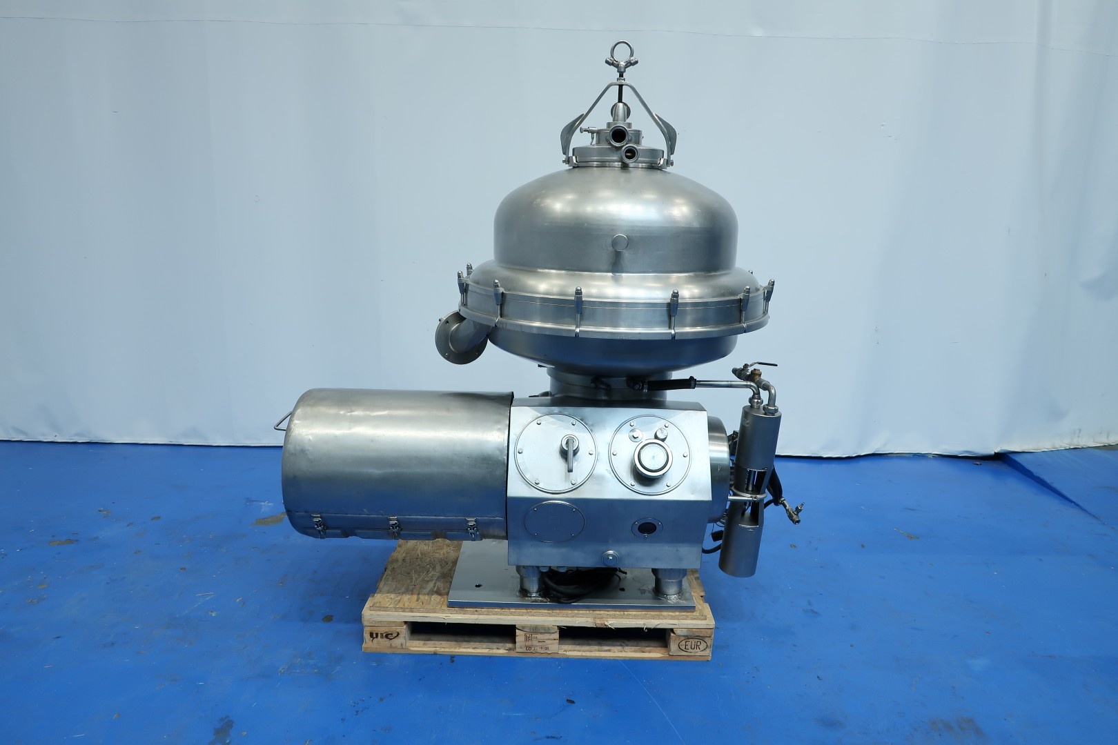 Separator, 3 way separator, for high fat/oil dehumidification like butter oil, self cleaning. Including bowl, motor cover, base frame, OWM. Motor 30,0 kW - 56 A - 1.440 rpm - 50 Hz. This is a 3 way separator, 1 in and 3 out . Inlet bottom fed (hermetic design), out in top, light clean oil and heavy fase can be water with additives and sludge (heavy particles). Bowl design and discharge The bowl of the SRPX 317 HGV-74 is configured as a concentrator, enabling effective phase separation. The variable discharge allows the solids discharge to be flexibly adapted to specific requirements. The timed discharge optimizes operation and minimizes downtime. Outlets for liquids The machine features hermetic outlets for the light and heavy phase. This ensures clean and secure removal of the separated liquids without leakage. Set of tools with ring key and pressing tool. Without sludge collecting cylcone and controls, can be offered upon request. Dimensions: 172x92x182 (lxwxh) cm - total weight: 1.704 kg"