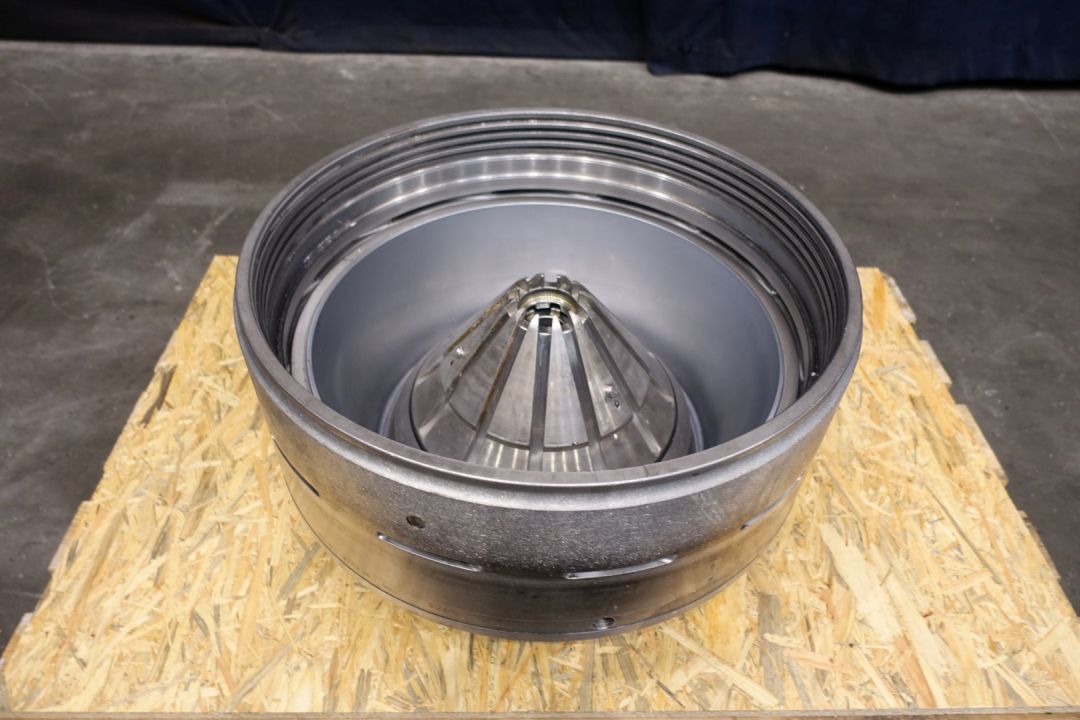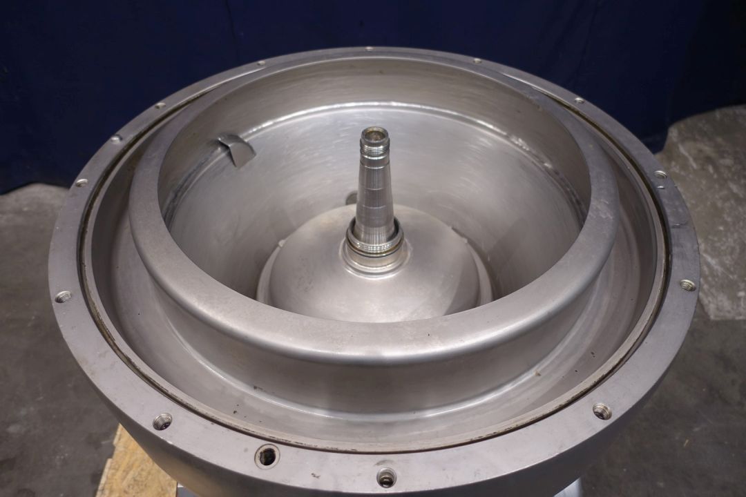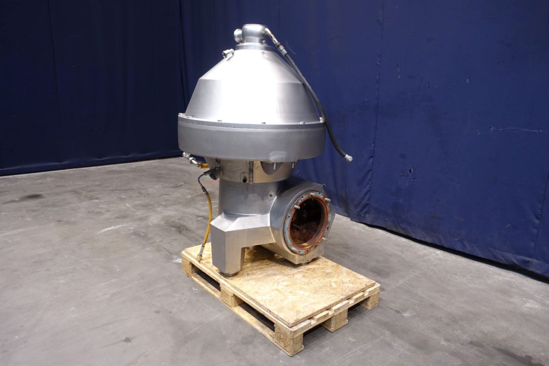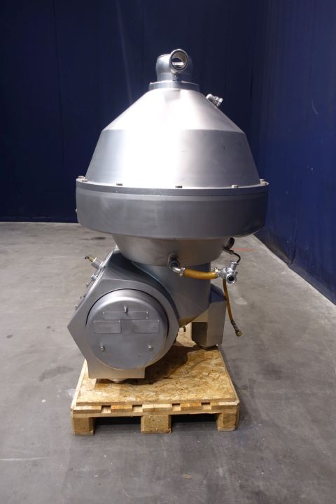 Hermetic oil concentrating / polish separator to take out water of a butteroil/AMF or a vegetable oil/fatt, self cleaning. Capacity depending on the use. Including bowl. Worm wheel shaft: 1420 - 1500 rpm. Revolution counter: 118 - 125 rpm. Machine has signs of use around. Excluding: motor, motor cover, base frame, cyclone, counter pressure valve, flowindicator, flow regulation valve, OWM, controls, tools, topcover outlet and documentation.