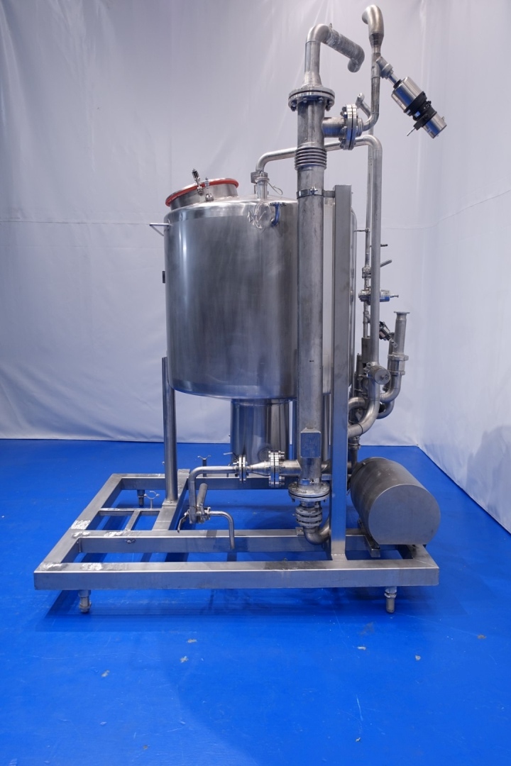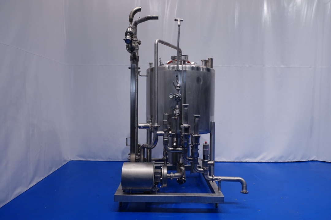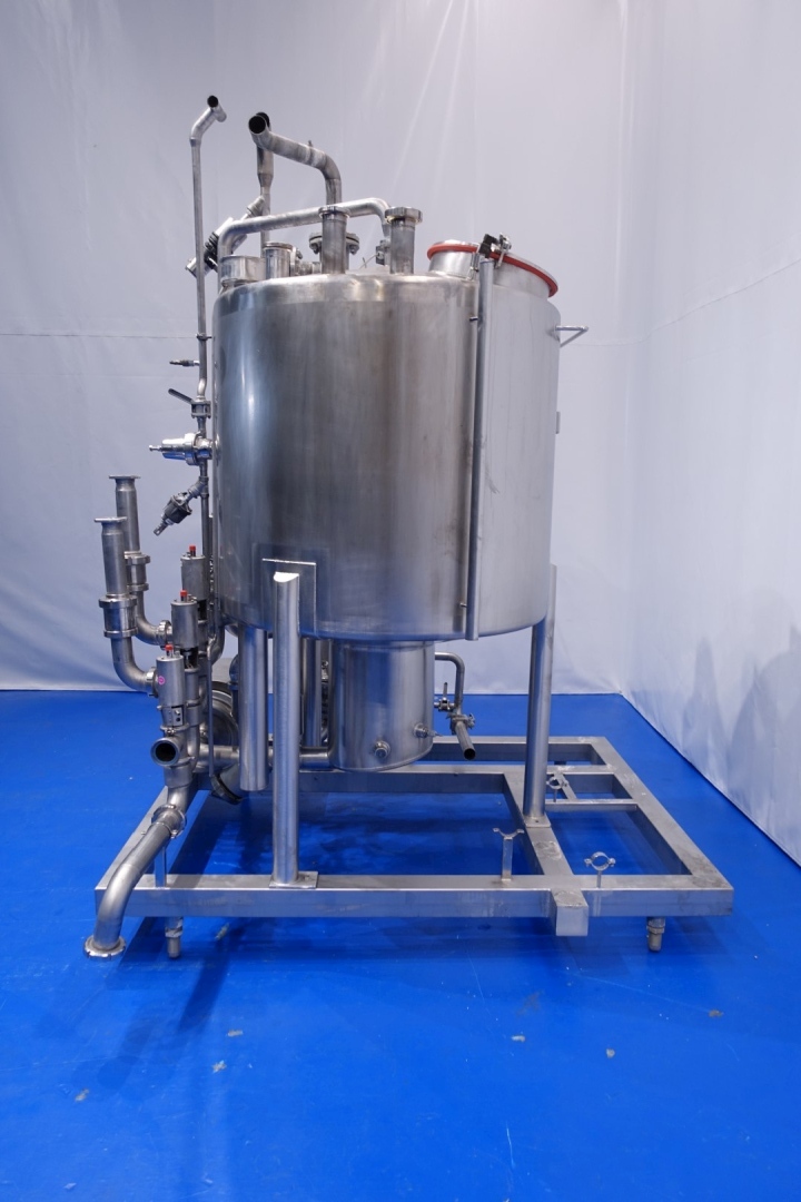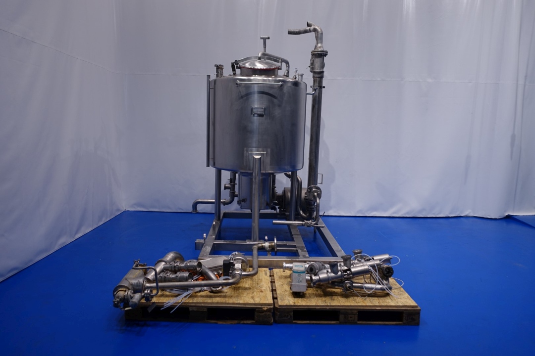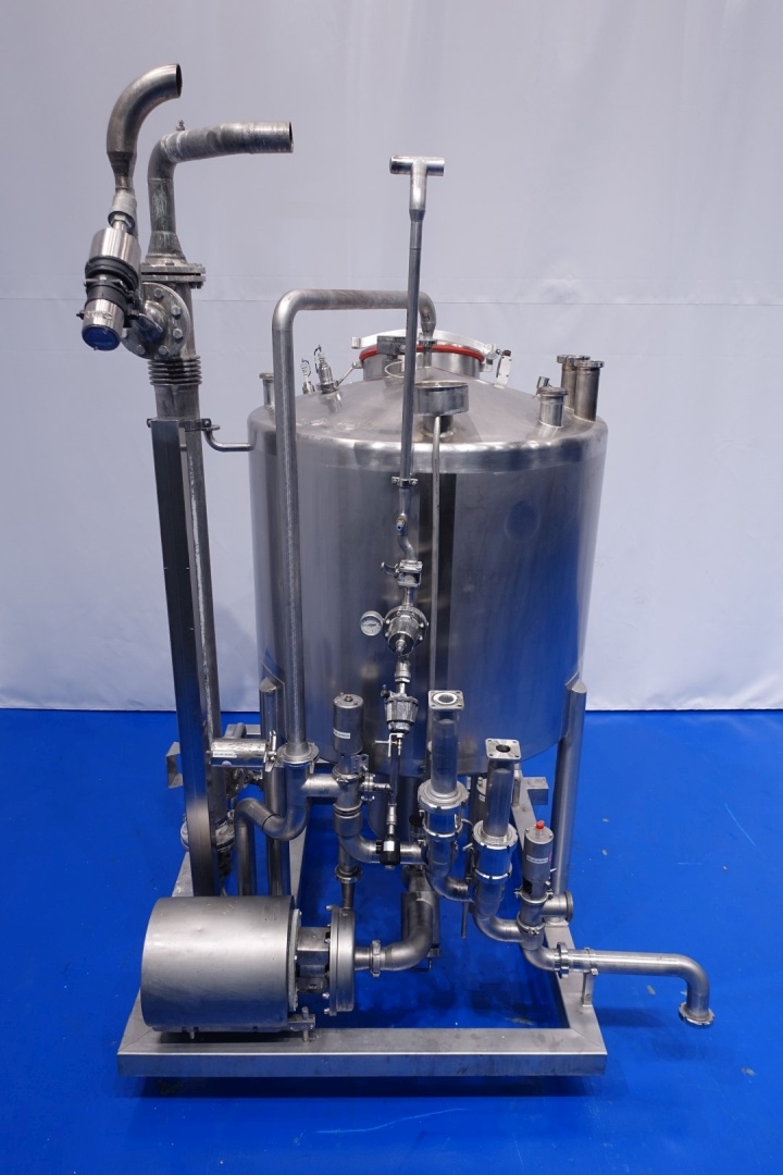 Skid mounted Cip unit, which consists of: balance vessel, centrifugal pump, tubular heat exchanger, 1 x Siemens mass flow transmitter, valves and piping. Single jacketed balance vessel with 2 x cip spray bowl - 2 x level sensor and 1 x temperature sensor, capacity: 1.200 ltr. CIP+ pumps Alfa Laval LKH30/180 - 7,5 kW - 15,0 A - 2.885 rpm - 50 Hz - impellor Ø 180 mm - connections in: 2,5" Din - out: 2" Din. giving 20M3 at 4,5bar or 50m3 at 3bar. Aurum process technology tubular heat exchanger - type: K19 120/18 2.0 304/316L H - built in 2015 - capacity: 14,8 / 7,6 liter. Total dimensions: 205x188x303 (lxwxh) cm - 520 kg.
