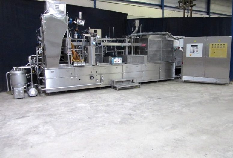 4 Lines, Cup filling and sealing machine for viscous products like yoghurt. Cup diameter 75 and 95 mm, double plates for automatic format change by moving chain 1 step forward or backward. Cup decontamination by UV light (air cooled Heraeurs cassetes) , main doser 100 - 550 ml (CIP cleanable), lid sealing and packer (only gripper 3x4, 95 mm). Control panel with Siemens S5 PLC. Dimensions filling machine only: length (without outfeed conveyors) 509 cm - width (without outfeed conveyors) 171 cm - heigth (max) 370 cm. Width +/- 8.000 kg.
