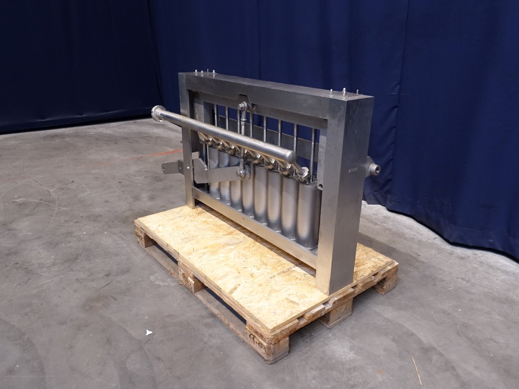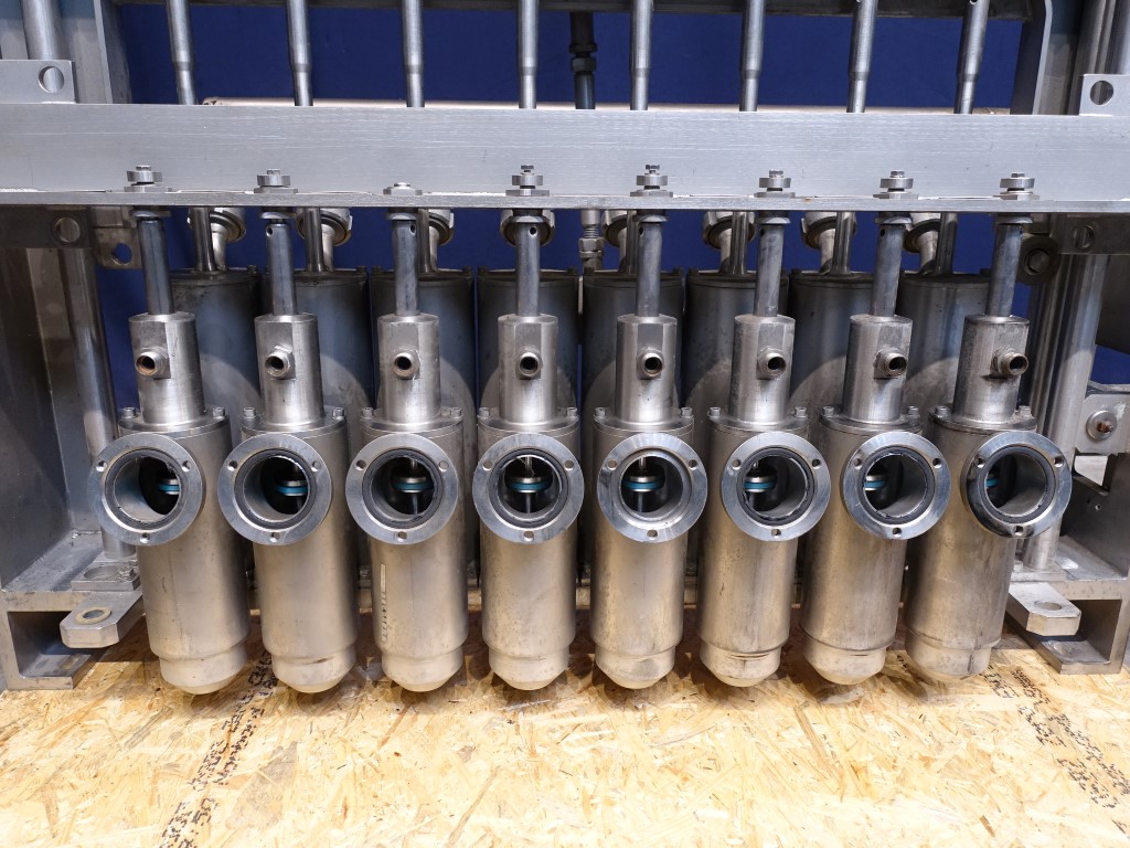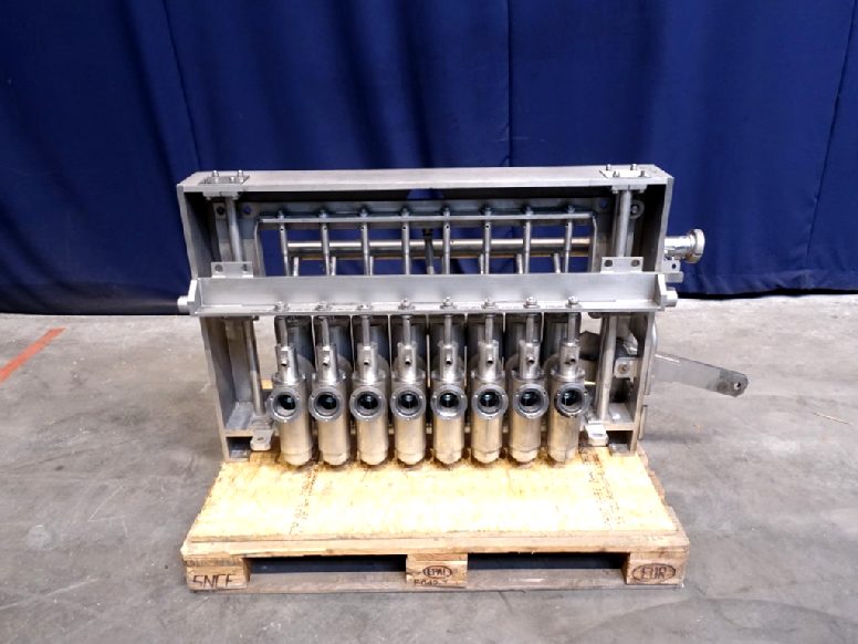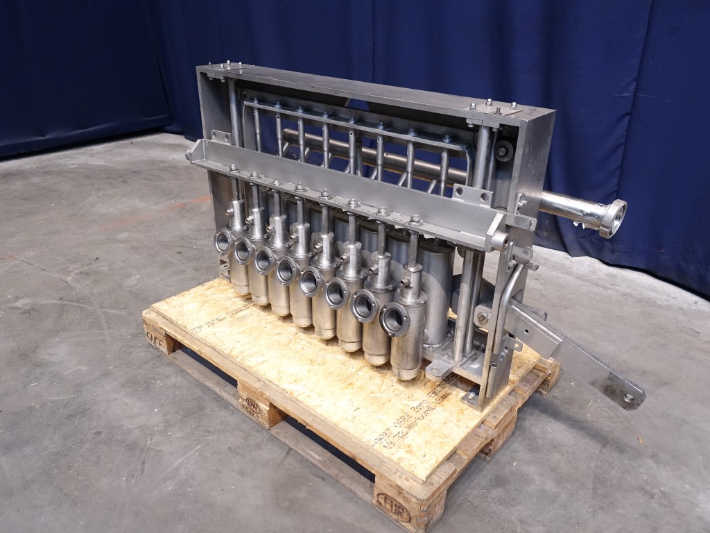Dosing unit. 8 Heads, positve piston doser. piston diameter 70 mm, stroke 130 mm maximum volume: 500 ml. Distance between heads 10 cm centre to centre. Cip cleanable. Suitable for Ampack Ammann AA8 cup filling machine. Total dimensions: 120 x 80 x 45 cm.