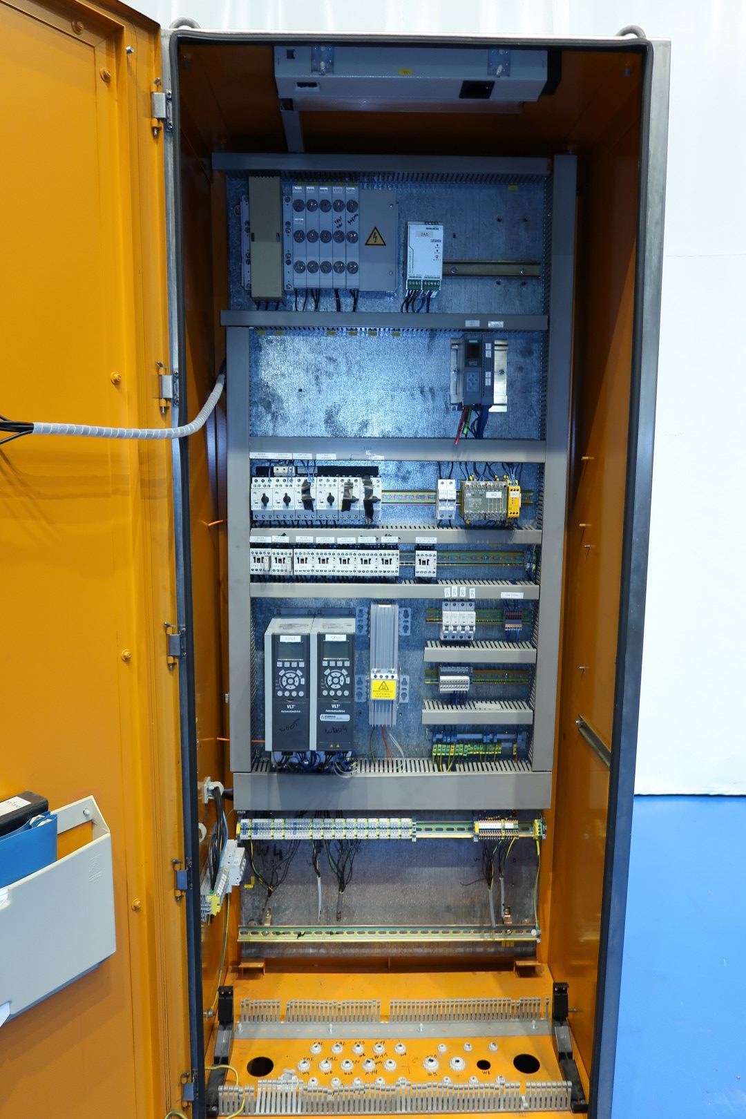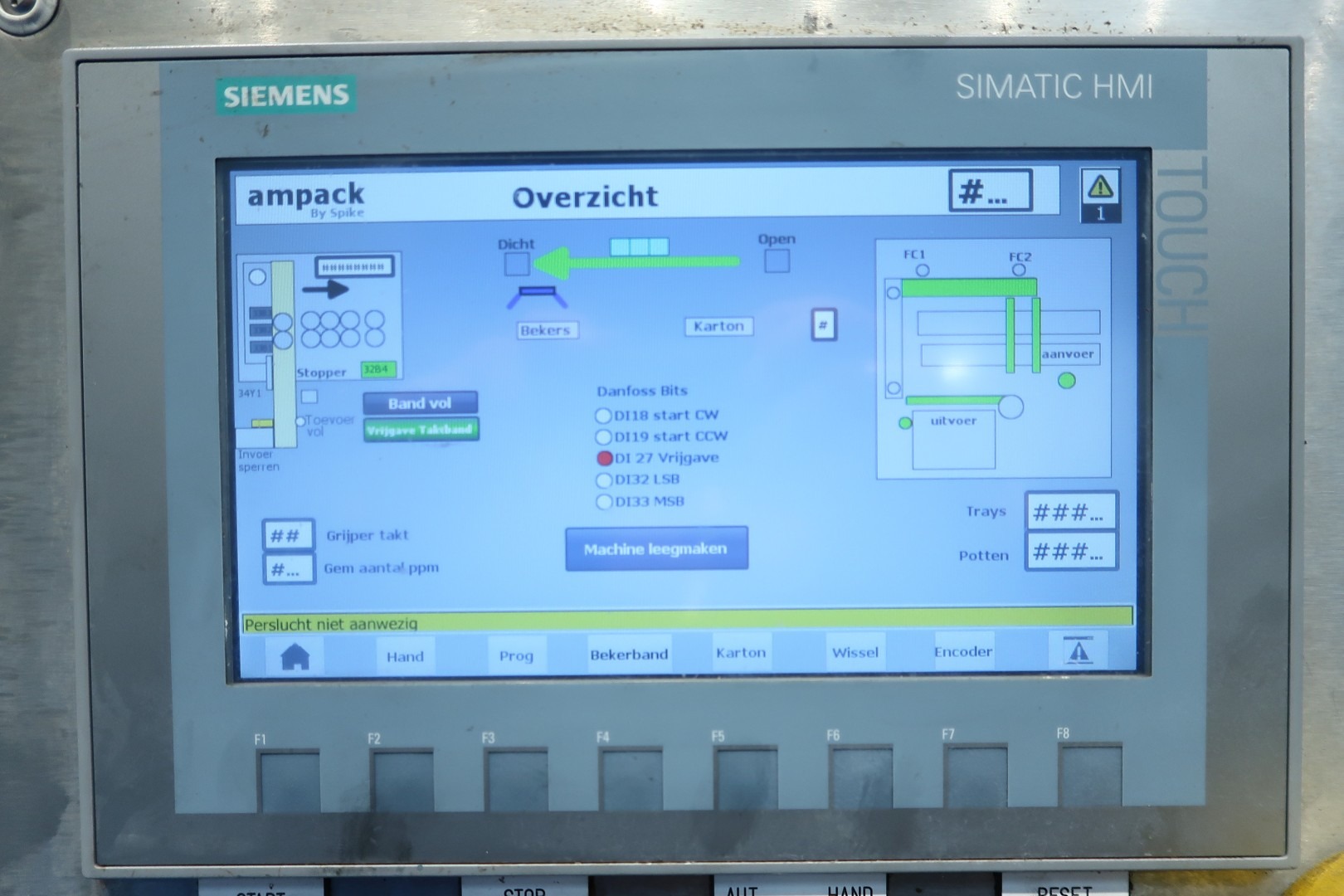Fully automatic packer, for trays. Used for round cup 116 mm. Pack scheme: 3x2 = 6 cups per tray. Current dimensions of the tray: ca.250x360 mm. Motor: 3 kW - 50 Hz. Compressed air 14 Nm3/h - 7 bar. Controls: SIemens Simatic S7-1500. Original filling machine (Ampack KF1/3) also available under (STN15964). Total dimensions: 265 x 180 x 220 cm. Weight: 1.440 kg.