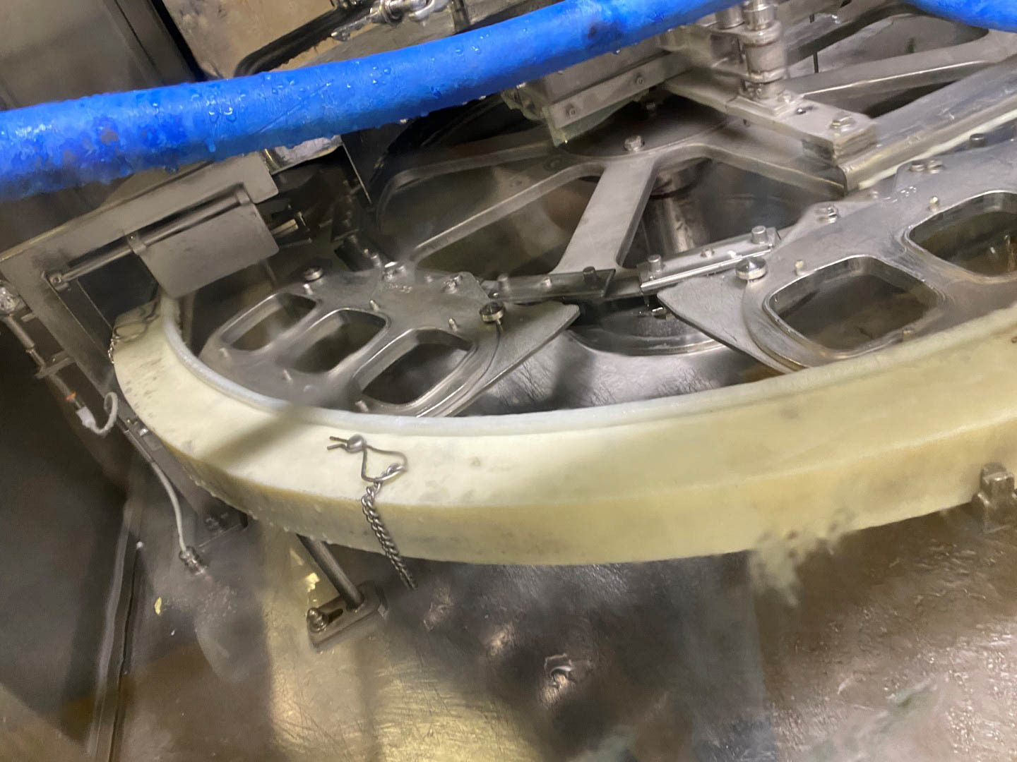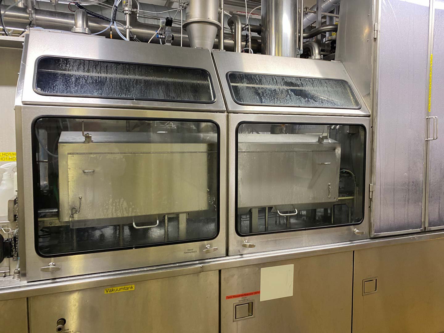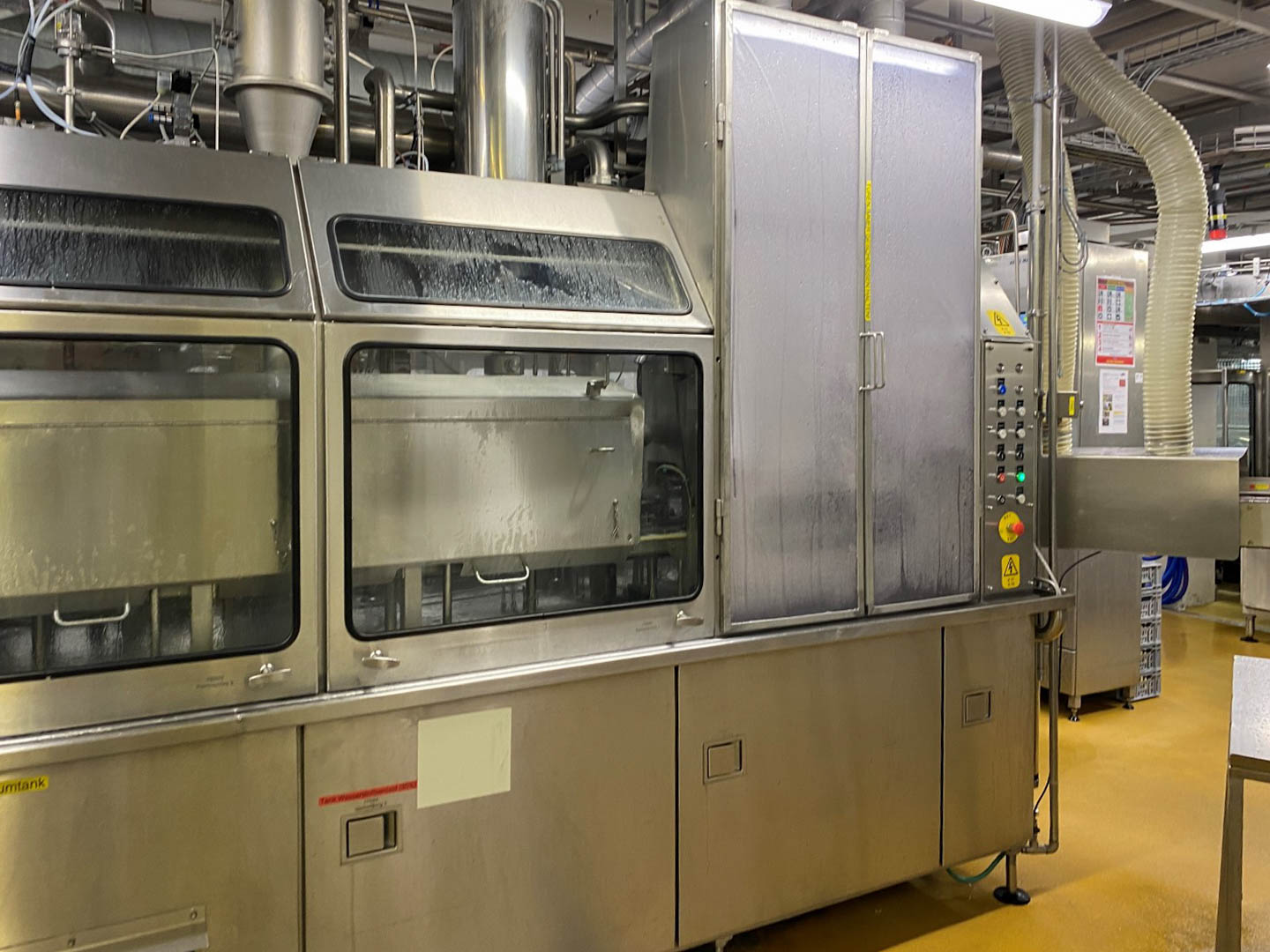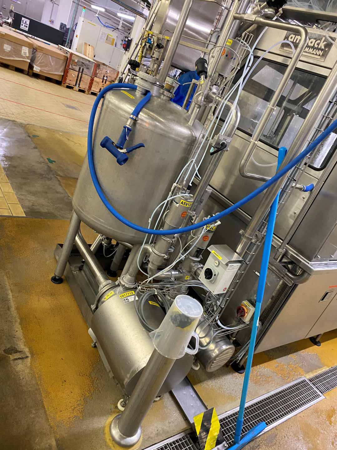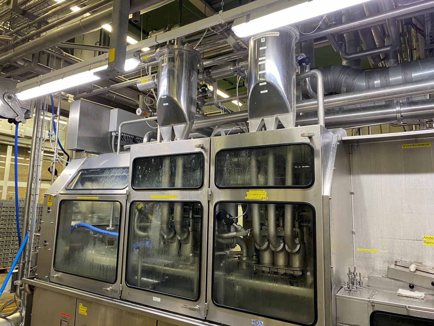Cup filling, sealing and packing machine (0.25 - 0.5 + 1 liter) Ampack Ammann KF2/3 Ultra Clean Carousel filler for filling and sealing cups with easy format change. Used for filling of yogurt and quark products with a shelf life of up to 40 days in the cold chain. Current cup size 2x round ø 95/ 85 mm & 3x square 85/115, 119 mm. (easy to adapt to round 1 litre but not included). The filling machine has cup decontamination by injecting H2O2 and sterile air flooding, lid decontamination by infra red light. Free space before and after the main fillers for addition fillers in future. Main filler 1: 3 cups each stroke up to 500 ml for round 85 and 95 mm and square 85 mm, main filler 2: 2 cups each stroke up to 1 liter for square 115 and 119 mm. Empty space for 3rd filler for pre-and post-filler. Servo sealing station and dating unit for inkjet (without devices) Controls: Siemens S5. Including CIP return pump. Ampack ASGP4 automatic packer for cups into a tray. Year 1999, controls: Retrofit Siemens S7-1500 (year 2020). Sema Snap lid applicator system to put snap on lid for cups 95 mm, also possible with caps filled with cereals. Year 2014. Working hours: +/- 4.000. Controls: Siemens S7-300. Sema Tray erector: Device for automatic formation of cartons from flat plano carton. Various sizes open trays (see the photo of the cartons with all formats). Complete with Nordson ProBlue 4 hotmelt. Year 2013, working hours: +/-15.000. Controls: Siemens S7-300. "