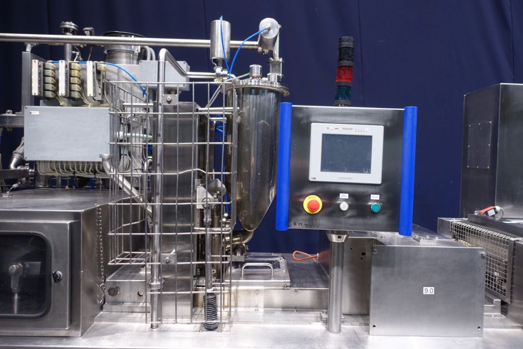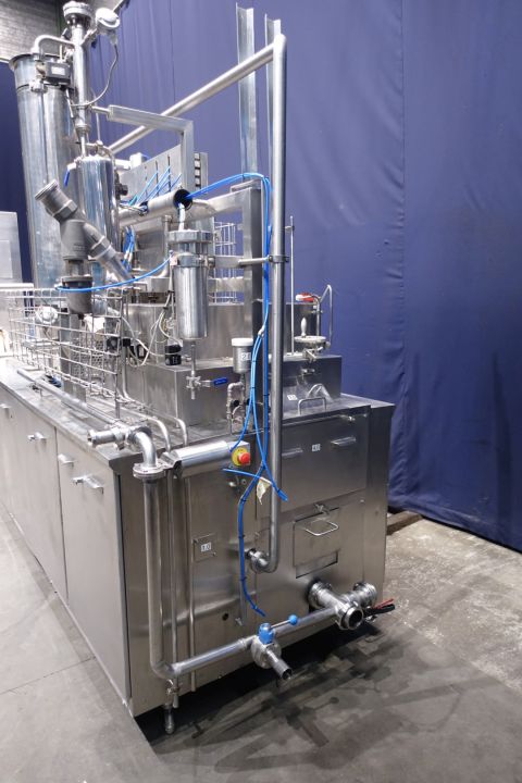 "2 Line ultra clean cup filling machine, cup diameter 75 mm. Cup decontamination with H2o2, pre-doser for fruit pulp on bottom of cup 10 – 50 ml, main doser (100-275 ml), CIP cleanable, lid dispending, infrared light lid decontamination and heat sealing. outfeed conveyor and Lazy suzan, 'turn-rotary table' for collecting on outlet. Total dimensions: 430 x 140 x 260 cm. Weight machine 3.400 kg - turning table Ø 100 cm, weight 106 kg - conveyor belt length 210 cm, total width 35 cm, weight 140 kg's. New control panel with new hitachti PLC and Touch screen HMI and complete machine check up, made in 2010. Excluding blower and CIP return pump (Pomac). "