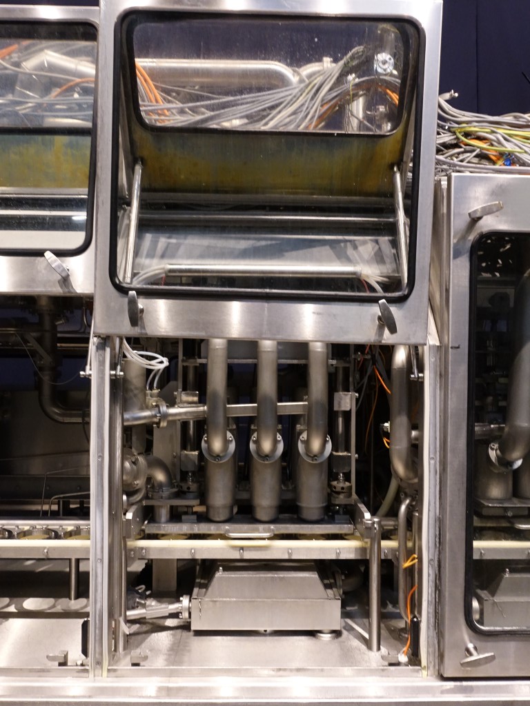 Ultra clean Caroussel filler with 3 heads. Current Cup size round: 95 mm. Stations: Cup destacking, no- or double cup detection by eye sensor, cup decontamination by peroxide (H2O2) in 5! steps, predoser (80 - 275 ml), maindoser (125 - 575 ml), afterdoser (80 - 275 ml) alle CIP cleanable, seal decontamination by wet peroxide (H2O2), dispensing by vacuum, heat sealing, sqeezing the cup while sealing, snap-on lid, spray system to disinfect the chain and cupholders, outfeed on 1,4 meter single lane conveyor. Machine has polycarbonate safety guards and has an automatic central greasing system. Easy format change. Ultraclean with sterile air and room sterilisation by wet peroxide. Controls: Siemens S5, Missing: seal/snapcap holders, HMI screen, blower and sterile filter for air, 1 air suction ventilator included. Users manual, electric manual, parts list available in German language. Total dimensions: 6,8 x 1,7 x 2,75 mtr.