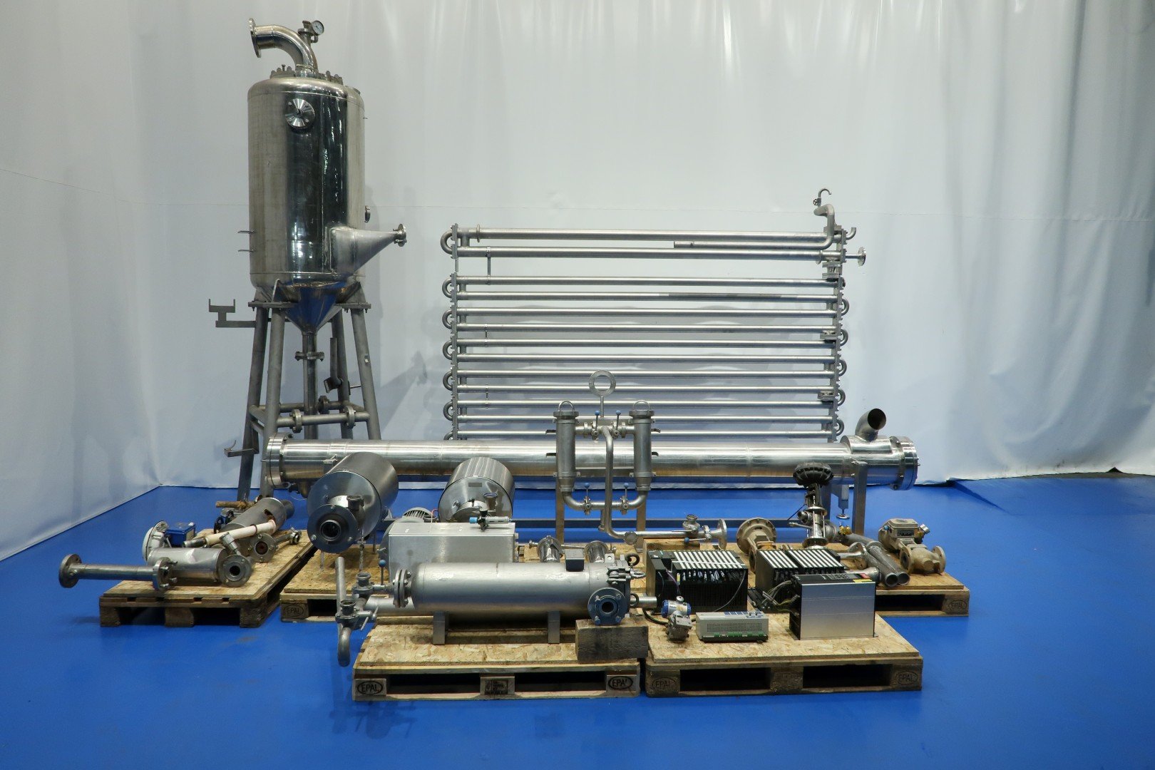 Heater unit with Direct steam injection (DSI) and flash cooling. previously used on milk concentrate 50%. Extreme fast heating and cooling of sensitive products. The Unit exist of: infeed (centrifugal pump Fristam 7,5kw, Tubular pre heater/air cooler (recuperation system), tubular heater by steam/hotwater indirect to ± 80°C, Steam injection direct in the product (heating up to between 90°C or max 145°C) and flash vat to cool product down by vacuum), oufeed pump (Fristam 7,5kW with flushed seal and double filter. The steam is filtered before injected by a steam filter (make Pal). with water pump, product and steam valves and piping. (excluding liquid ring vacuumpump and controls) can be offered on request.