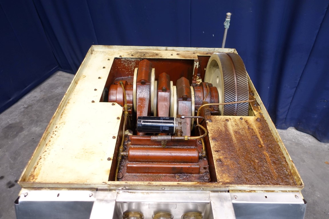 High pressure homogeniser. 2 stages with hydraulic pressure control. Poppet valves. 3 Pistons. Piston diameter: 2 1/8 '' and stroke 6 1/8 ''. Stainless steel cladded. Connections: inlet 2'' and outlet 1,5''. Current motor power: 75 kW - 980 rpm - 380 V - 50 Hz. Pressure in current configuration according typeshield 245 bar. Manometer on outlet. Excluding controls, tools, overpressure valve, bypass valve, pulsation dampers, electronic pressure transmitter. Machine can be converted with this 75 kW motor to: 10.000 ltr/h @ 245 bar or 4.000 ltr/h @ 345 bar.