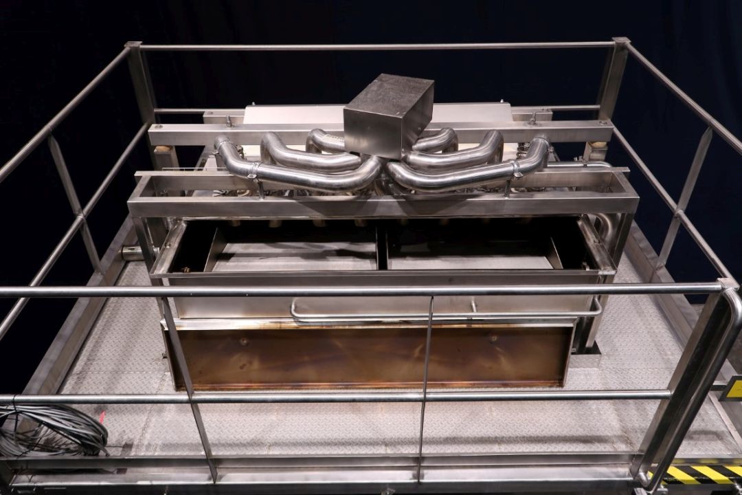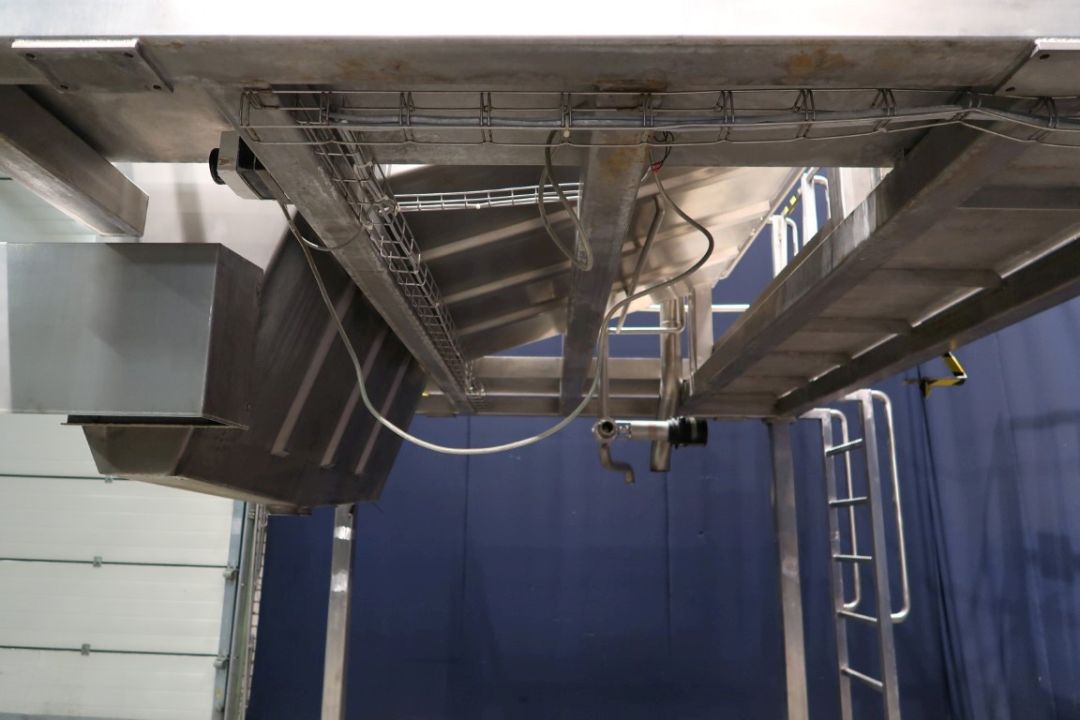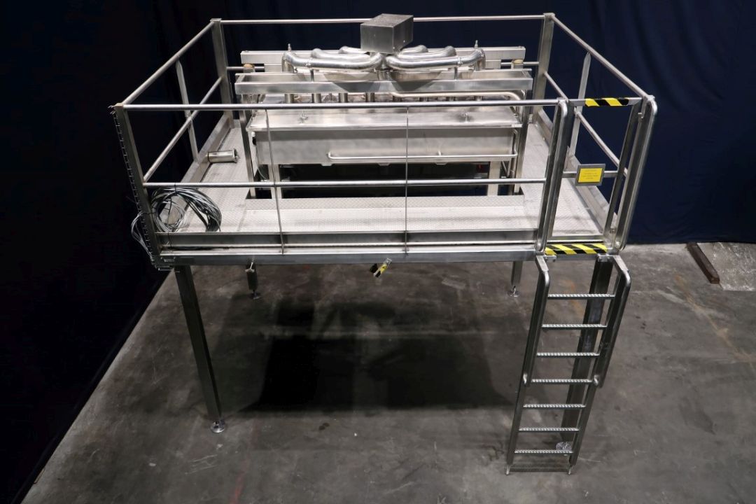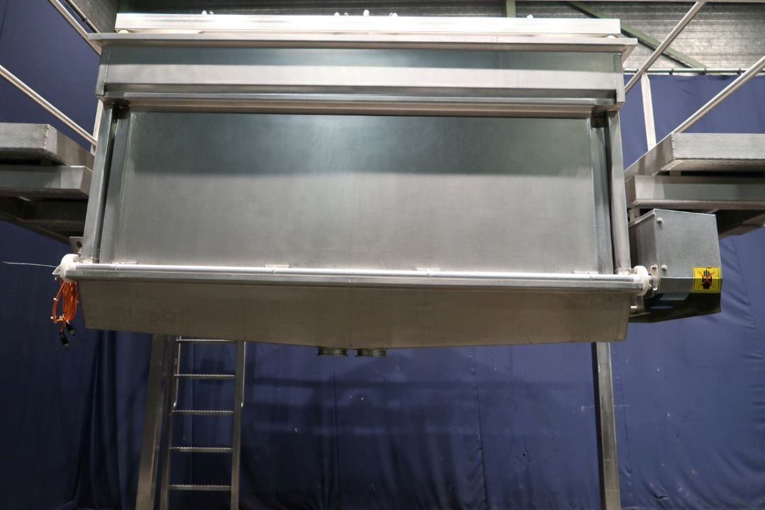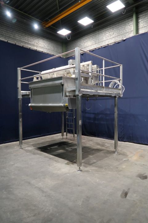Dry curd distribution. Pre draining system for open structure cheese like Tilsiter or Rossiysky types cheese. Previously mounted on a APV OPD pre presss. The curd/whey mix is pumped to the system where the whey is drained of and the curd falls down in a prepress. Width of spreader: 170 cm. Feed of Product approx 40M3/h Total dimensions: 340 x 254 x 365 cm. Documentation available.
