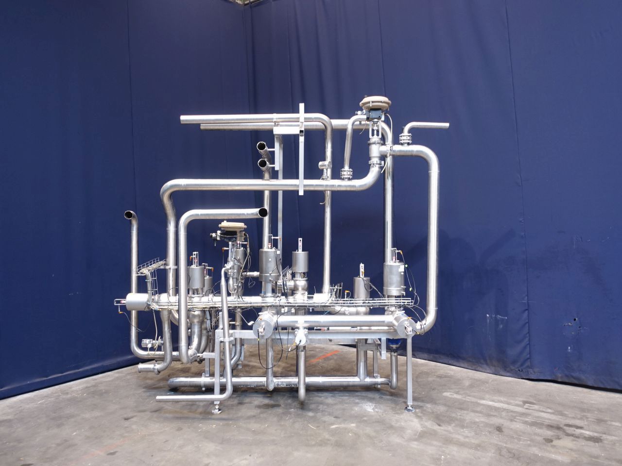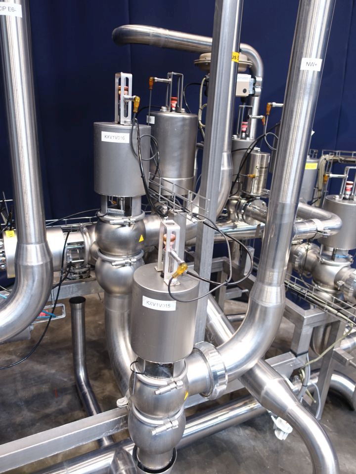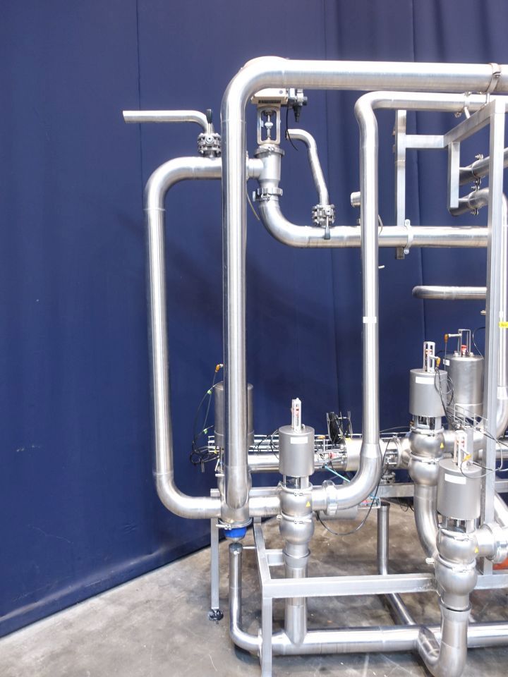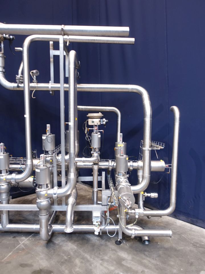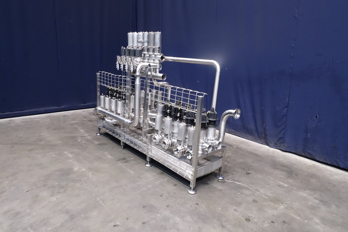 Valve manifold with the following components: 2x E&H pressure sensor - 1x Klay-instrument pressure sensor - 2x Samson sanitory 2-way regulating valve - 2x Manual 2-way butterfly valve - 2x Nocado Pneumatic 2-way butterfly valve - 1x Alfa Laval 3-way valve - 1x Alfa Laval 2-way mixproof valve. Following valves 4": 6x Alfa Laval 2-way valve - 2x Alfa Laval 2-way mixproof valve - 1x Alfa Laval 3-way valve - 2x Alfa Laval 4-way valve and 2x Alfa Laval 4-way mixproof valve.