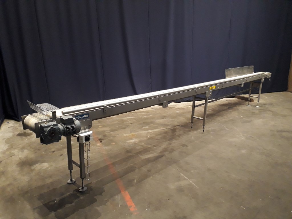 Belt conveyor. Effective belt dimensions: 710 x 25 cm. Motor: 0,37 KW, 25 rpm. Horizontal. Total dimensions: 725 x 55 x 115 cm.