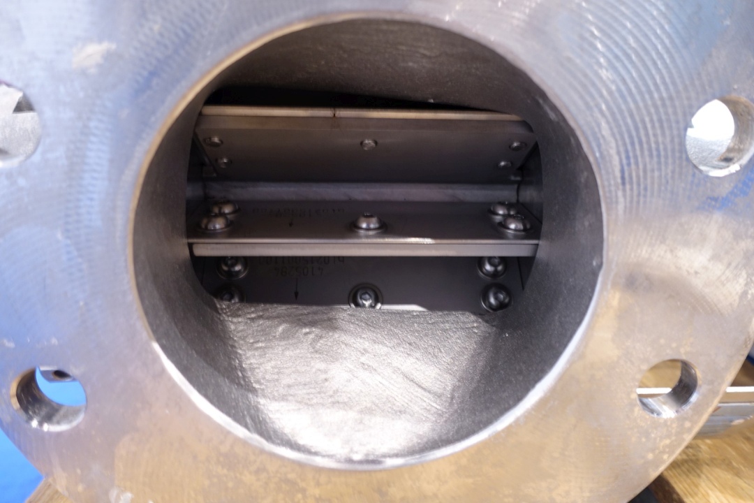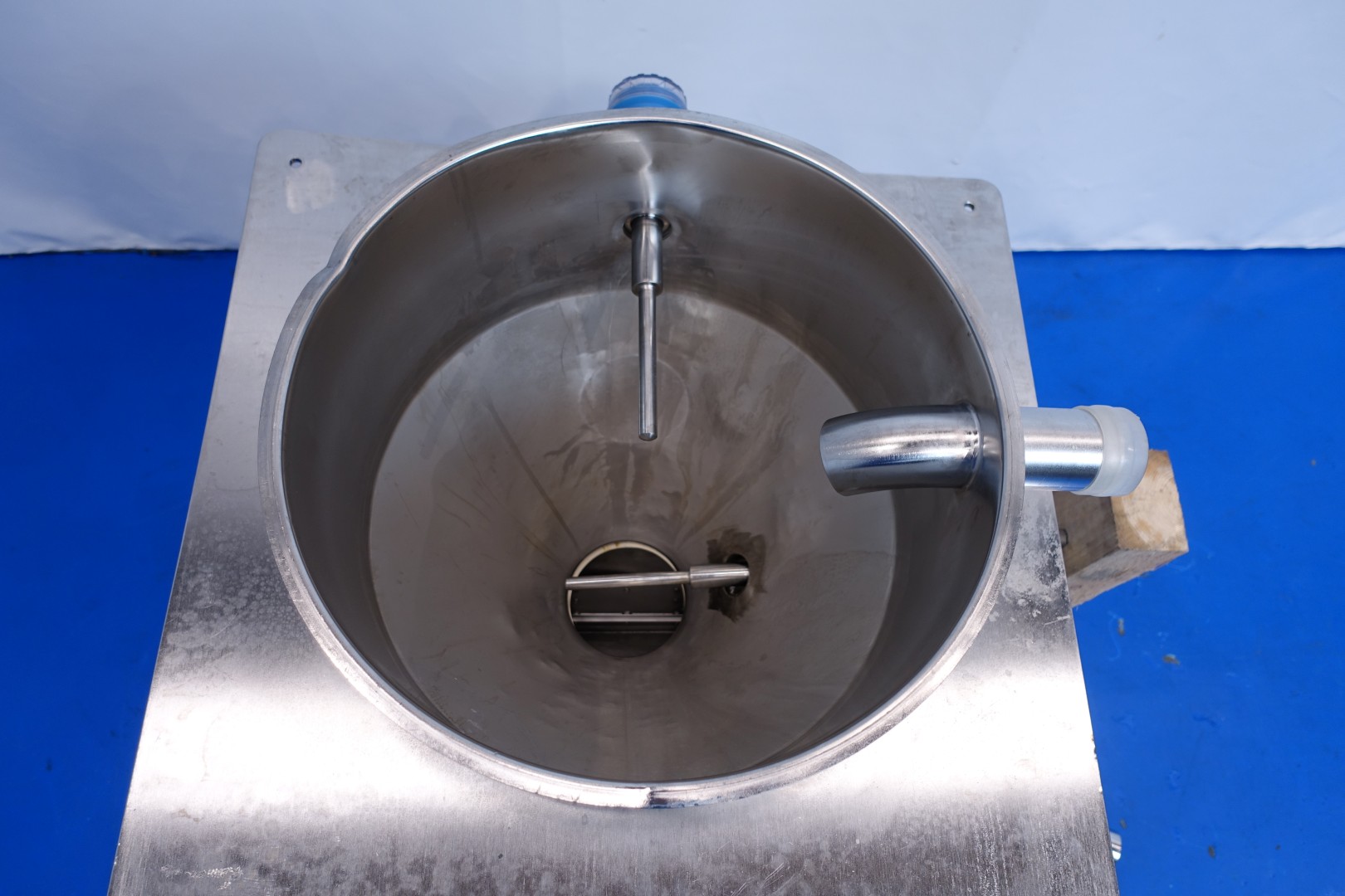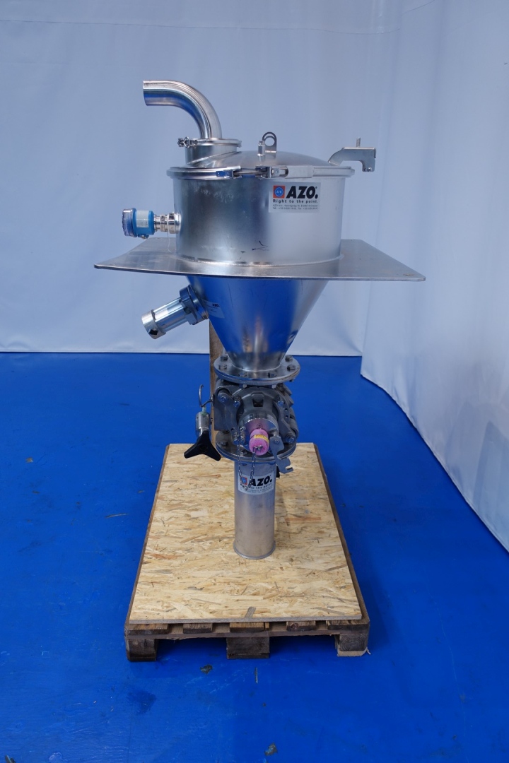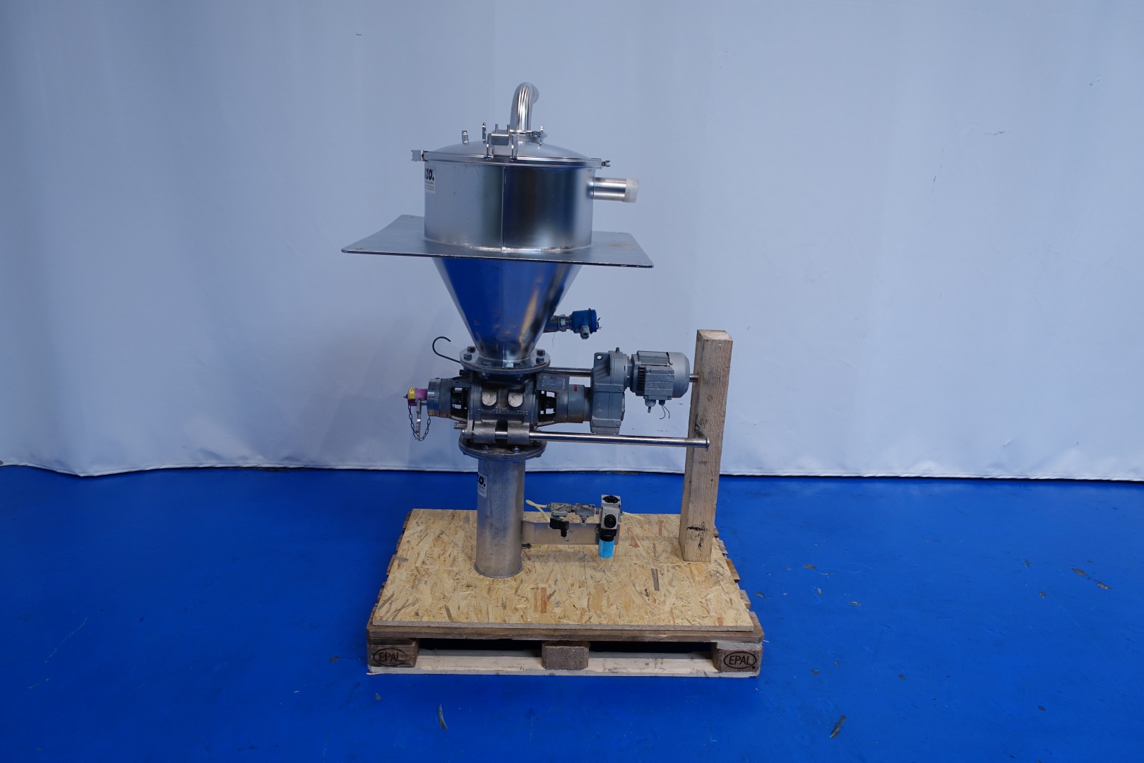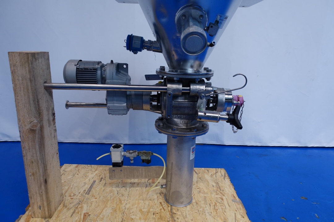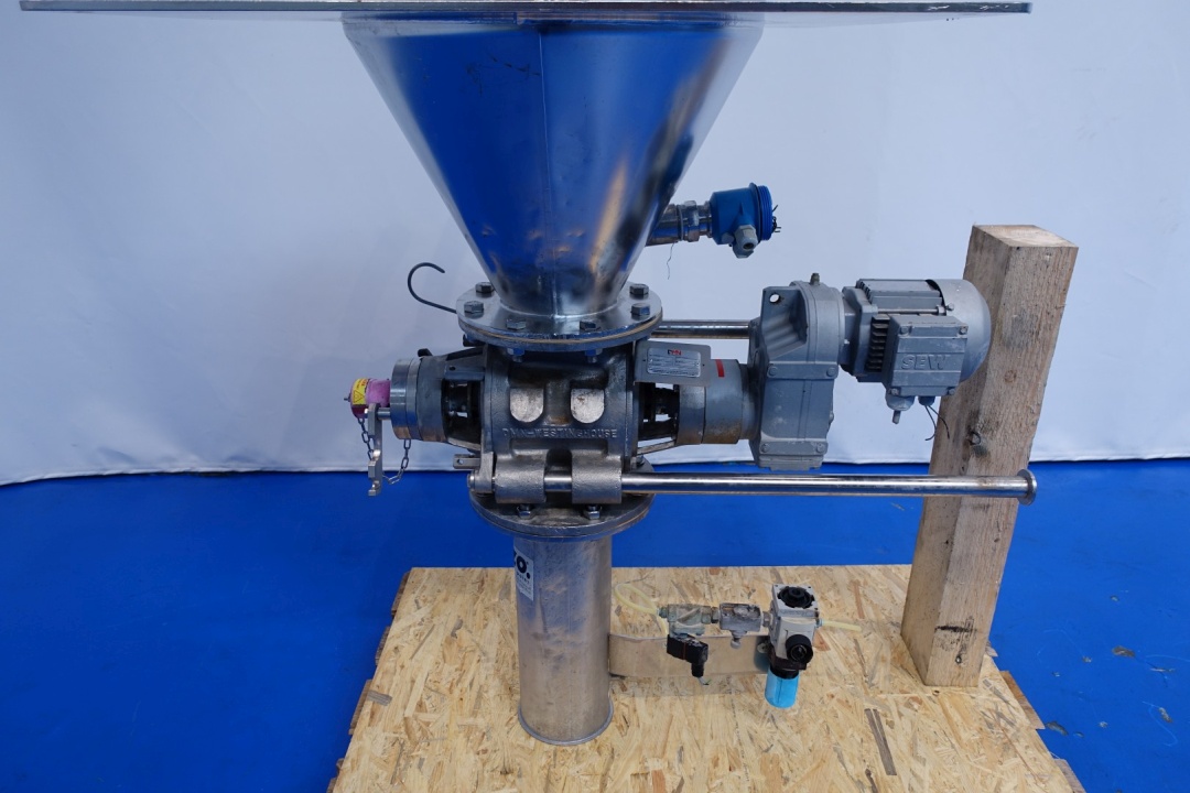 Azo powder dosing feeder. Powder Rotary high dtury valve this Powder sluice to determine the amount of powder by counting the rotations. manufacturer of this Sluice: DMN Westinghouse. Type: AL 150 2MZC, max 20rpm. Previously placed on powder dissolving tank (STN15770). Hopper on top of this valve with 2 x level sensor and 1 x pneumatic beater/vibrator. Diameter hopper 49,5 cm - diameter pipe below screwdoser 14,5 cm. Connections: 2 x 2,5" pipe. Motor: 0,37 kW - 1.380 rpm with reductor to 20 rpm. Total dimensions: 105x80x157 (lxwxh) cm - weight: 201 kg.