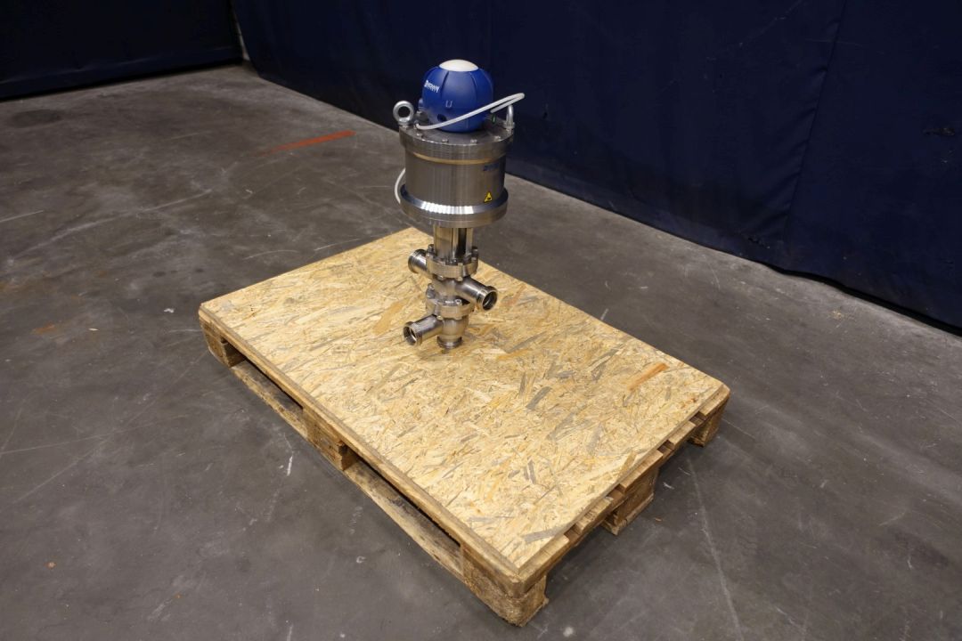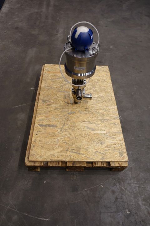 Single Bardiani valve with 4 outputs, single seat. Pneumatic activated 4 way. Connections 4 x 2" SMS. Max pressure 15bar. Kit Code: TTCBKA050M. Dimensions: 30 x 27 x 70 cm. Weigth ca. 30 kg.