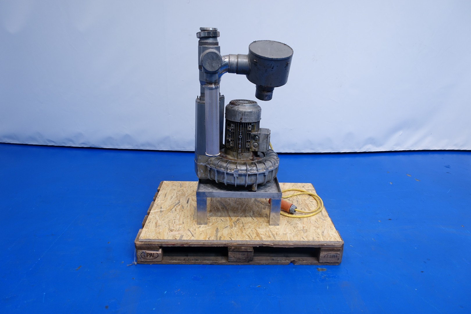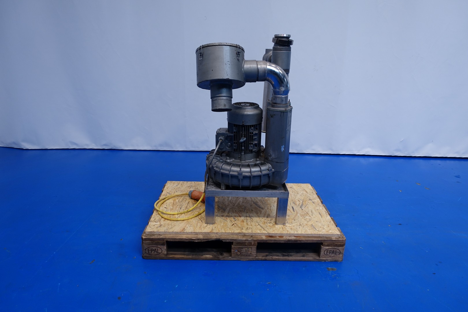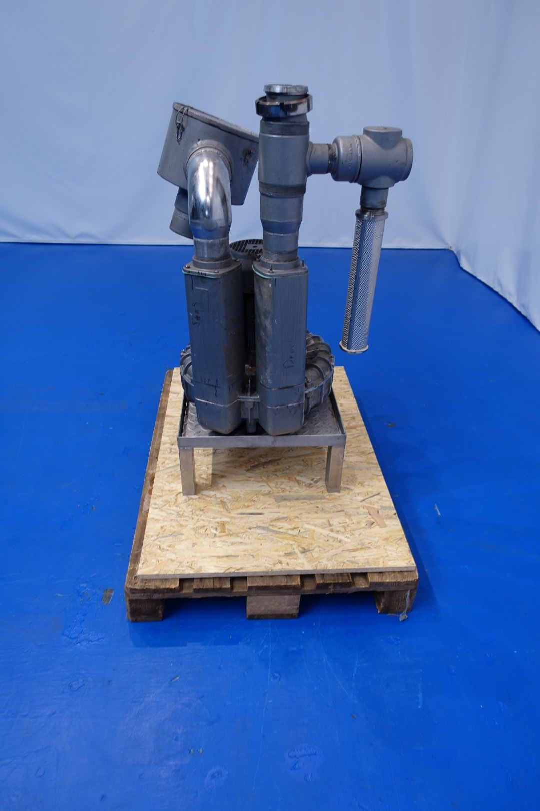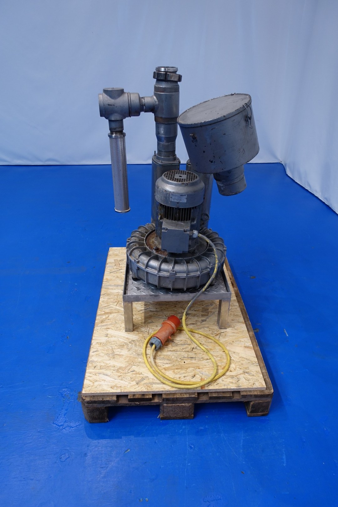 Air vacuum pump. Pressure: 150/135 mbar. Motor 4,0 kW - 7,8 A - 2.895 rpm. Connections: (Out) 1x DN80 Din. Total dimensions: 65x60x112 (lxwxh) - weight: 138 kg.