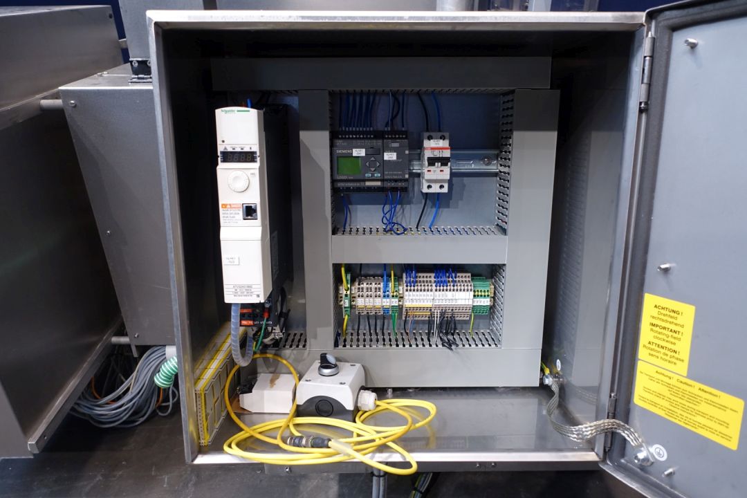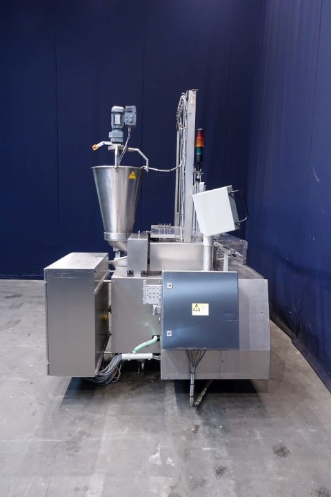 Rotatry filler, with 1 Head, 2 formats: cup size oval: 140x80 mm - cup size square: 130x95 mm. Stations: Cup destacking, double detection, Maindoser (200-250 gram) piston diameter 100 mm, Pistondoser for smooth products. with hopper, agitator (manual cleanable) - no stirrer shaft, interleave paper dispending by vacuum, push station (interleave paper direct on product) snap-on lid, outfeed on +/- 1,8 meter (width 13 cm) single lane outfeed conveyor. used on Herbbutter. Machine has plexiglas safety guards and has a manual central greasing system. 6204 production hours only. Controls: Siemens Logo! cpu and manual buttons. Electric scheme available. Total dimensions 335x170x250 cm.