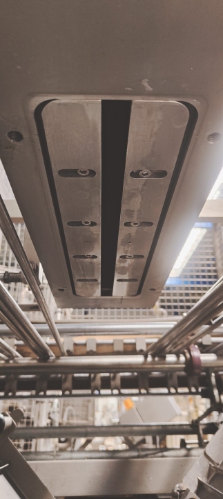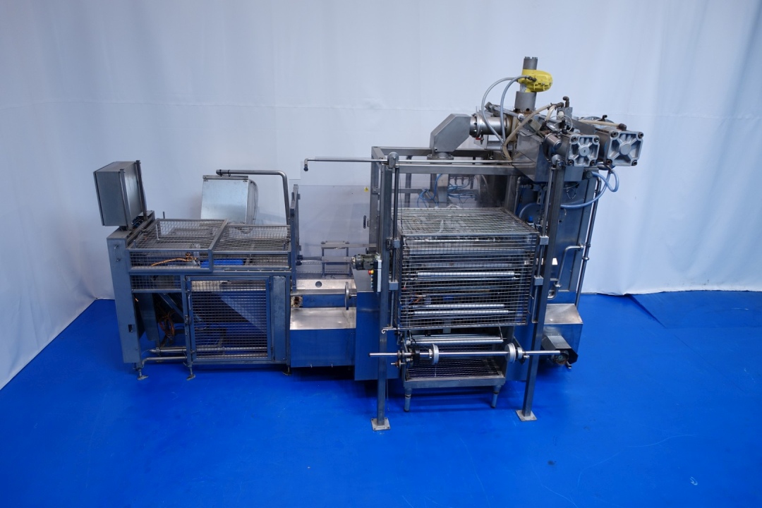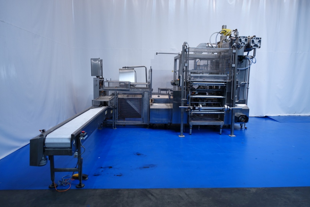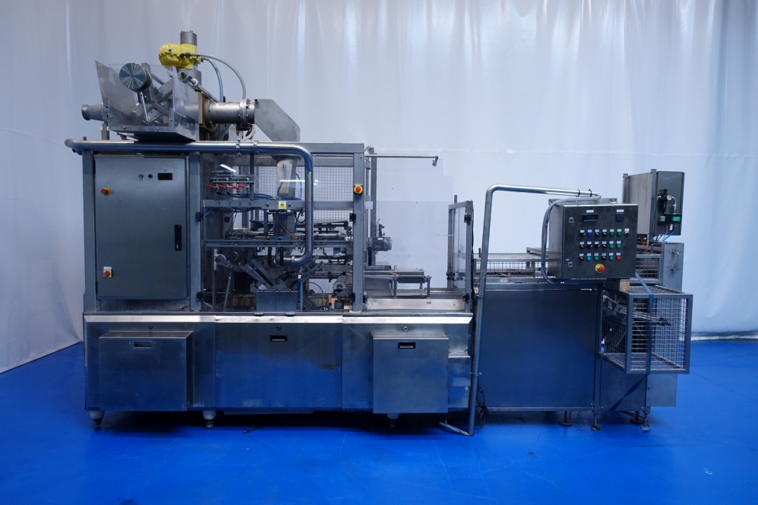 Full automatic sheet / Plate / Slab shapped pack Butter Filling and wrapping machine. Weight per pack 2kg each dimensions plate: 380x 285x 20mm,(lxwxh) in Paper - Alu foil or parchment paper (special Backery butter). Piston doser direct mounted on top of wrapper, CIP cleanable with a CIP counter piece on outlet of doser mouth piece. A compensator with contact to stop feed pump and CIP return pipe. In the unit a hotwater set (electric heated to make and circulate warm water through the jacked filling mouth piece) is installed. Photocell and print centring device on paper feed. After the Filler a 'custom build', automatic stacking unit, to stack 5 plates onto each other is made. Outfeed conveyor length 368 cm - width ca. 30 cm. Wrapper upgrade in 2000, Control panel with PLC control, Siemens Simatic S7-1200, last upgrade in 2021, including the speed control of the feed pump by potentio meter. CIP piping and a drain valve, + set of spare parts with gaskets and roller bearings. Total dimensions with outfeed conveyor: 490x480x310cm (lxwxh) - Total weight: 3.908 kg, wrapper-doser only weight 3.640 kg.