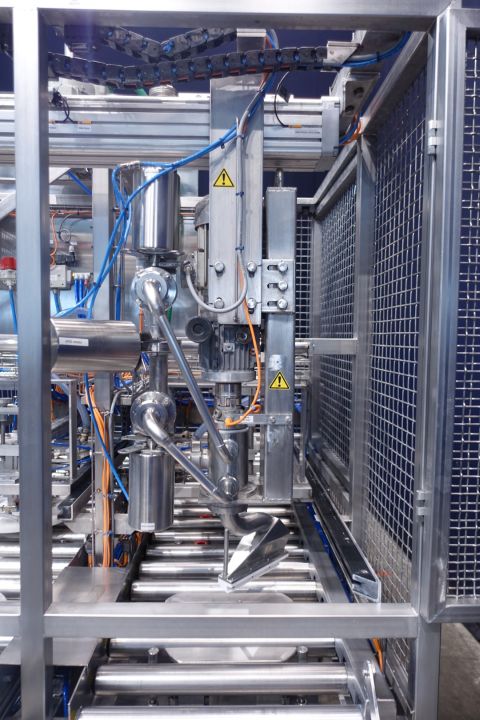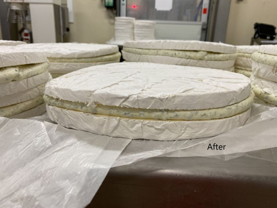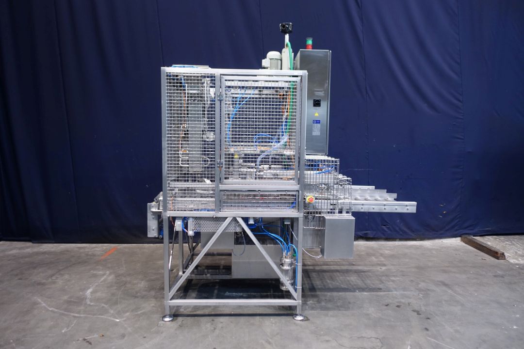Soft cheese cutting and stuffing machine. 140 Pieces Brie per hour per belt, in total 300 pieces with 2 belts. Power: 5,1 kW - 15,7 A - 50 Hz - compressed air 25 L/min - 6 bar. Total dimensions: 262 x 155 x 282 cm. Weigth 870 kg's. Unique design machine for making stuffed cheese from a standard semi soft cheese like Brie, Camembert or Columbier etc. A round cheese with a diameter of around 330 mm and with a weight of around 3-5 kg are cut, stuffed with a pumpable cream cheese. Working principle: inlet by a roller conveyor, then cut the cheese in half horizontally. Pick-up the top of part of the cheese and lift it. Then the underside of the brie is stuffed with a layer of a viscose product like a pumpable cream cheese or processed cheese. The last step is to place the upperpart of the cheese back on top. Ideal for ‘bites’ like products with different cheeses mixed. Stand-alone unit. Including SS safety fences, CE marked. Including Siemens S7 and HMI control panel. A video of the machine in production can be send on request.