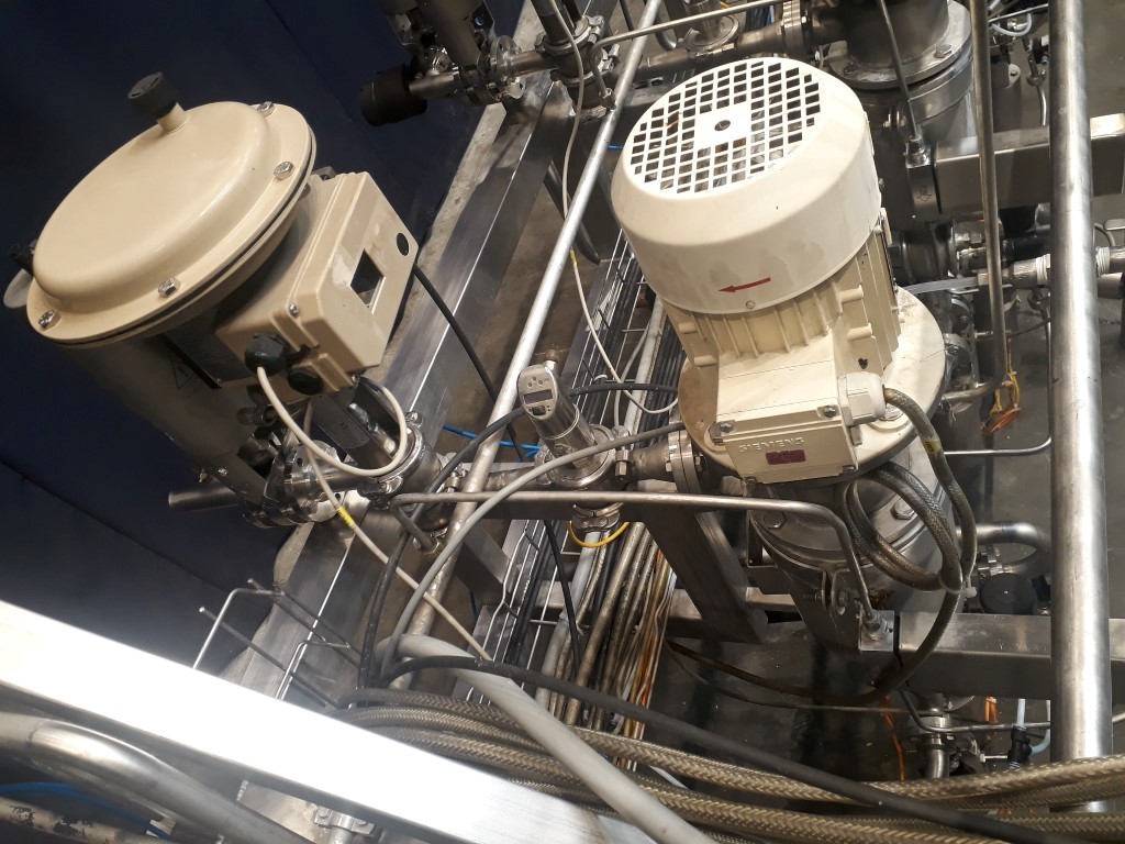Inline mini fruit mix and foaming machine, Aseptic design. Head dimensions: inner diameter 100 mm and length: 150 mm. Volume: 4 ltr. Single jacketed. Main motor 0,75 kW - 1,93 A - 1418 rpm. Max temp. 100°C. Max pressure 6 bar. Connections for insert of sterile air / nitrogen, flow transmitter for air, pressure transmitter (IFM) on outlet and counter pressure valve (Samson). 4 pieces mounted on 1 frame (STN13482 + STN13483 + STN13484 + STN13485) , can be used as small foaming machine or as a set for a 4 line machine to feed 4 different products. Total dimensions 4p 130 x 310 x 230 cm.