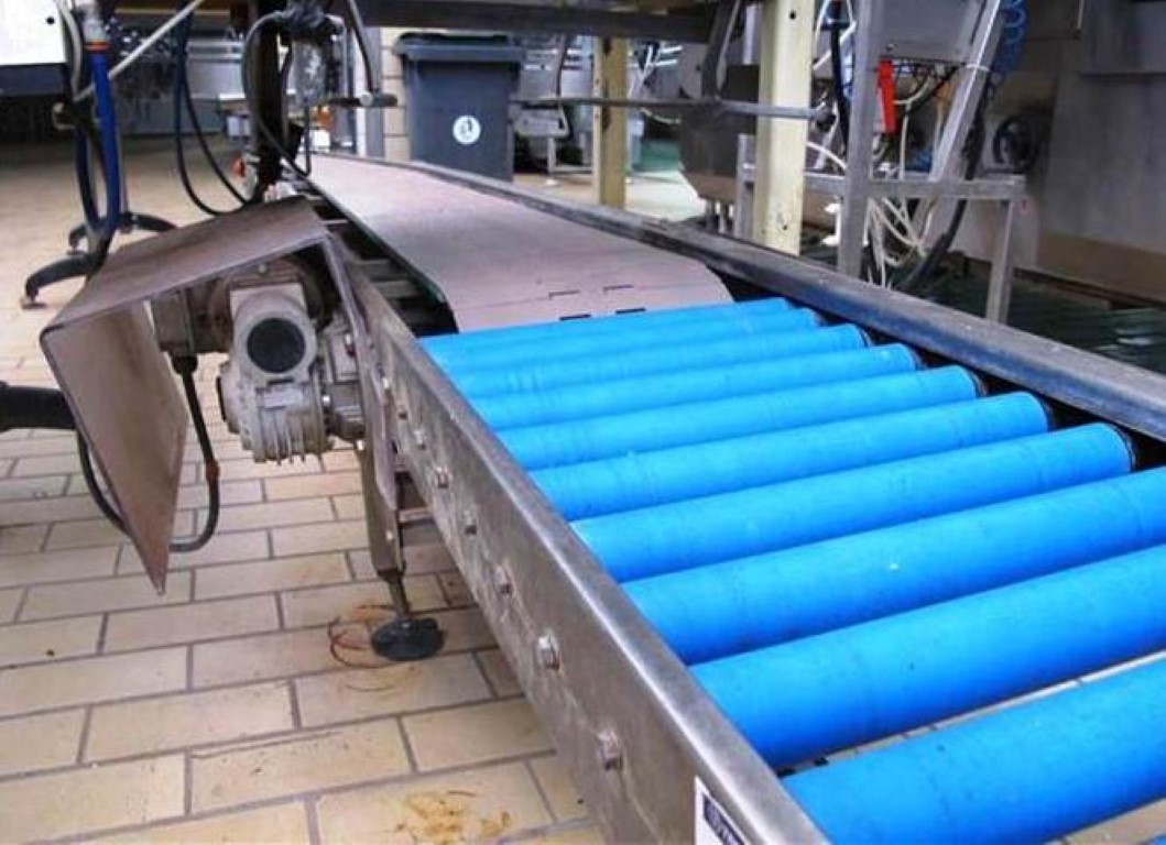 stainless steel framed plastic chain belt conveyor, dim 5.000x300mm, with roll conveyor,belongs to stn9733