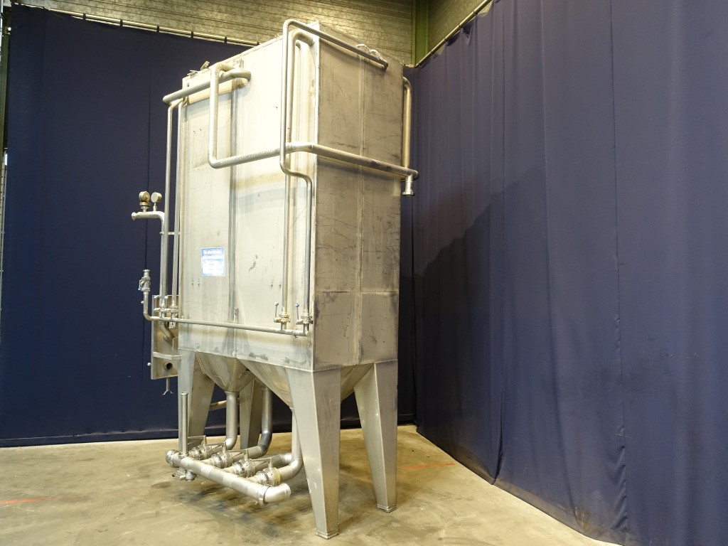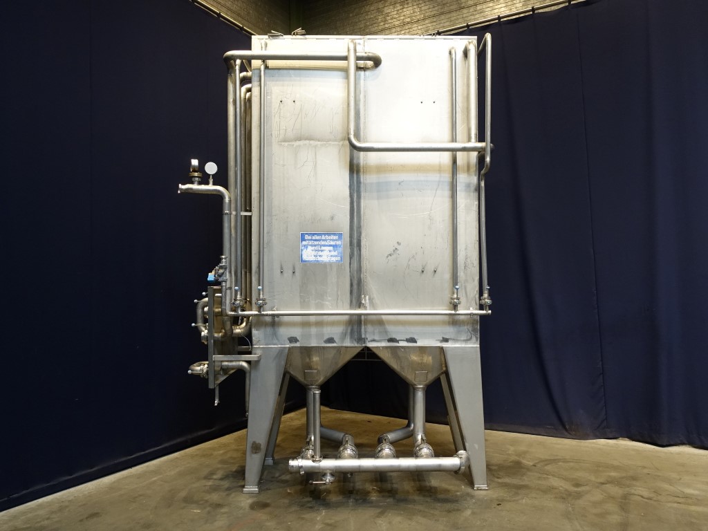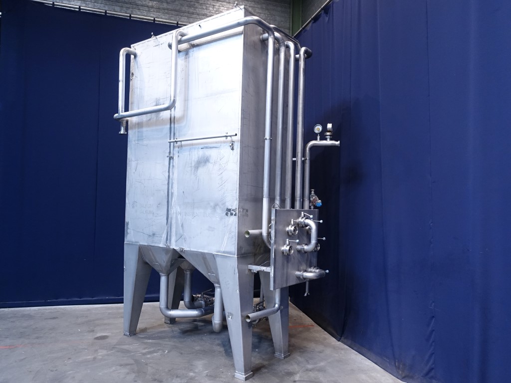 Multichamber vertical, single jacketed tanks (4 pieces of 1.200 ltr/each), No propellor, no cover. CIP water outlet 4x DN100 with manual butterfly valves, flowplate. Dimensions per tank lxwxh: 50x94x250 cm. Total outer dimensions lxwxh: 100x250x370 mm.