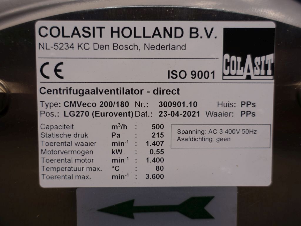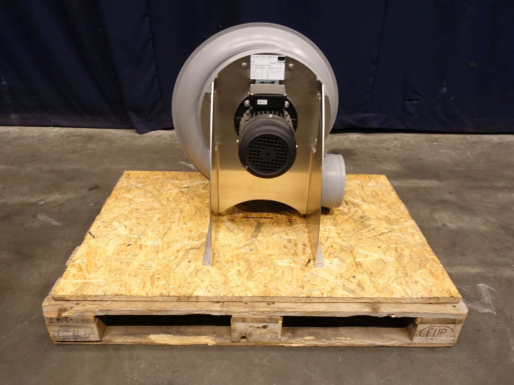 New blower. Max 500 m3/hour. Pressure 215 Pa. Speed fan 1407 rpm. Motor power: 0,55 kW - 1,5 A - 1.400 rpm. Temperature max: 80 °C. House and fan: PPs. Connections diameter 200 mm. 2 Reducers to diameter 180 mm. Complete with flexible connection cuff, diameter 200 mm. Total dimensions: 60 x 48 x 68 cm.