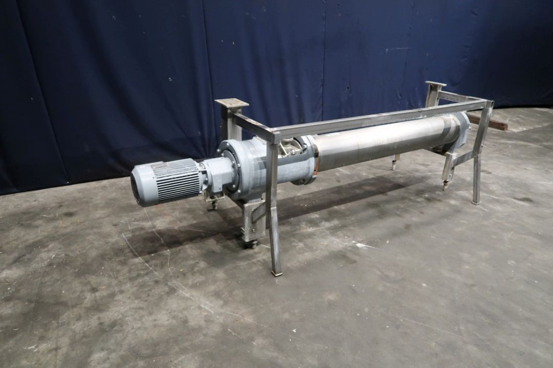 Scraped surface heatexchanger with 1 product cylinder, in stainless steel, tube diameter: 165 mm, length 1,830 mm. Rotor with 4 scrapers. Surface per tube 0,84 m² and volume per tube 40 ltr. Pressure: 150 psi (10 bar). Temperature: 400 °F (200 °C). Drive motor: 10 kW. Previous used for heating/cooling of food products (sauces/concentrate). On a stainless steel frame. Total dimensions: 310 x 110 x 90 cm. STN14965 was orginally mounted on top of this machine.