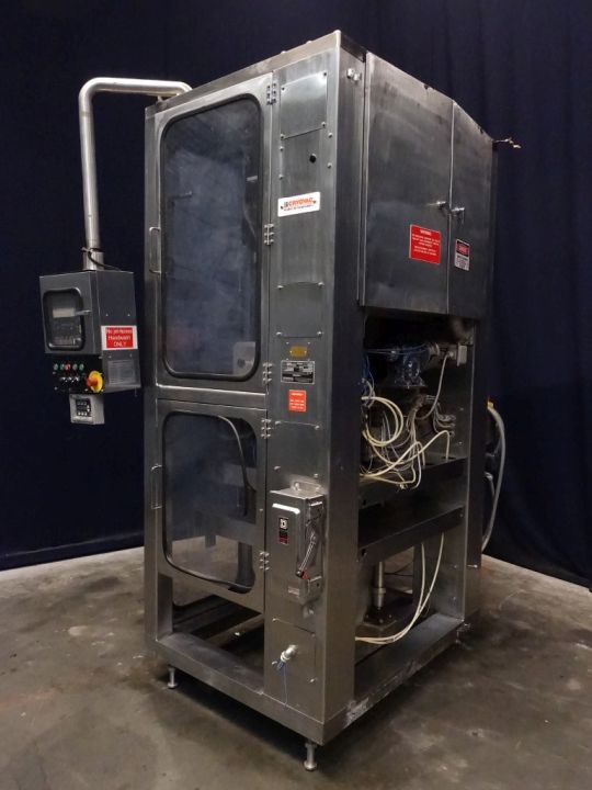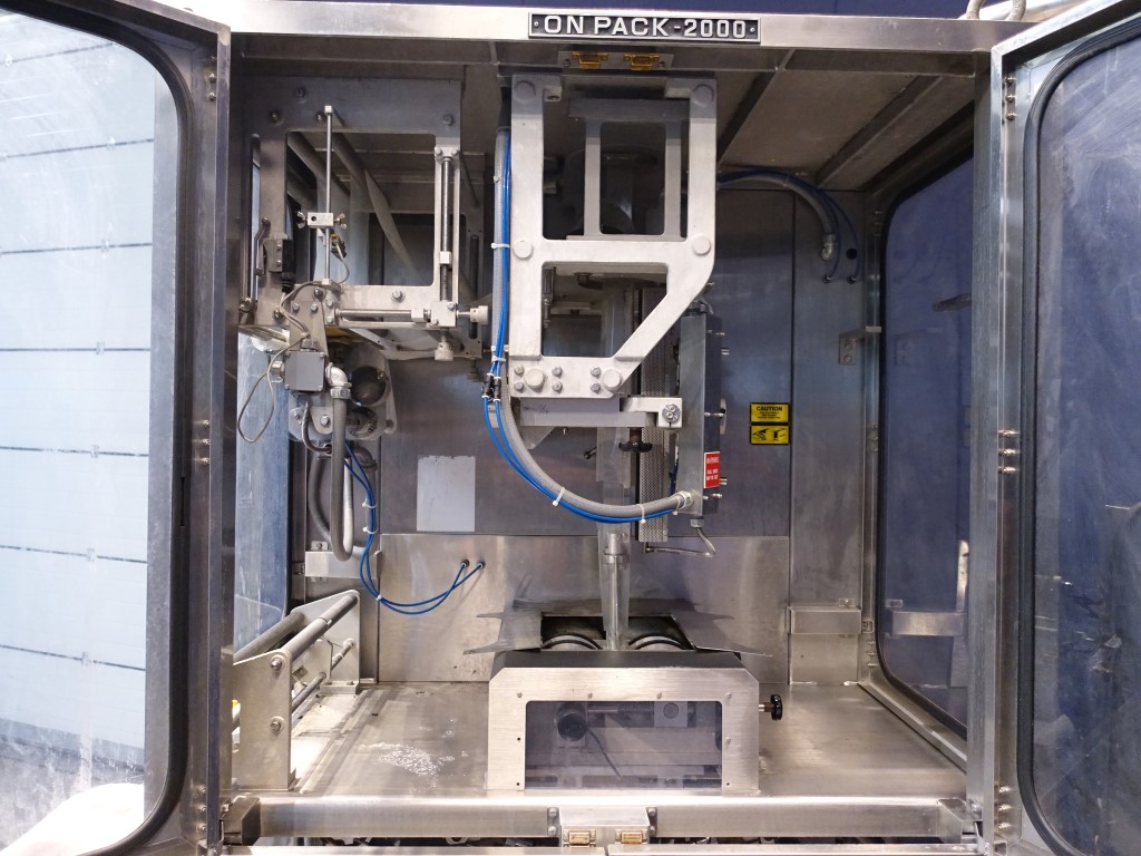 Vertical Form, fill, seal, machine, for big pouches/bags for hot fill, model number RC2000B, DIAG number PEHOE026, serial number 0067, 3 phase, 230 volt, 60 Hz, air 30 CFM, 90 PSI, 5000 Amps, all stainless steel construction, 2 1/2 " diameter tube for 4" (101 mm round) wide pouch, 1" product inlet, roll stack feed, dual sealing jaws, with controls. Total dimensions: 140 x 230 x 290 cm. This unit has the unique feature that it seals through the product so no air inside of the pouch.