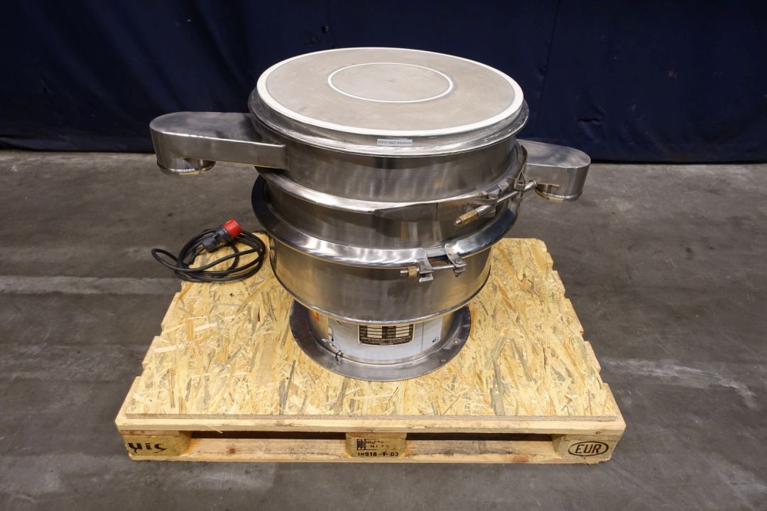 Rotary Vibration Screen-machine. For sieving particles. Incl. 2 x 30 inch food safe sieve windows. 1 x Mesh size: 42 micron - wire thickness: 36 micron (material: AISI 304). 1 x Mesh size : 63 micron - wire thickness : 40 micron (material: AISI 304). Vibrating force: 5 Kn - amplitude: 3-5 mm. Power: 380 V - 0,55 kW - 50 Hz. Connections: 2 x 120 mm - 1 x 130 mm - 1 x 11,5 mm. Total dimensions 120x80x70 cm. Weigth 126 kg. Capacity estimate up to 10,000ltr/h depend on product
