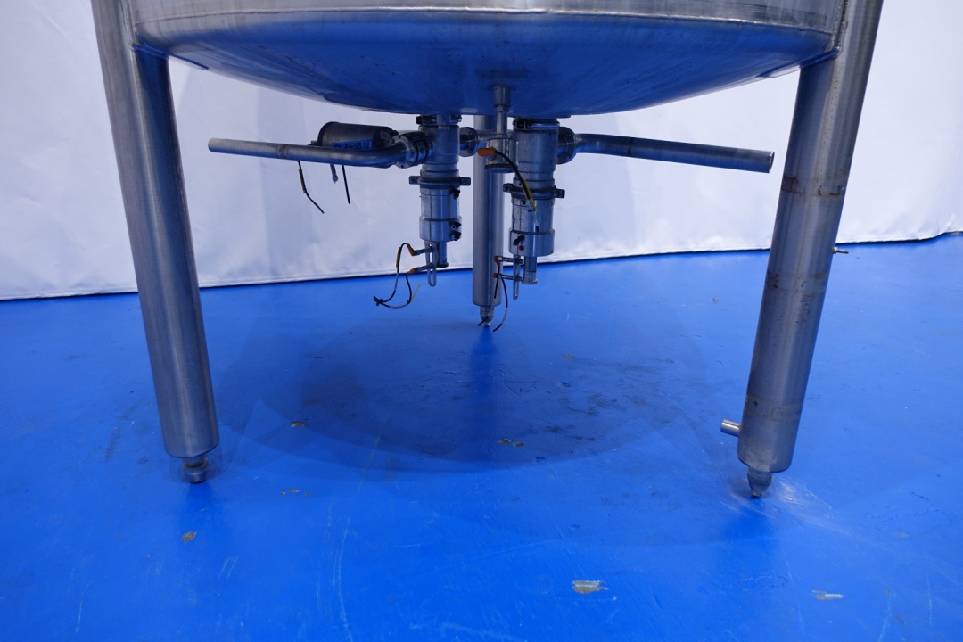 Vertical single jacketed storage tank with agitator. Nominal volume: 2.100 liter. Maximum cleaning temperature: 85°C. Top driven propellor agitator, Jongia type: JDR 7,5/4B - built in 2012 - motor: 5,5 kW - 12,5 A - 710 rpm. With pressure transmitter in bottom. 2 CIP spray bowls of which one in product air-inletpipe. 3 Adjustable feet. Outlet height ca. 71 cm. With 2x Bottom double seat mix proof outlet valves make: hovap with 2 position sensors. Each valve has 2 connections to be able to flush the outlet pipe even when tank is full. Manhole in top round Ø 51 cm. Inside dimensions of tank: Ø 120 cm - cylindrical height: 125 cm. Total dimensions (lxwxh) 150x150x320 cm - weight: 508 kg's.