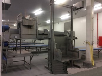 Lift / elevator for Dolav boxes. Tipping at height 2100 mm. Max box size 100 x 120 x 80 cm. Including conveyor belt. Belt length 500 cm and width 80 cm.