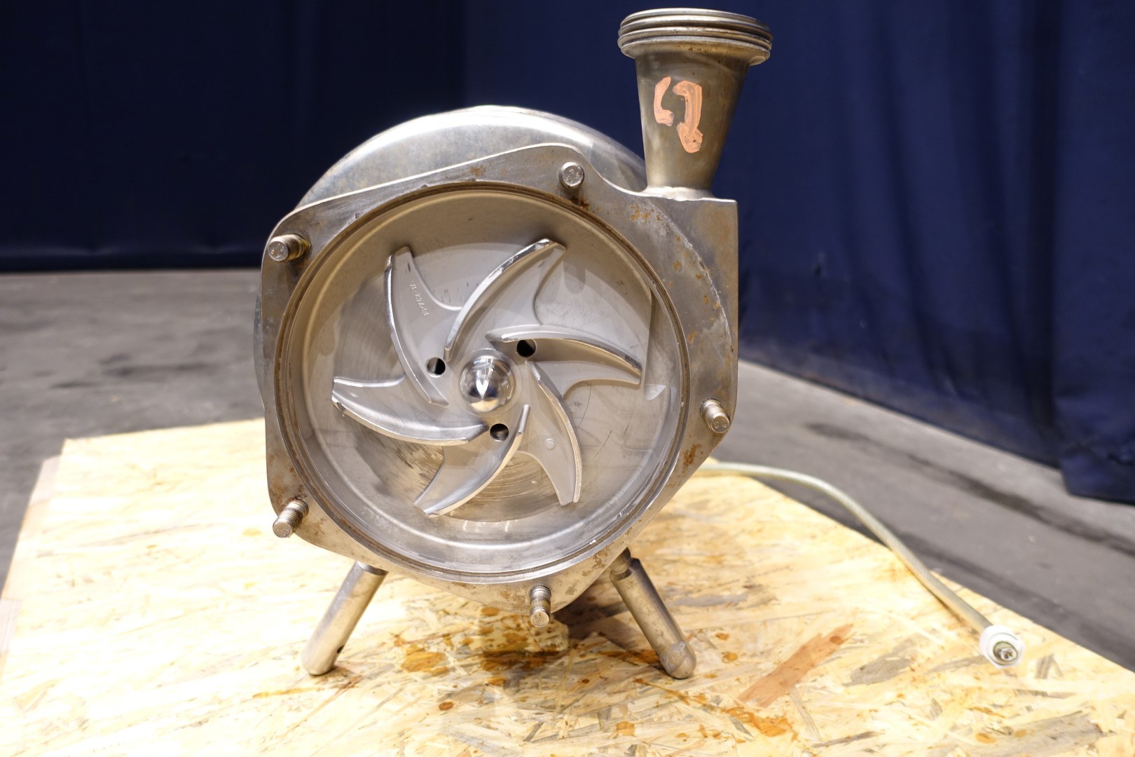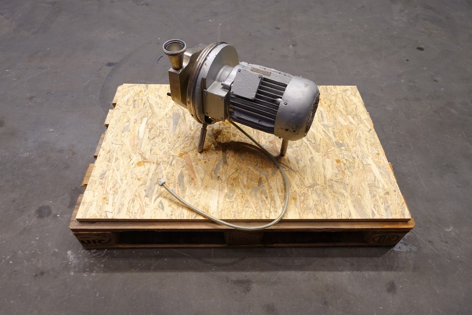 Sanitary centrifugal pump. motor: 5,5 kW - 12,5 A - 2.900 rpm - 50 Hz. Impellor diameter: 175 mm. Approx 4 bar. Connections: (in) 2" Din / (out) 2" Din. Total dimensions: 71x30x42 (lxwxh) cm.