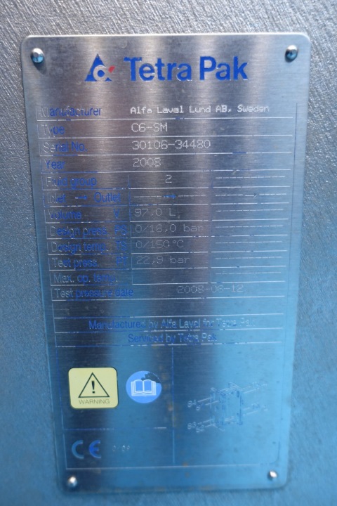 Plate heat exchanger, sanitary (PHE). Max working pressure: 6 bar. Beam length: 165 cm, connections: 4x2" Din. Current configuration: 1 Section: 50 plates. Connections follower: 2 up/2 down. Dimensions: 38x17,5x57 cm - weight: 49 kg.