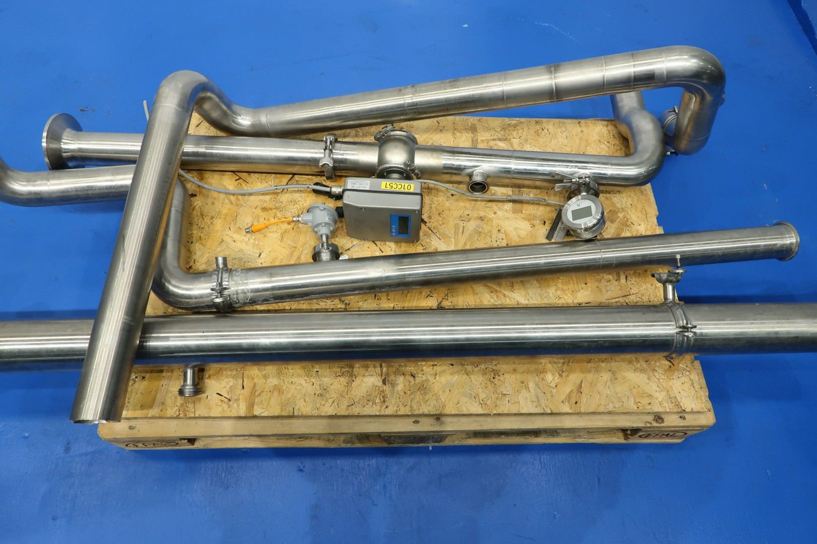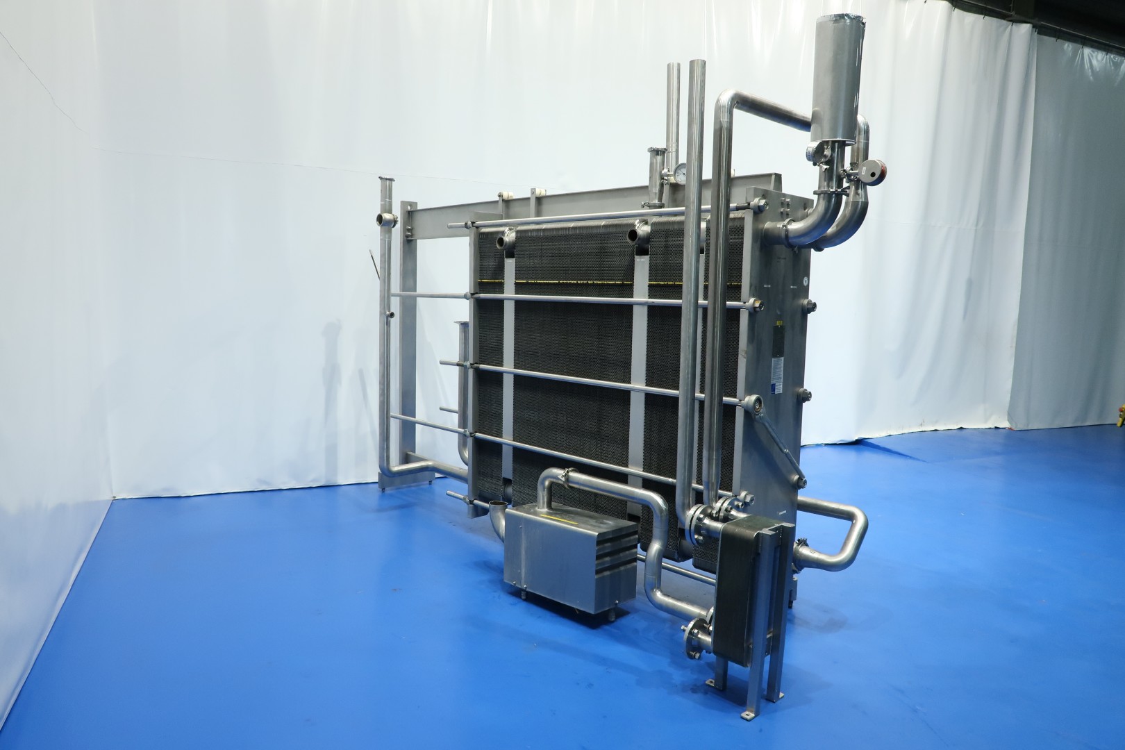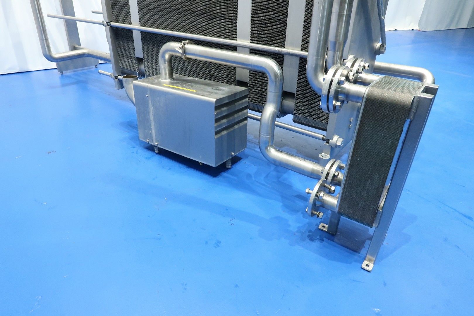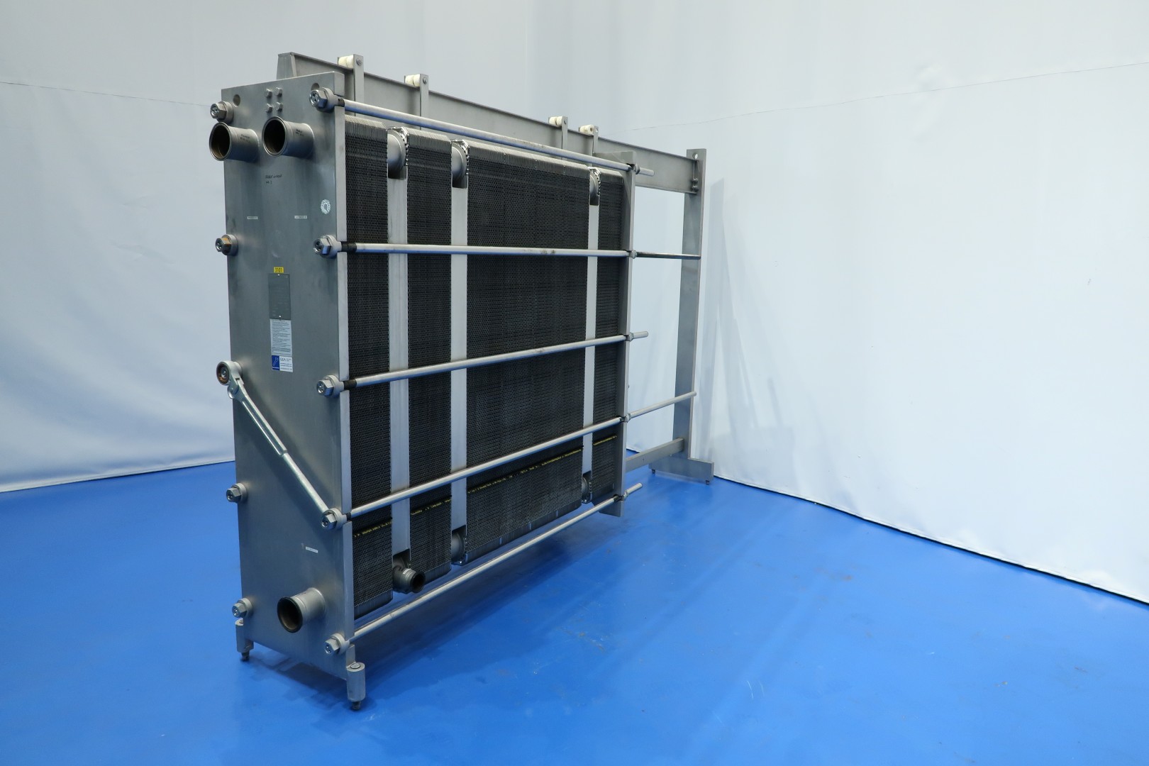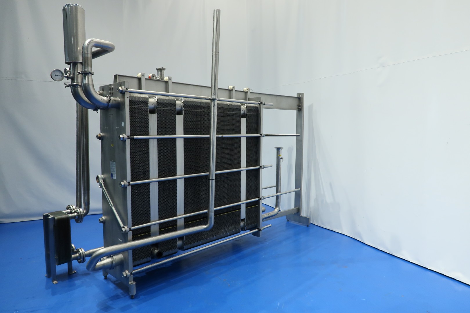 Milk pasteuriser unit, with Plate heat exchanger, sanitary (PHE). Max pressure: 13 bar - max temperature: 110°C. Beam length: 313 cm, connections: 6x 4" Tryclamp and 3x 2,5" Tryclamp. Current configuration 4 Sections regeneration, heating and cooling: 66-65-239-66 plates (total 436) - Connections head: 2 up/1 down, follower 1 up/2 down. With 1 x matching ringkey. *Upper beam has a slight bend. Originally used as milk pasteuriser with hot water circulation pump (Grundfos NP8-65-125/124) and Gea brazed heat exchanger (GBS 700L-60), steam/hotwater, steam control valves and piping. excluding balance tank, pumps and control panel. Dimensions PHE: 332x66x222 (lxwxh) cm - weight: 3.490 kg.