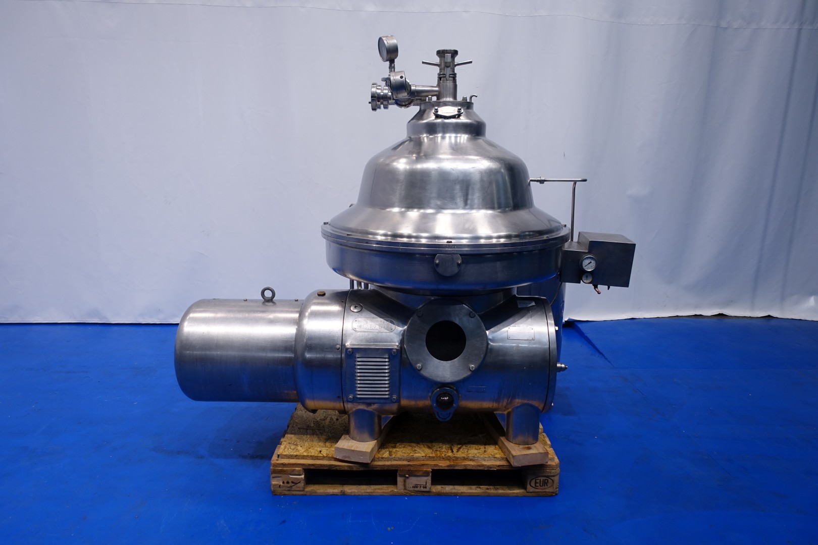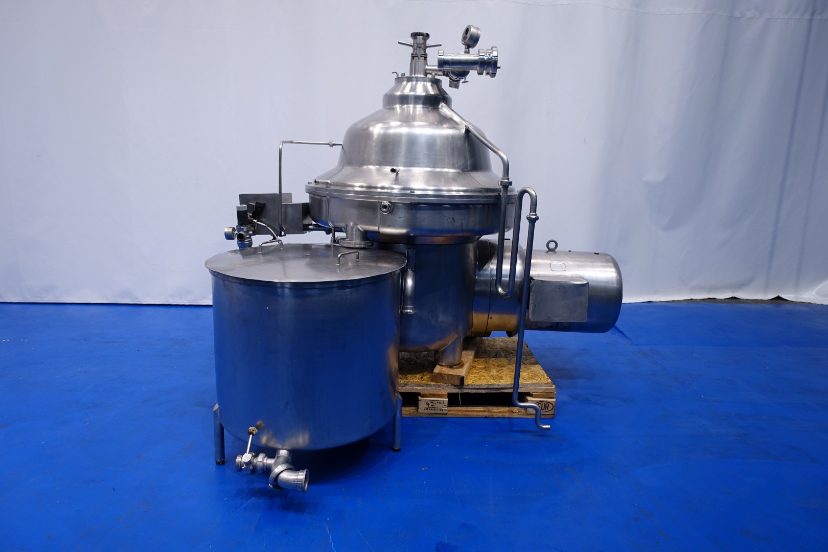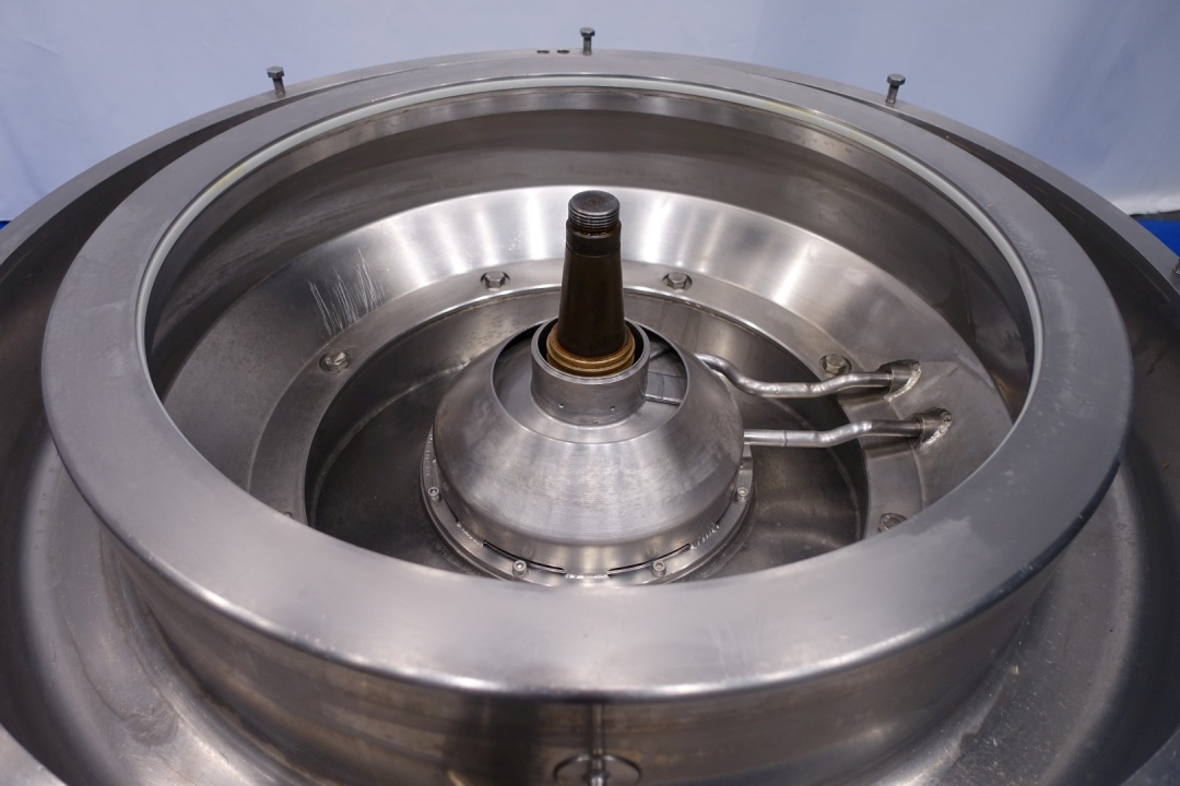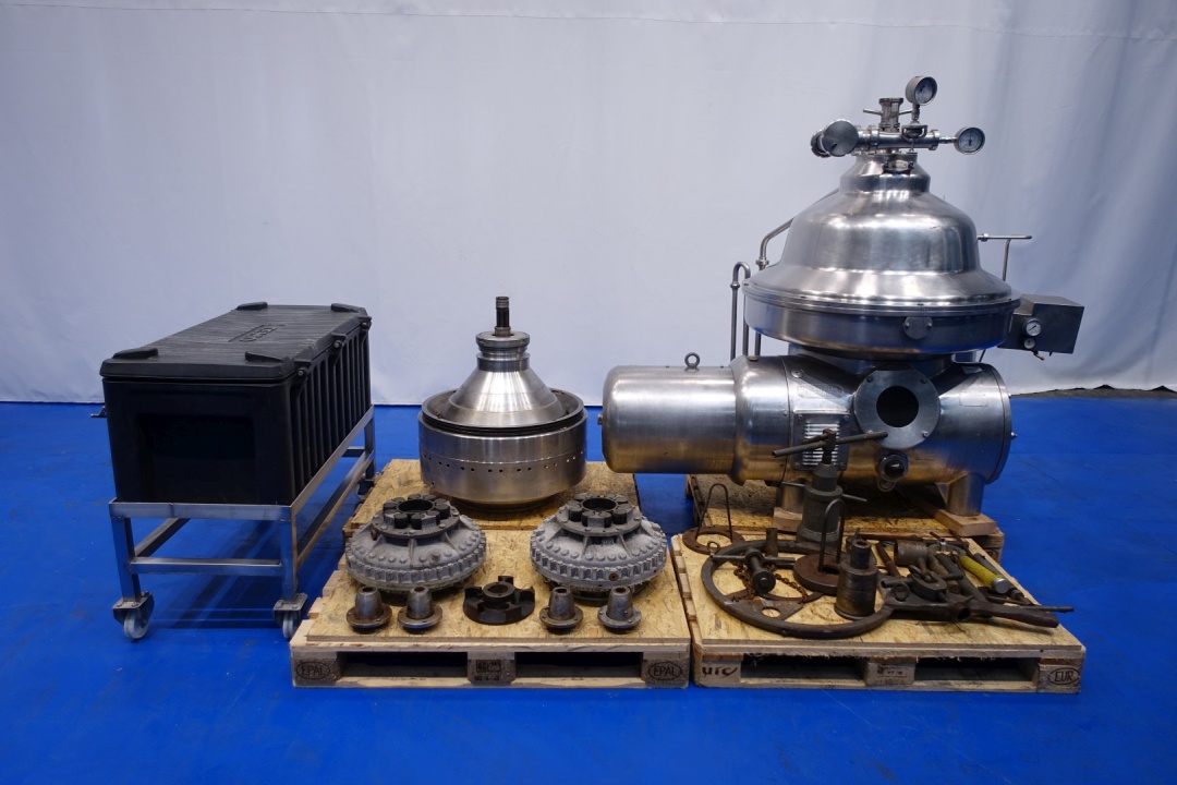 Milk or whey clarifier, self cleaning. Including bowl, bowl speed: 4.700 rpm, motor cover, feet, collecting tank, pneumatic pressure valve milk/whey, manouvering water valves. Motor 37 kW - 72 A. Set of needed tools with ring key. Excluded: base frame and pressing tool. Documentation: operating manual and spare parts list (in German) available. Total dimensions: 200x110x174 (lxwxh) cm - total weight: 2.549 kg's (all parts).