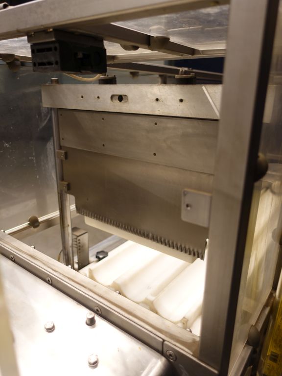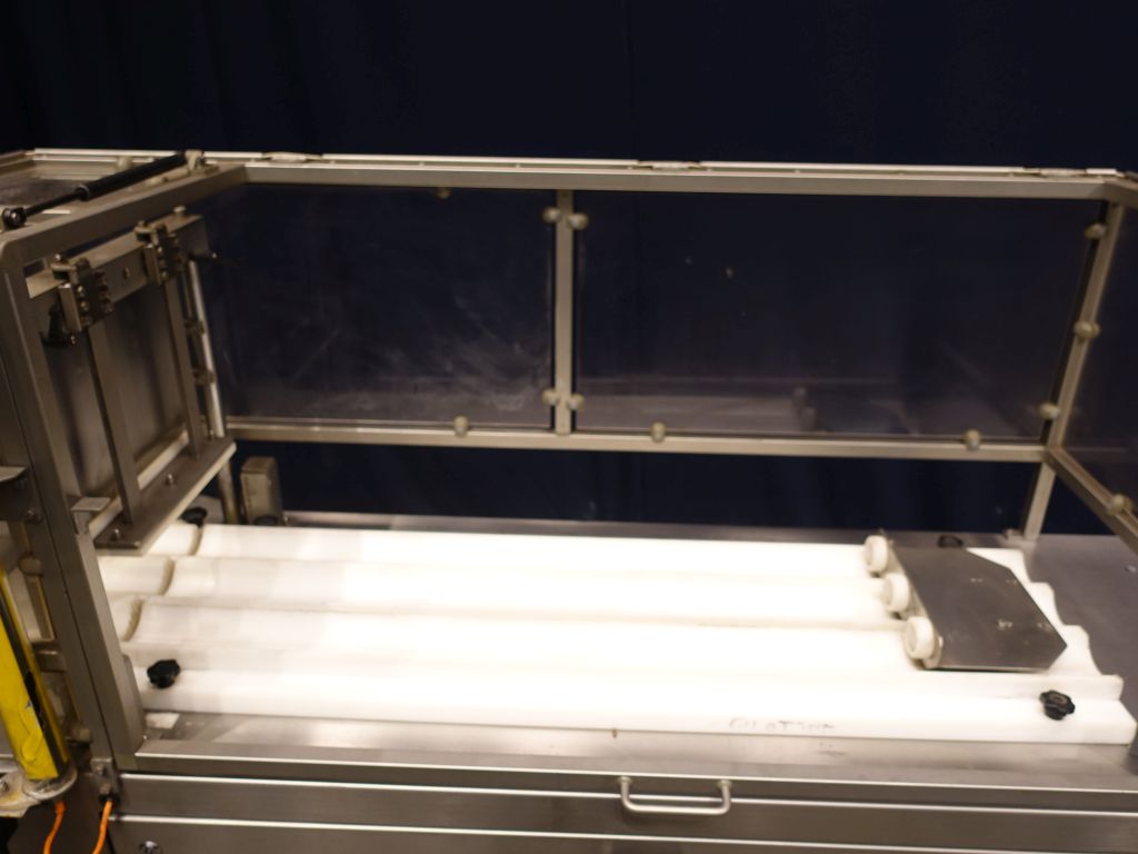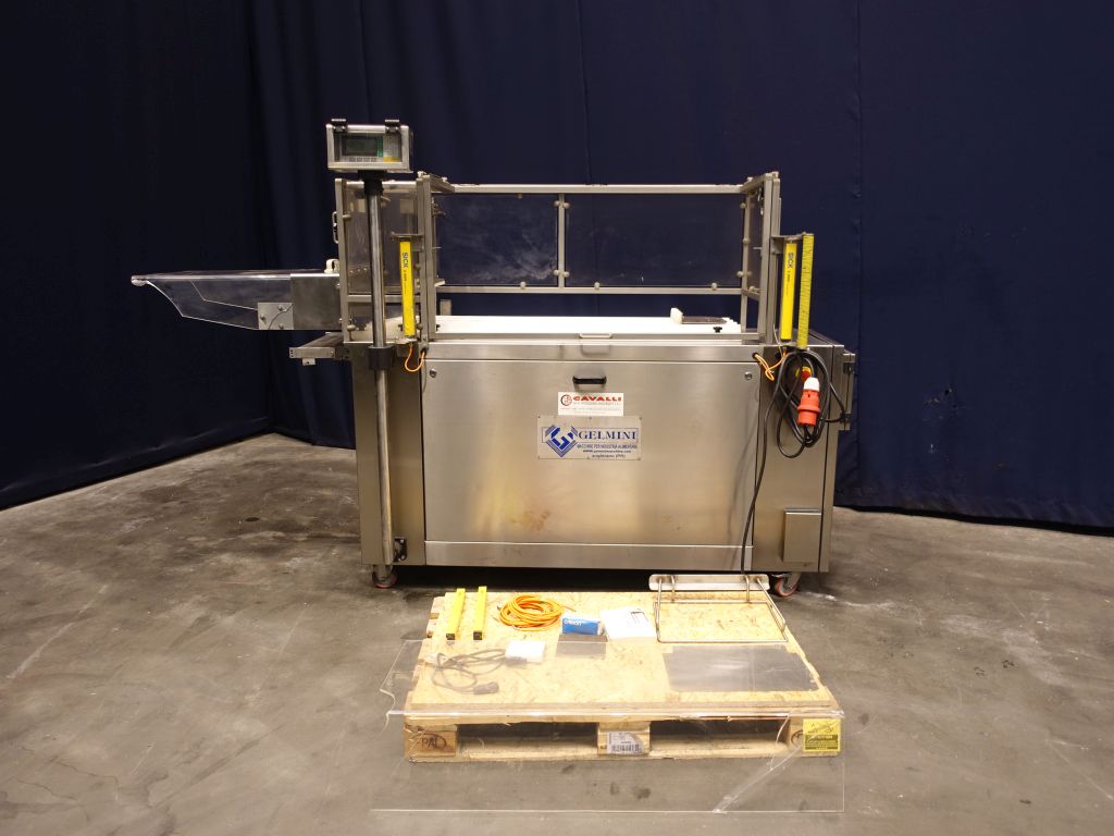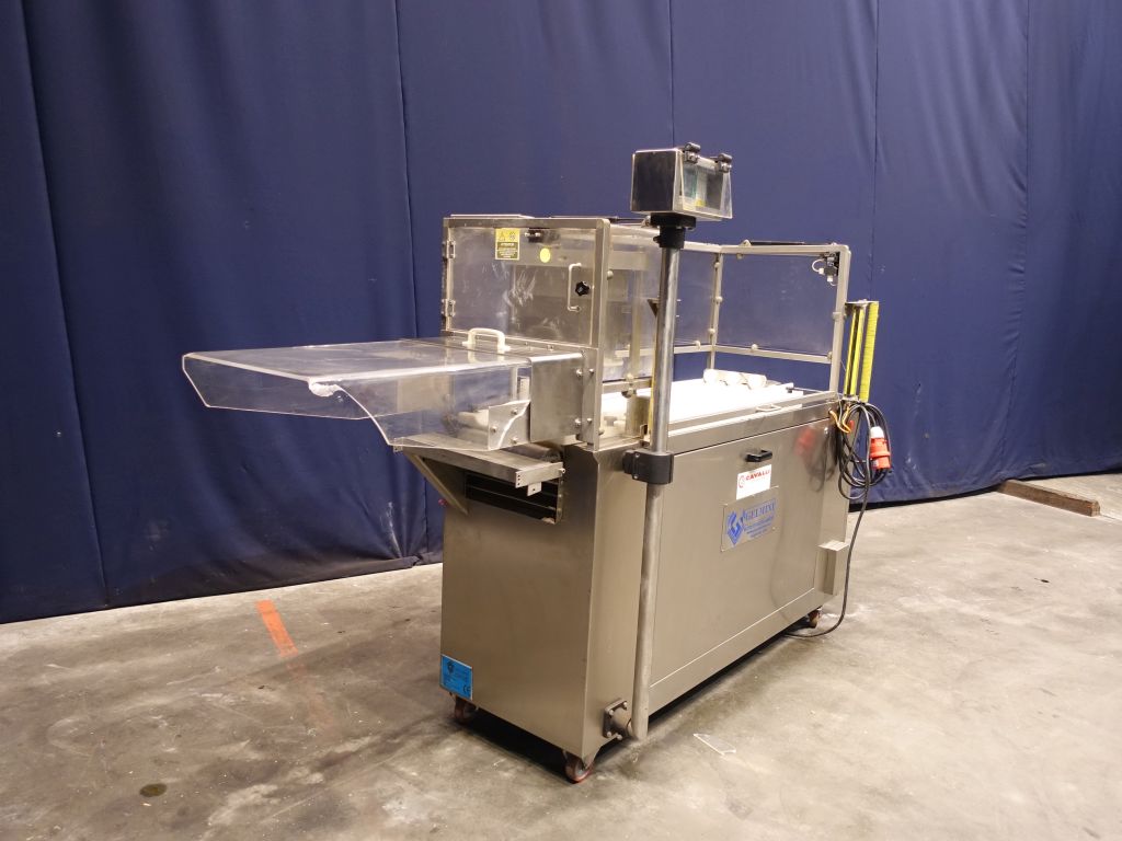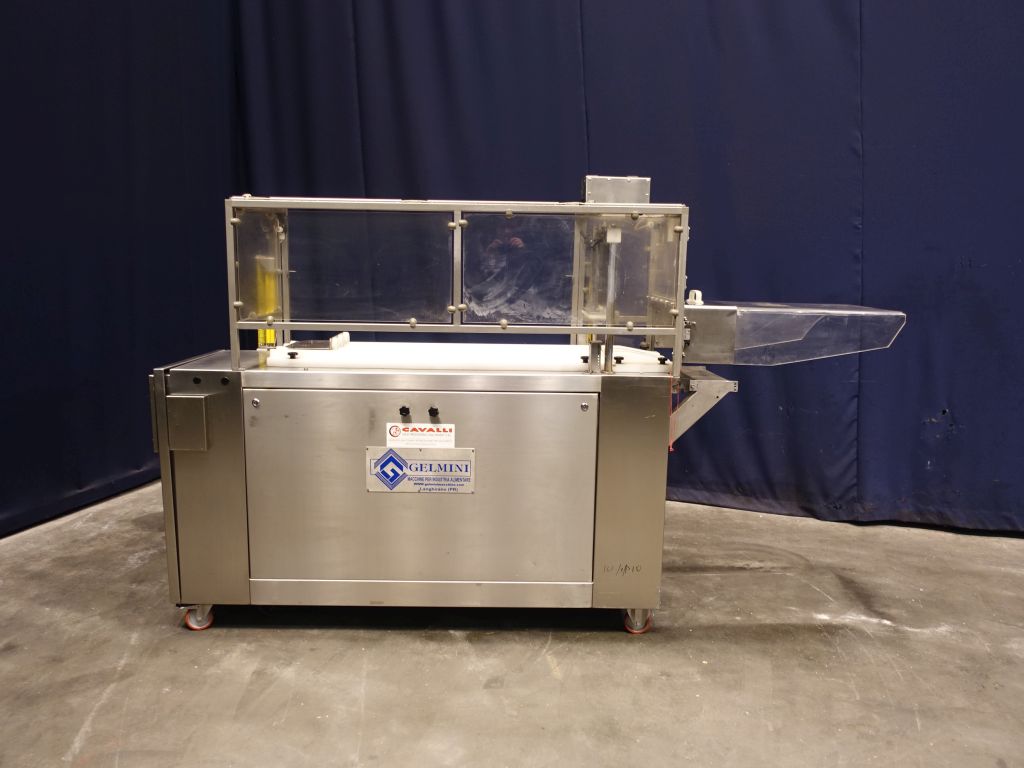 Automatic portioning machine. Productivity and precision in cutting chunks of cheese with different sizes and densities. Automatic machine accomplished for the cut in chunks of cold cuts (speck, raw and cooked ham, ciccioli, bacon, tenerone, and so forth) and cheeses (provolone, pancettoni, and so forth). Cutting roud sausages into pre-set length. Cutting 3 pieces at the same time. Manual infeed of the sausage. Max length of the sausage: 100 cm. Max diameter of the sausage: 95 mm. Sick protection system by infeed. Mobile. Total dimensions: 290 x 80 x 180 cm.