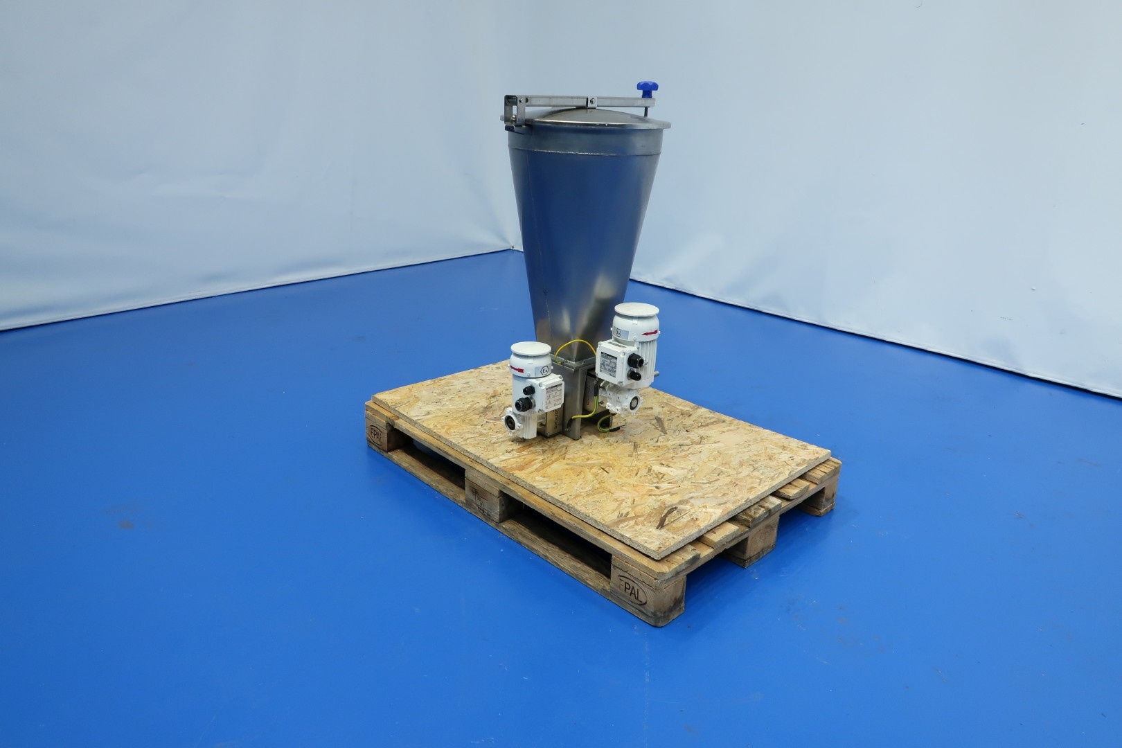 Dosing machine for powdery products. Hopper diameter 40 cm - heigth: 80 cm. Motor of agitator: 0,12 kW - 0,42 A - 50Hz - n1: 1.350 rpm - i 70 - n2: 19,5 rpm. Motor of outfeed screw: 0,12 kW - 0,8 A - 50 Hz - n1: 1.350 rpm - i: 13,5 - n2: 100 rpm. Currently outfeedscrew damaged. Total dimensions: 65x50x96 (lxwxh) cm - weight: 66 kg.