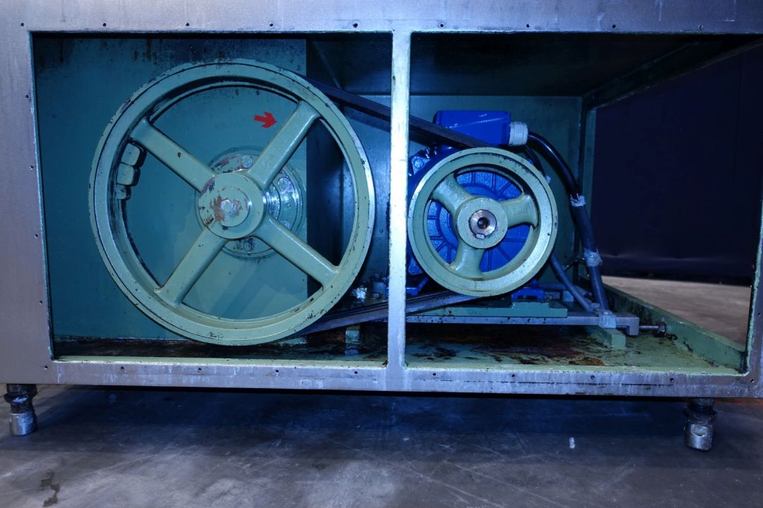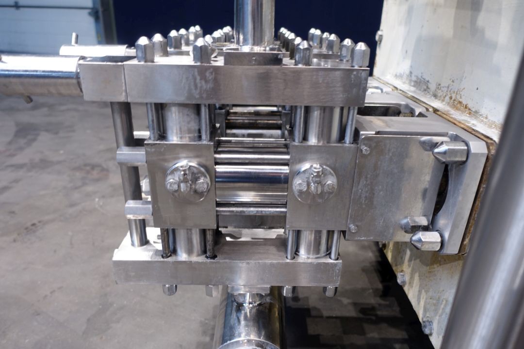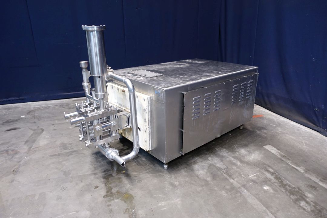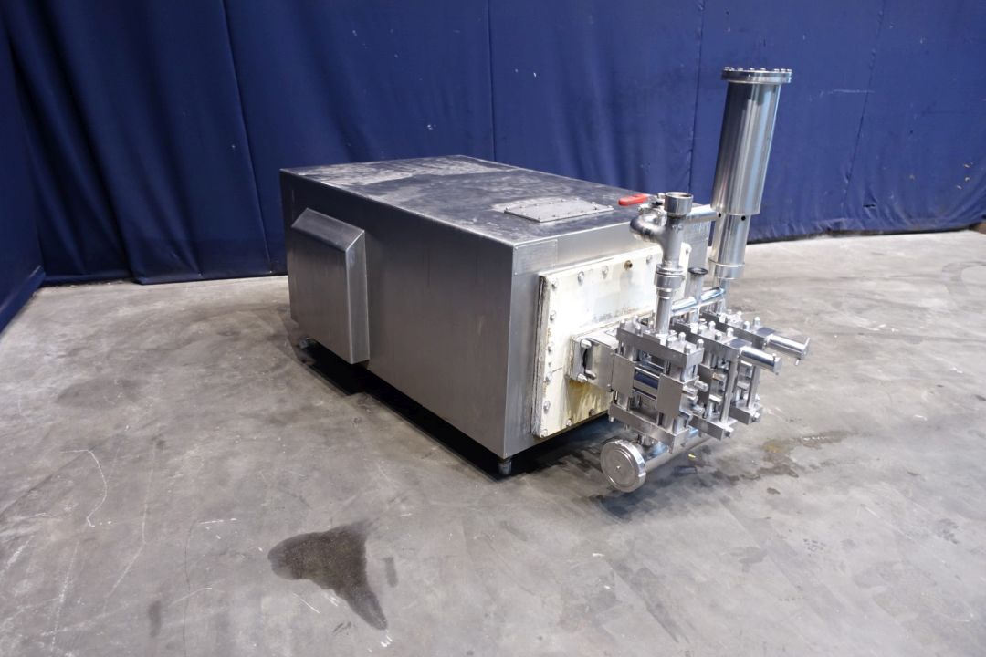 High pressure pump used for margarine emulsion. 2 Pistons have a overpressure valve and are manuel adjustable. Maximum pressure: 50 bar, temperature 100 °C. Motor: 22 kW - 38,8 A, Fored air cooling on motor. With bypass pipe and inlet filter. Stainless steel cladded with oil-level sightglass indicator. Connections: 1 x 1,5" Tryclamp, 1 x pipe Ø 51mm and 1 x Ø 57 mm. Excluded controls and documentation. Total dimensions: 210 x 100 x 125 cm.