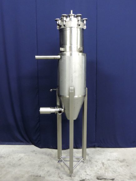 Vacuum tank. Flat to the side. Bottem product outlet, 3" tryclamp. middel-inlet 3" tryclamp, bottem-side outlet with pneumatic side valve 3 "tryclamp. Top connections 5 x tryclamp 4". Connections for: pt-100 temp sensor, pressure transmitter, high and low level, 1 cip spray bowl, manhole in top/side round diameter 45 cm. 3 Adjustable feet. Innner dimensions of tank: cylindrical height 136 cm, cylindrical and conical height 170 cm, diameter 45 cm. D.P.: 400kPa and FULL Vacuum Int., T.P.: 600kPa. Design temp.: 152°C. Outer dimensions lxwxh: 96 x 62 x 312 cm.