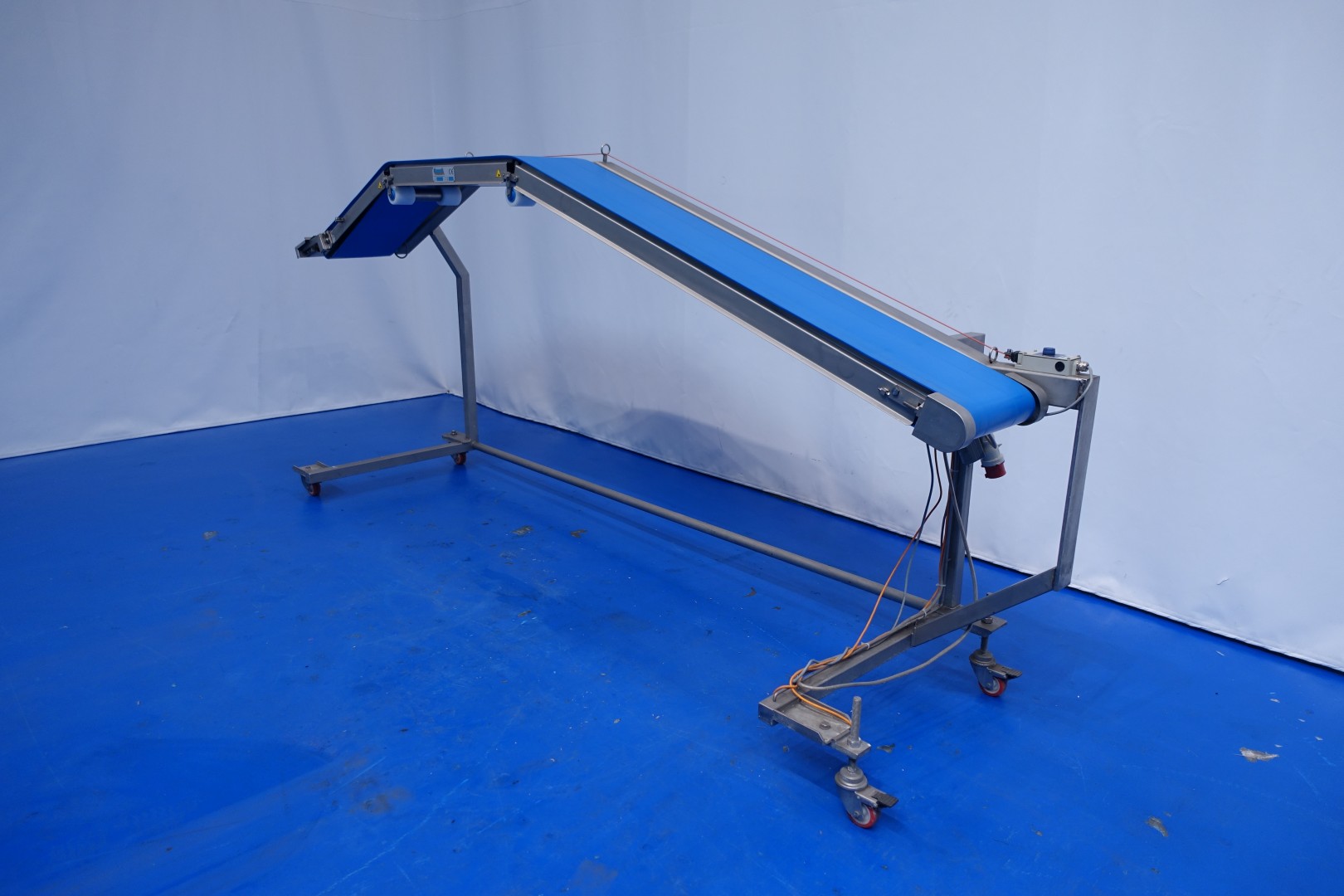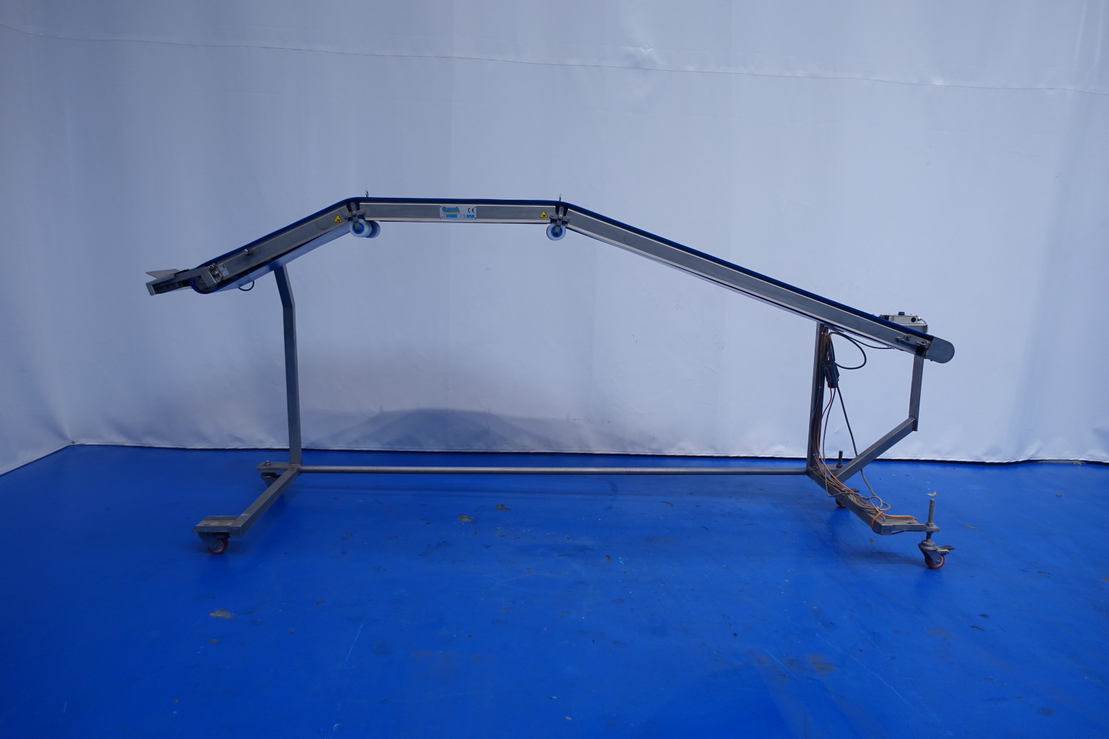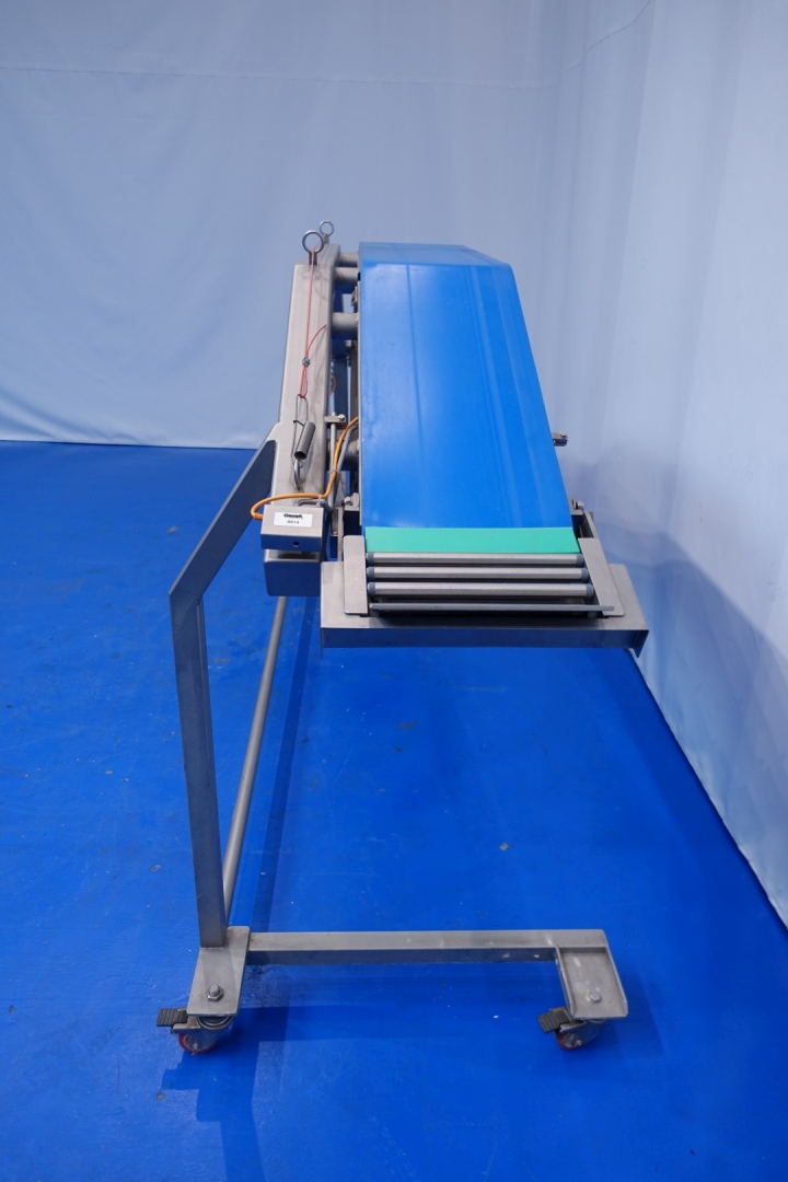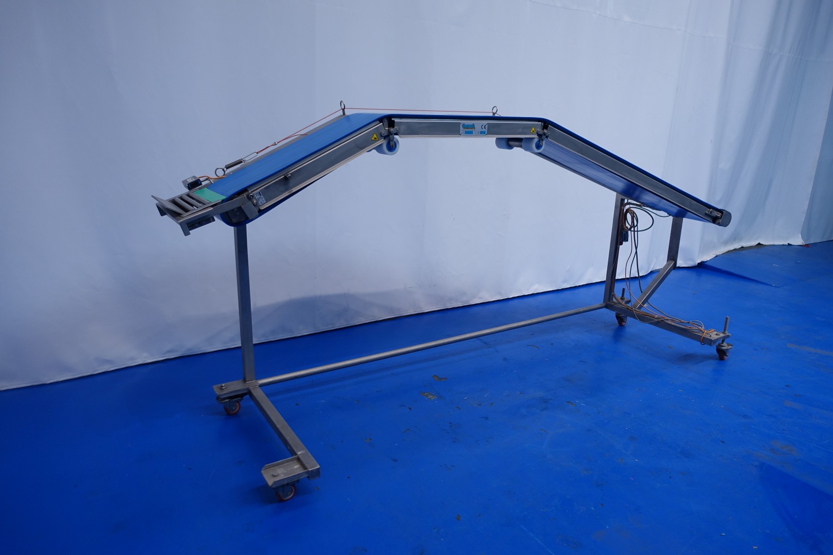 Mobile bridge shaped conveyor belt on SS frame. Belt width 30 cm, belt length total 355 cm. Free height middle under 145 cm. With safety-line-sensor. Motor power: 0,15 kW - 0,93 A - 230 V. Condition: Excellent. Total dimensions: 340x90x160 (lxwxh) cm - weight: 200 kg's.