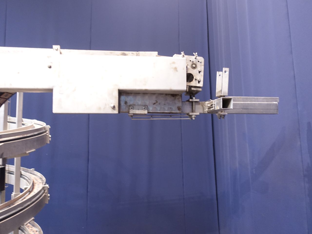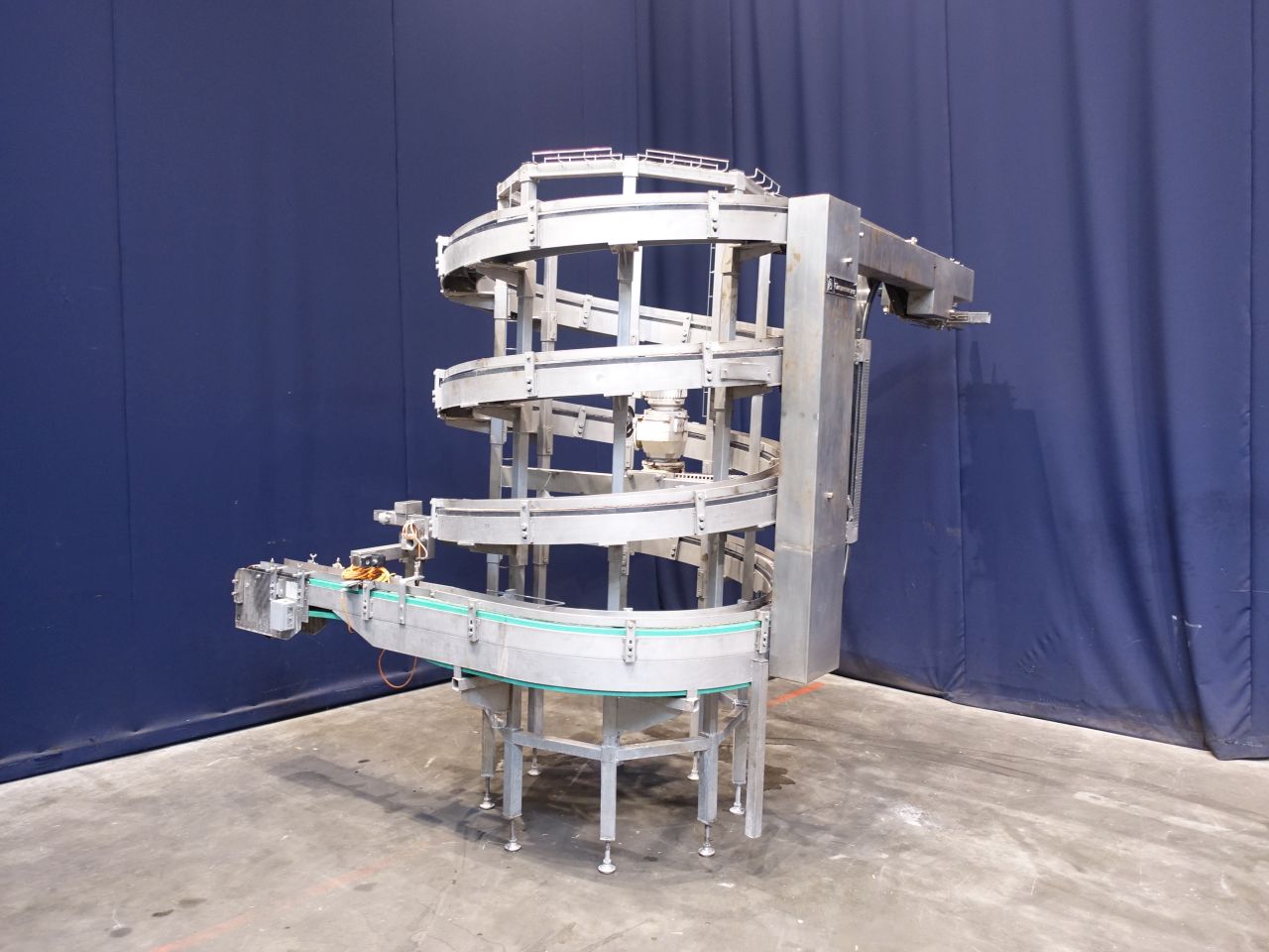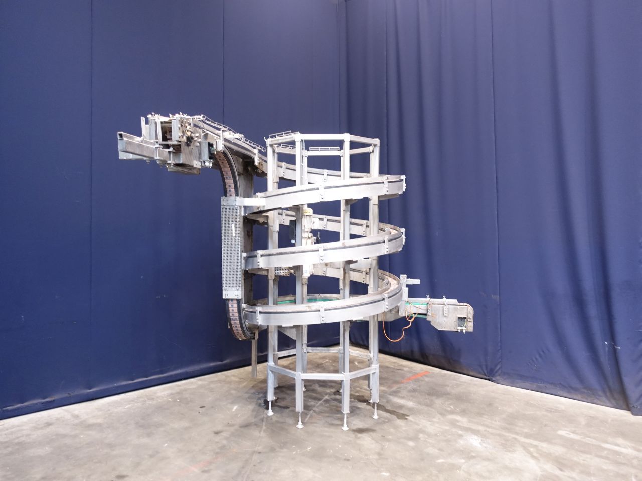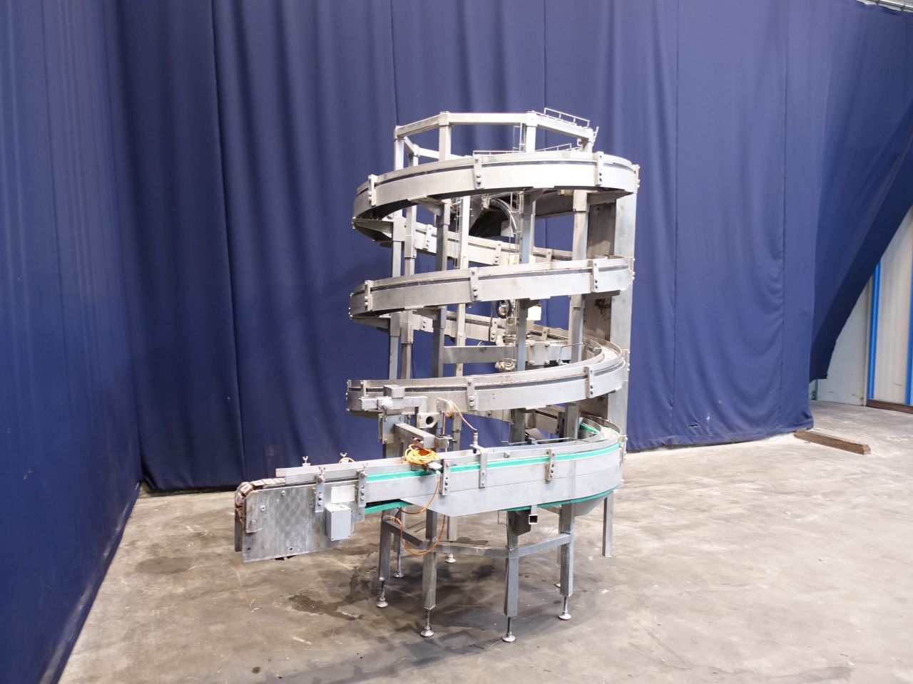 Upgoing spiral chain conveyor. Upgoing from: 93 cm to 230 cm. Effective Belt: width: 8 cm. Motor: 0,55 KW - 1410 rpm. Total Dimensions: 240 x 320 x 250 cm. Has been running together with STN14385, 14386, 14388.
