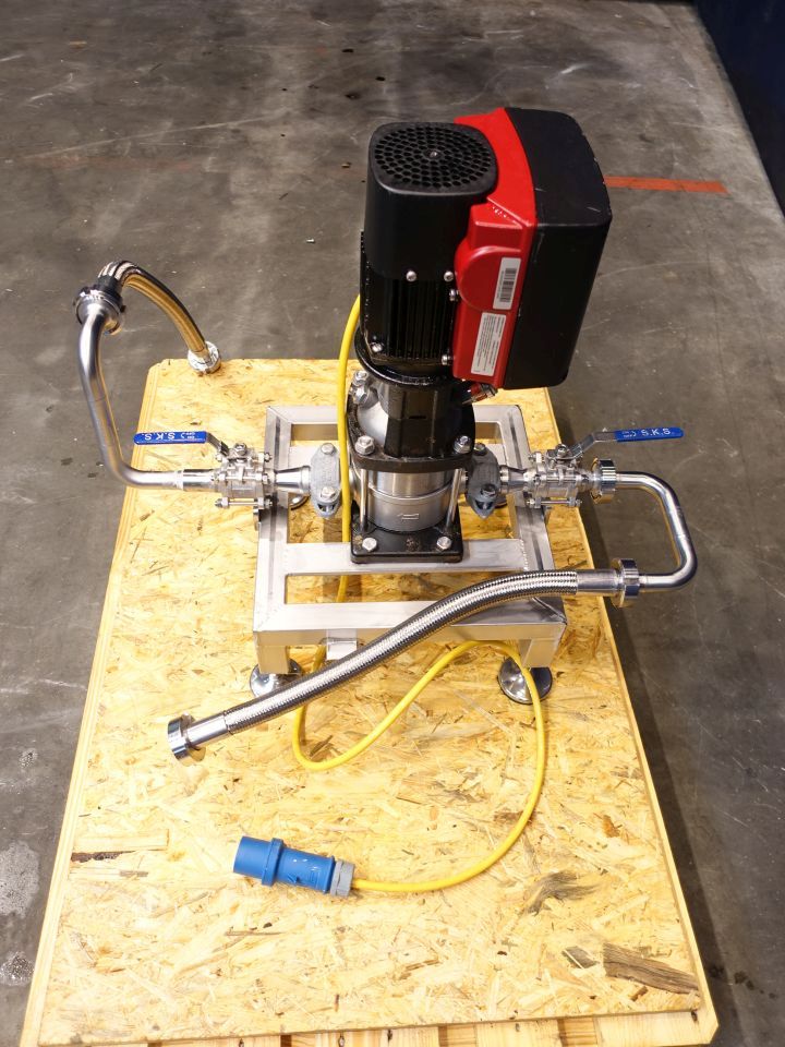 Waterpump. Non sanitary centrifugal pump. Current motor: 0,75 kW - 3400 rpm. Pressure 3,4 bar. Connections: 1'', DIN. Including frequency convertor on the motor.