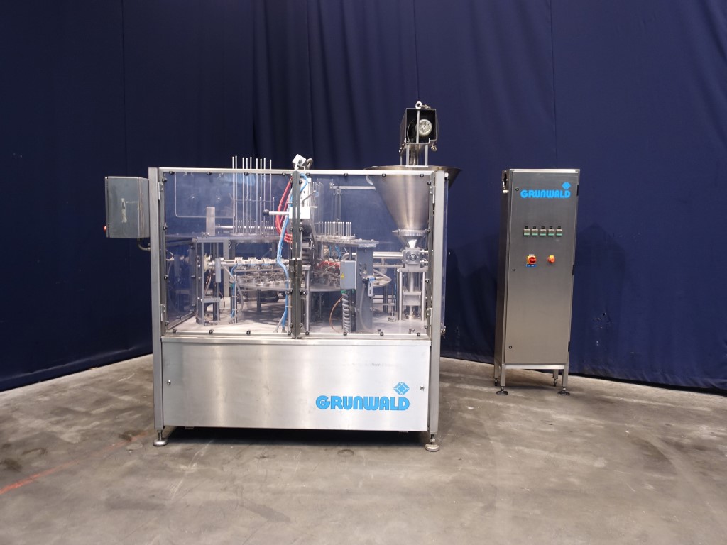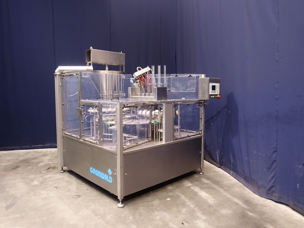 Rotatry filler with 4 heads. Cup size: 80mm with rectangular top. Stations: Cup destacking, no- or double detection, piston doser (50-250 ml) for viscose / thin liquid products with hopper and scraper agitator in hopper (manual cleaning), seal dispending by vacuum, tip sealing, heat sealing, etiket dispending by vacuum, snap-on lid, outfeed to outfeed conveyor (outfeed conveyor excluded). Machine has polycarbonate safety guards with sensors. Automatic central greasing system. Controls: Siemens S7 and Siemens Touch screen HMI. Documentation including CE declaration digital available. Total dimensions: 210 x 230 x 245 cm.