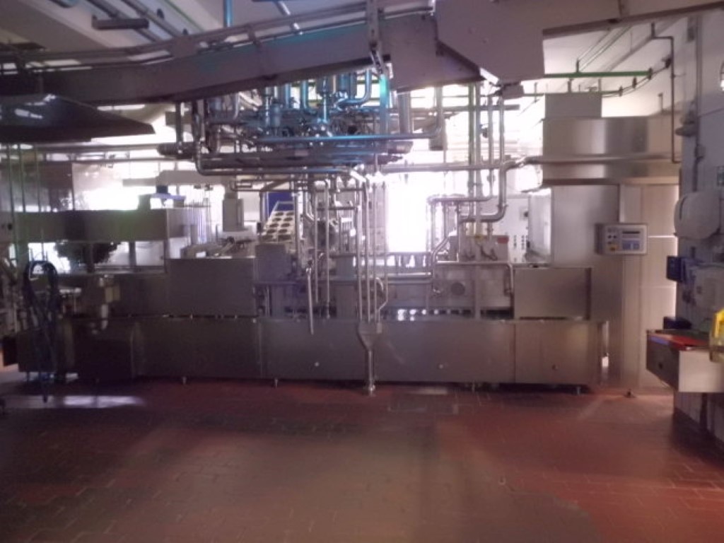 4 lines with full automatic cup infeed system (make: Sema, year 1999), Ultra clean with steam and peroxide (H2O2)injection on cups and UV light on the seals, sterile air system with ultra-filter (with steam lock), sealing and snap cap. CIP cleanable,. Infeed valves with aseptic valve cluster (steam lock, make: Aseptomag). Balance tank and CIP return pump. Automaticpacker 3x4 in a tray (or 2 trays of 6 cups). With conveyor for trays. Including control panel with cables cut, Volume 100-500ml / Ø 95mm, Capacity 5.000-9.600 cups/h depending on product