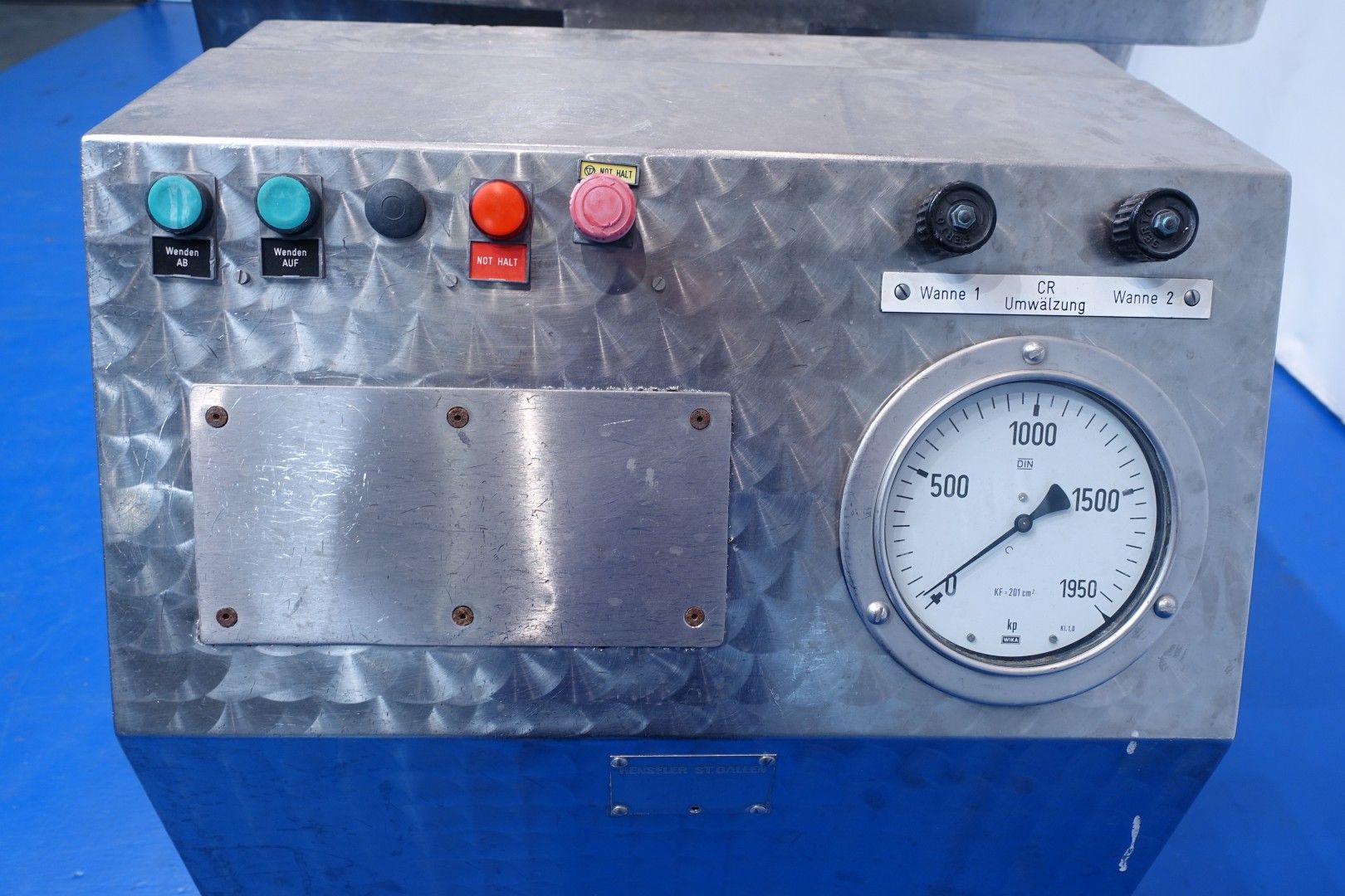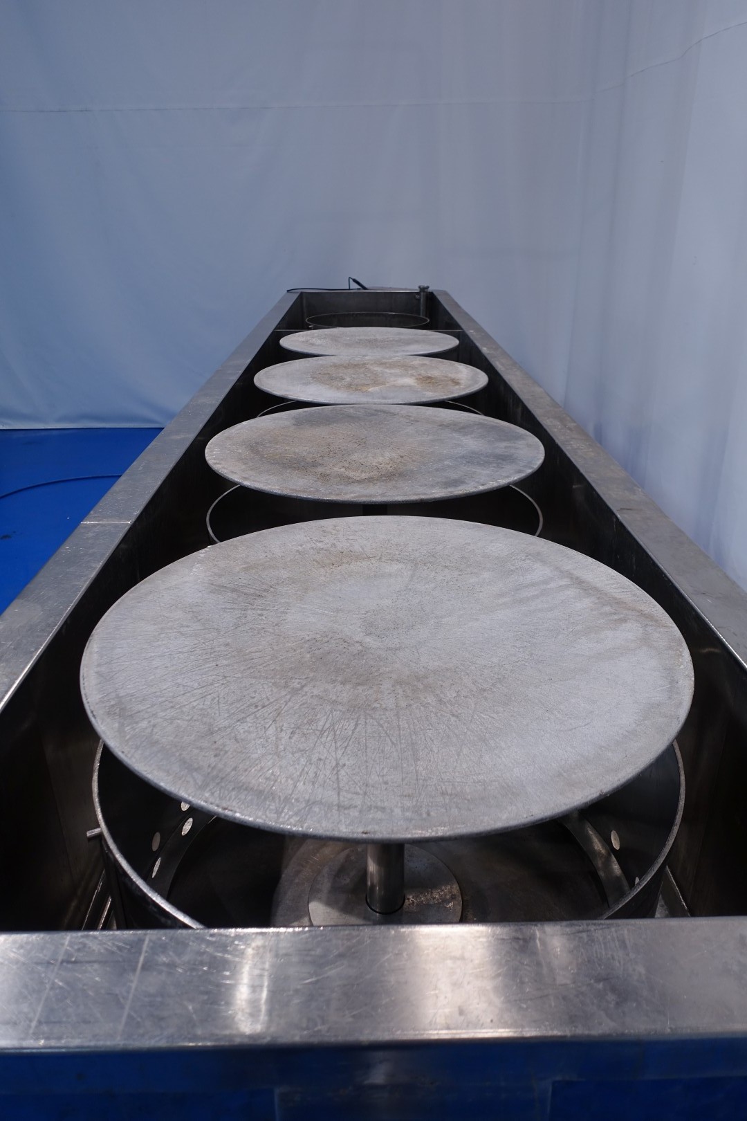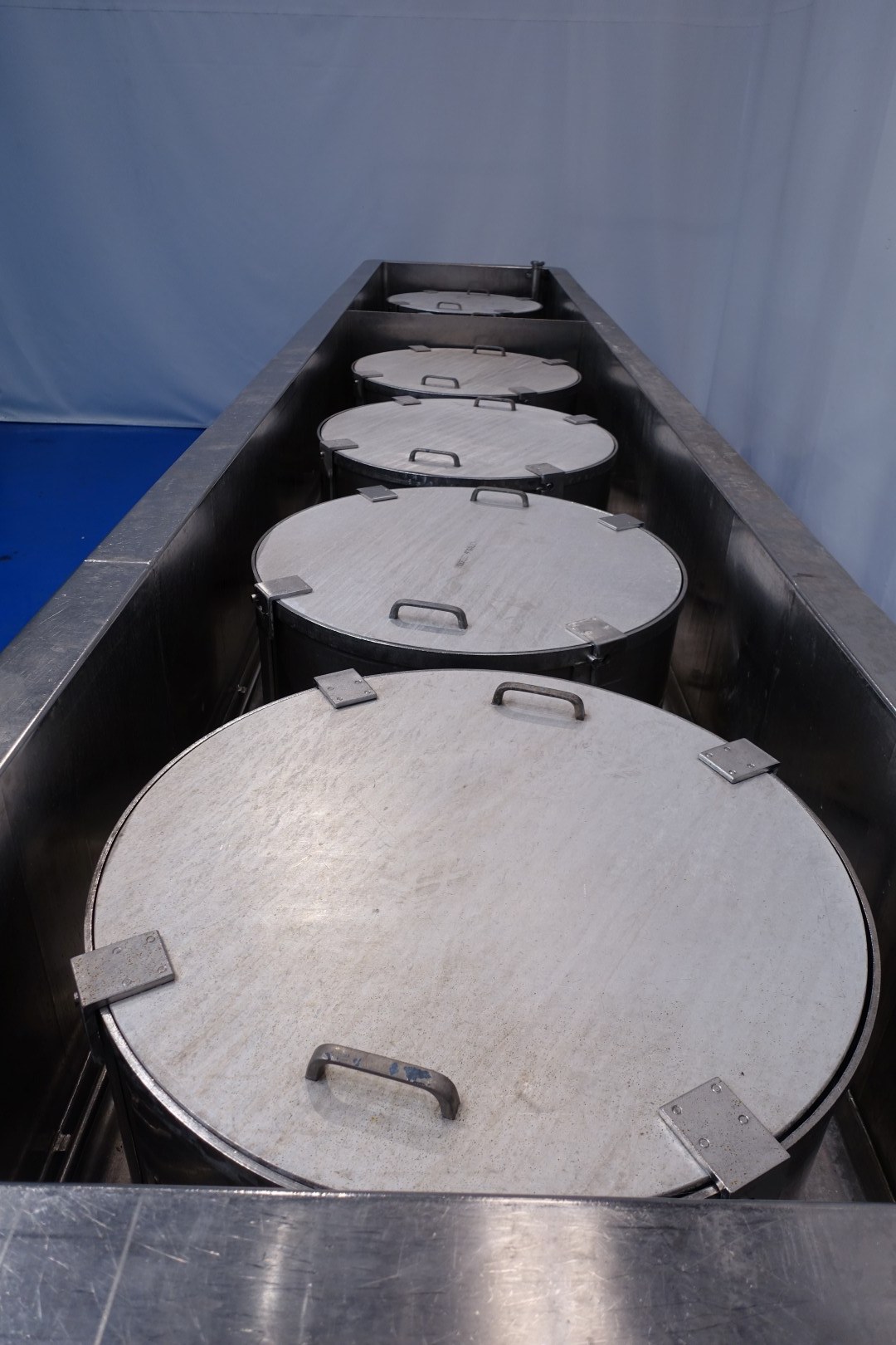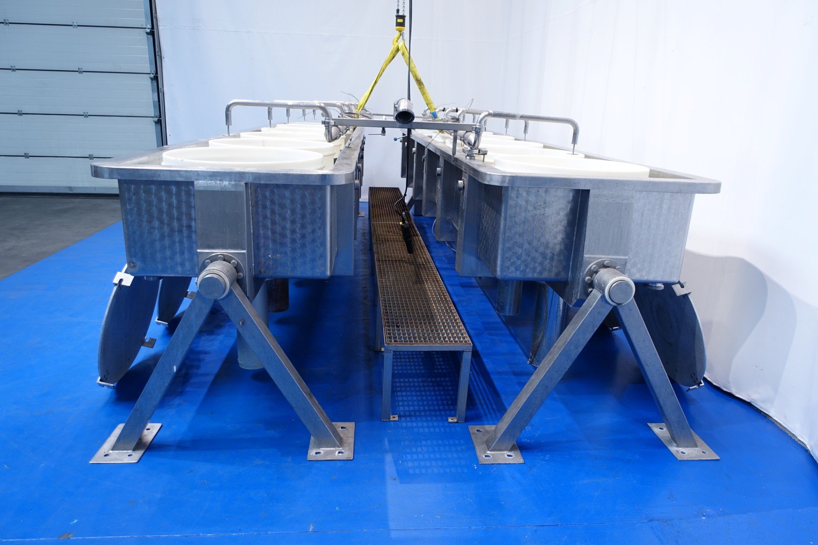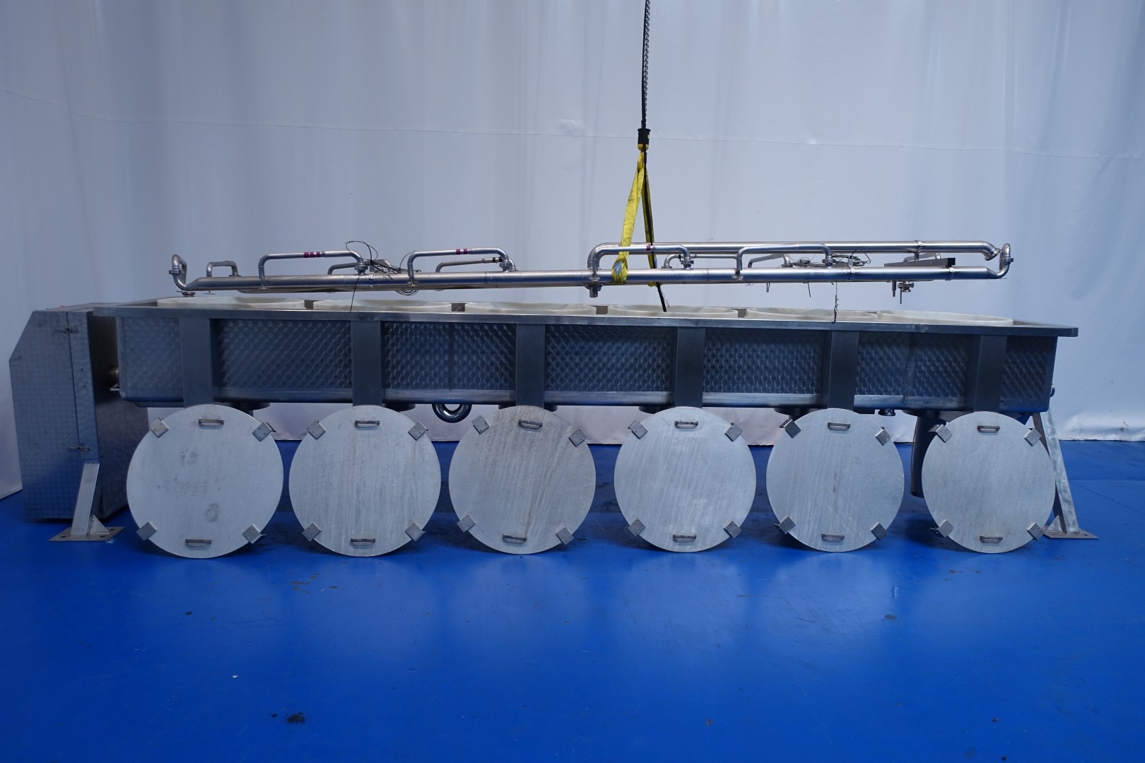 Pressing and moulding system for Big Round Cheeses. In this unit the curd is filled, in the moulds, drained and pressed. Used for production of Emmental cheeses Cylindric round model diameter 75cm. The entire press can be rotated to take out the cheeses. Suitable for 6 cheeses, with pressing cilinders, each with a cover which can be placed in a locked position. Each cilinder has a control button with 3 positions: pressing (up), neutral and release (down). Inner dimension of Cylindric press-mould: diameter 75cm Total height of mould: 32 cm after pressing up to 20cm weight per cheese: 60/85kg. Connections: 1 x 2" Din - 1 x 2,5" Din and 1 x 3" Din. Worked previously as a set with stocknumber 15793, including filling system and framework. Moulds (stocknumber 15762). Total dimensions: 610x110x122 (lxwxh) cm. - weight: 1.380 kg.