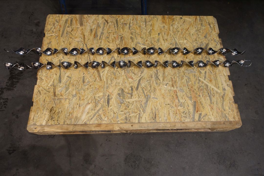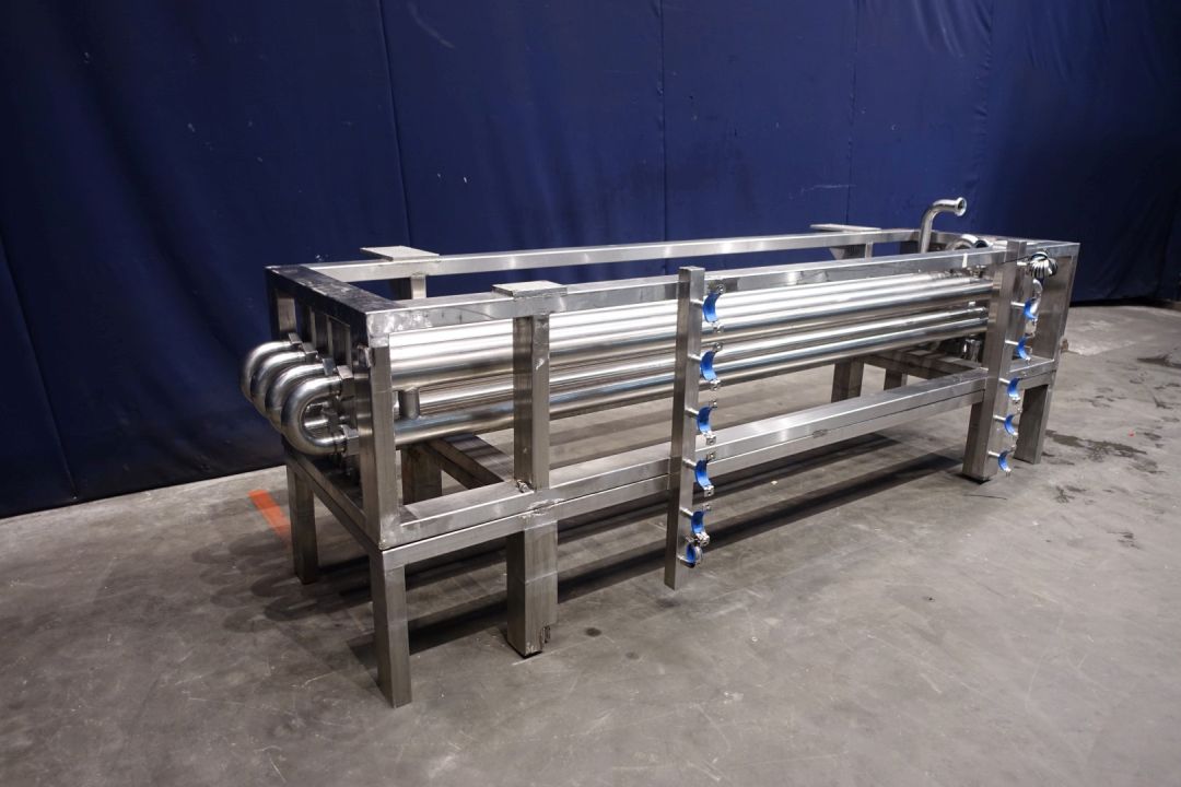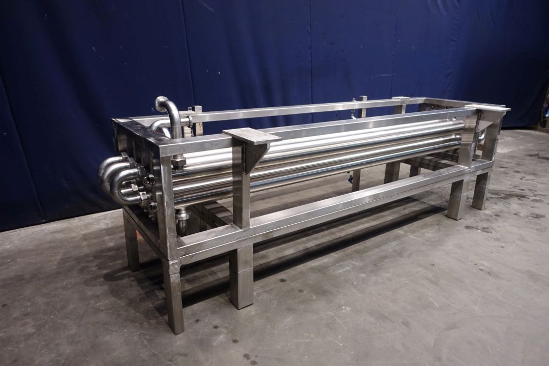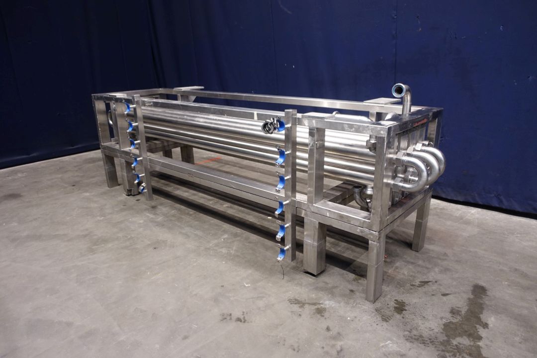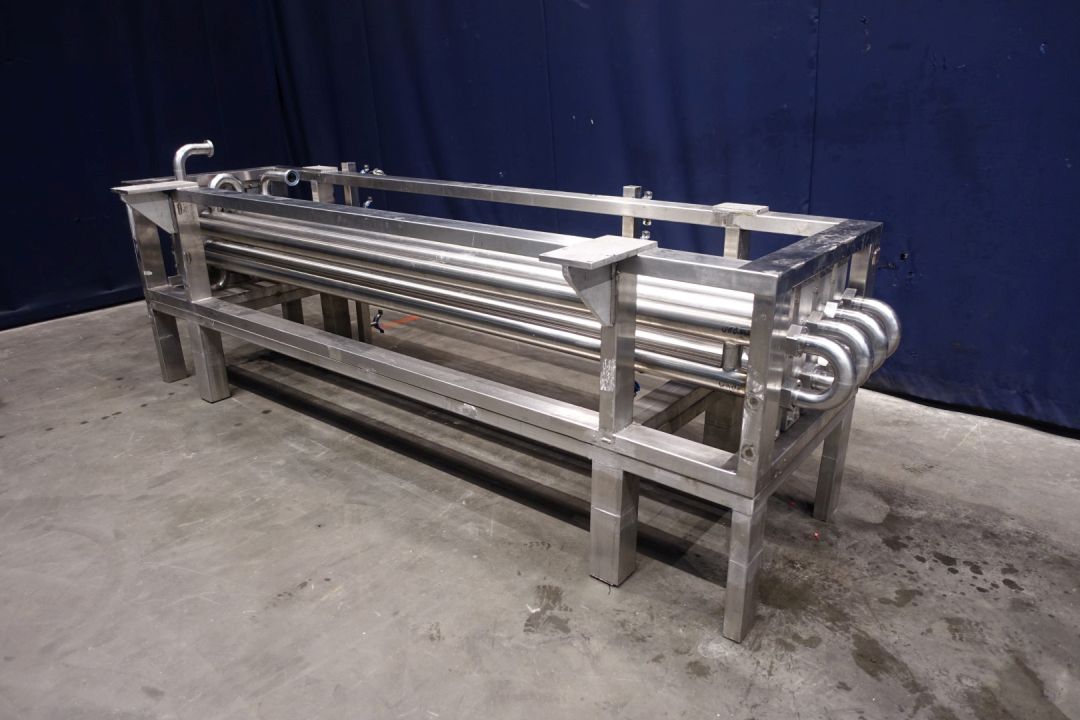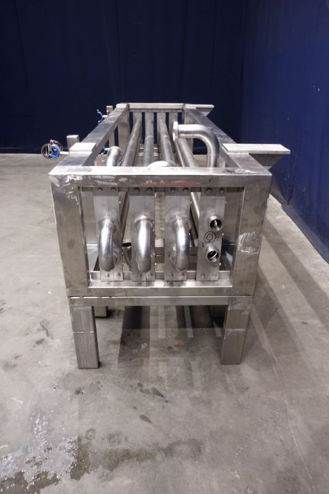 Tubular heat exchanger, sanitary (THE). Monotube, 1 compartment, Straight design, 8 tubes, 1 section. Length inner tube: 302 cm, length outer tube: 288 cm. Outer diameter 76 mm, inner diameter: 48 mm. Connection: product 2 x 48 mm SMS, Service 2 x 2,5" DIN, including bends, Stainless steel frame. 8 Tubes fitted with static mixers - by swirls shapped inner part. Total dimensions: 334 x 115 x 116 cm. Weigth 415 kg. Has been tested under 5 Bar pressure for 24 hours. Ideal for viscose products mixing and heating.