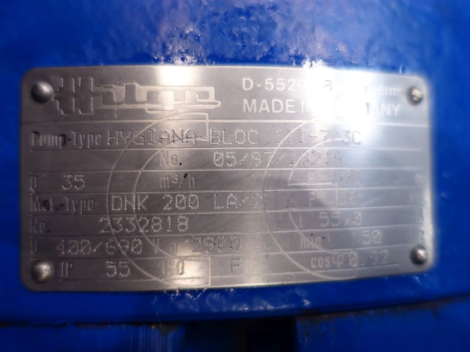 Sanitary centrifugal pump. Current motor: 30 kW - 55 A - 2900 rpm. 3 Stages. High pressure. Impellor diameter: 180 mm. Flushed seal. Connections: DN100 / DN80, DIN.